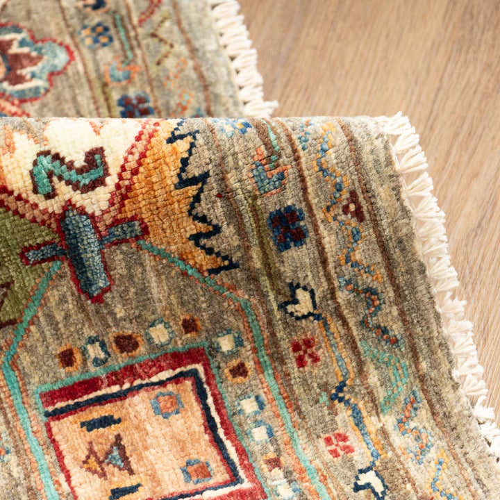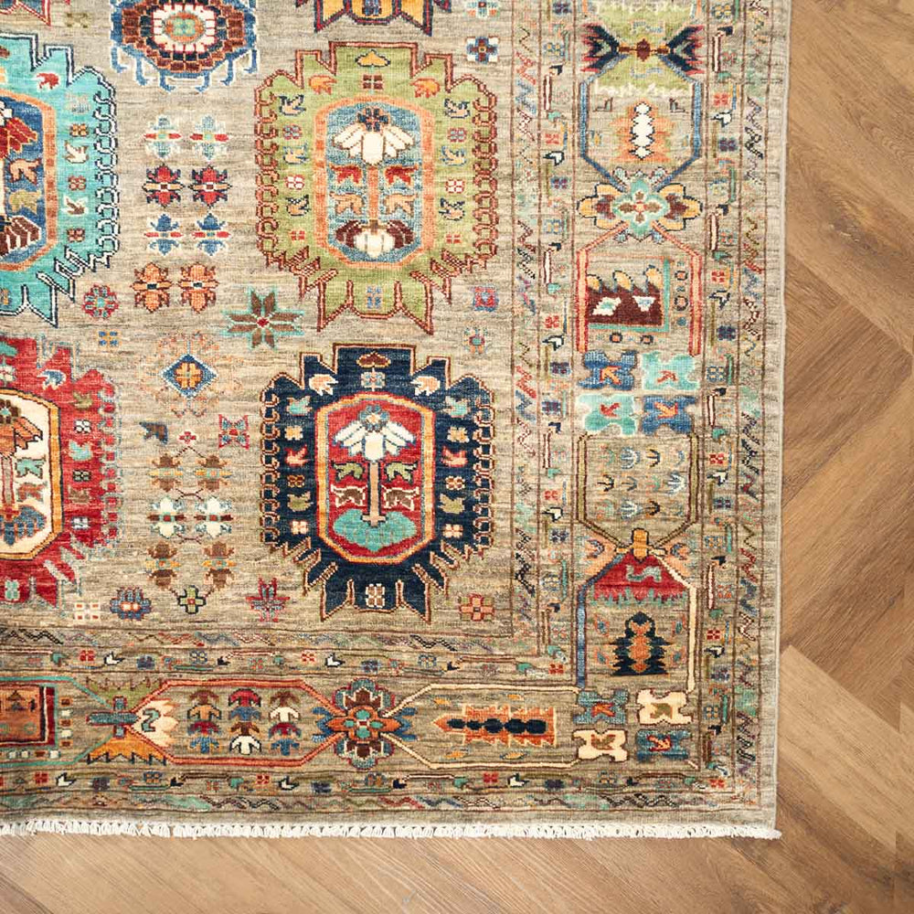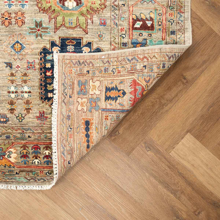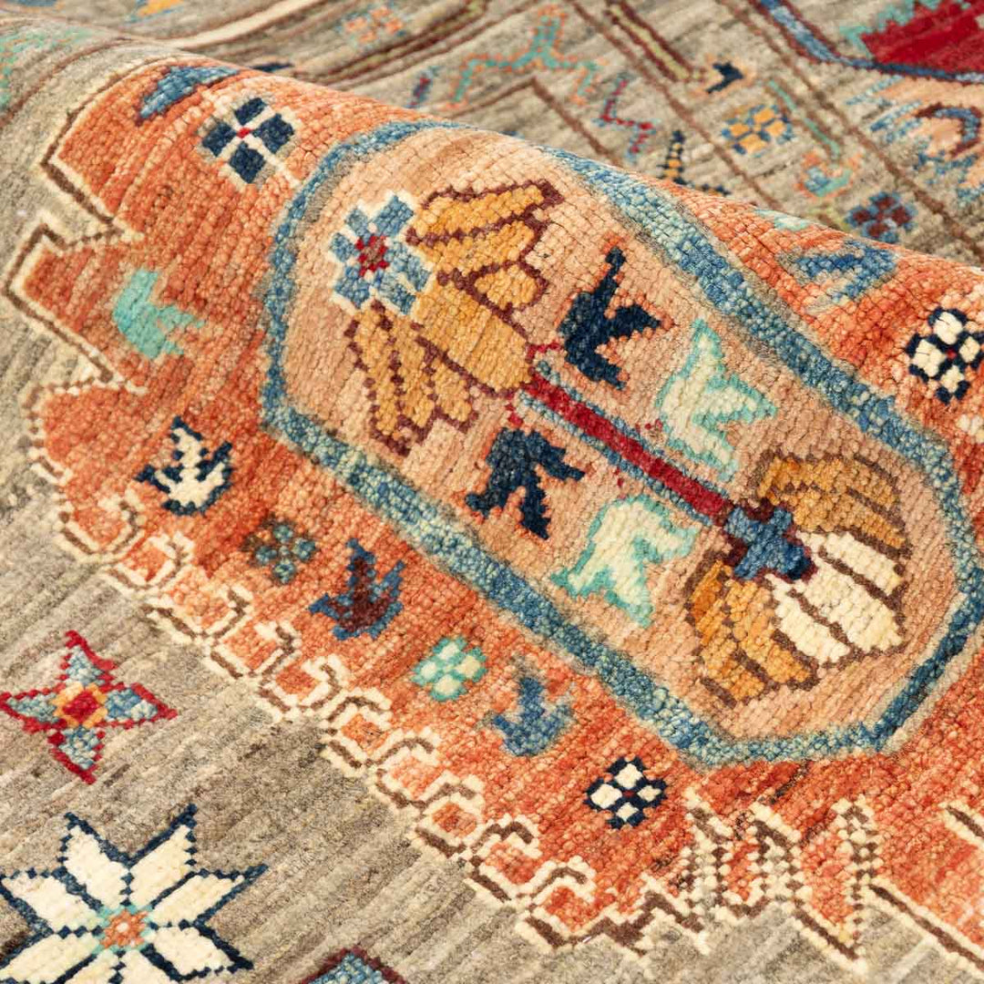 שטיח בעבודת יד המשלב דוגמאות שבטיות מסורתיות עם צבעים עשירים ואופי מזרח-קלאסי בולט. הדגם כולל תבליטים סמליים ועיטורים גאומטריים שמשדרים עומק, חום ואותנטיות.