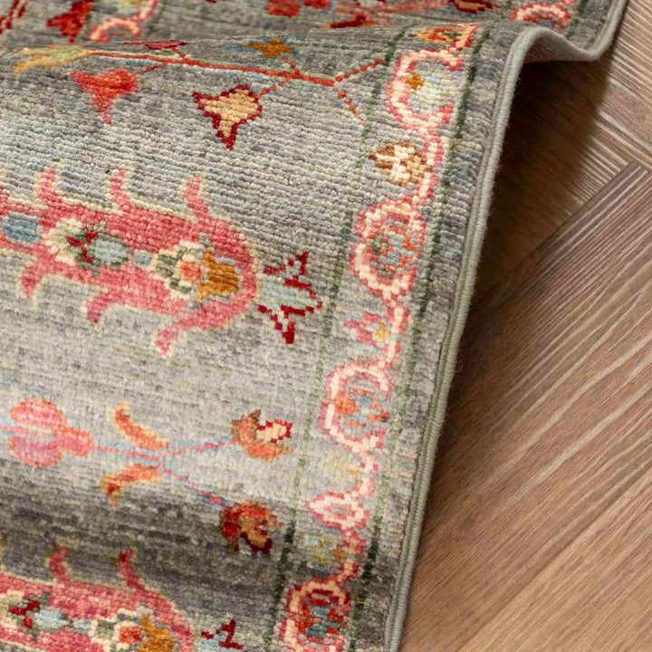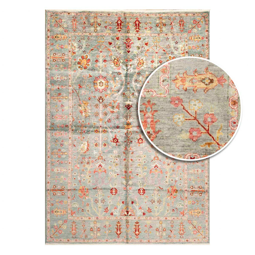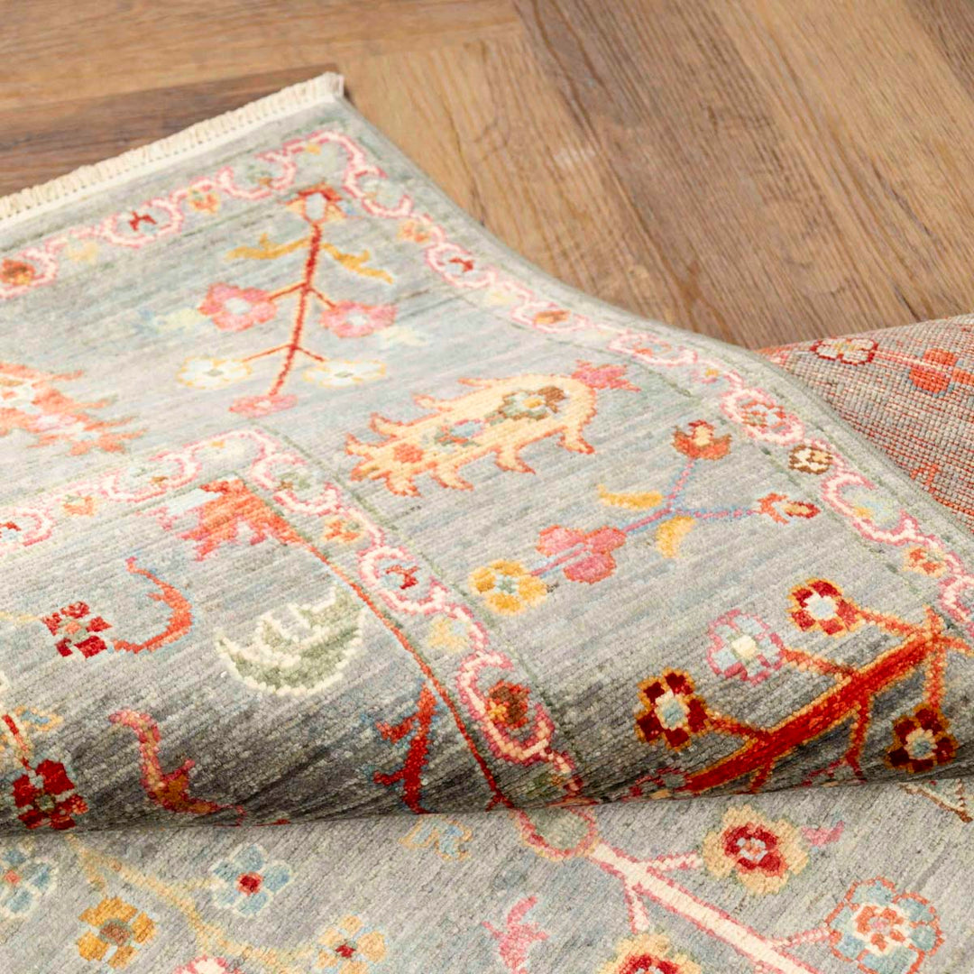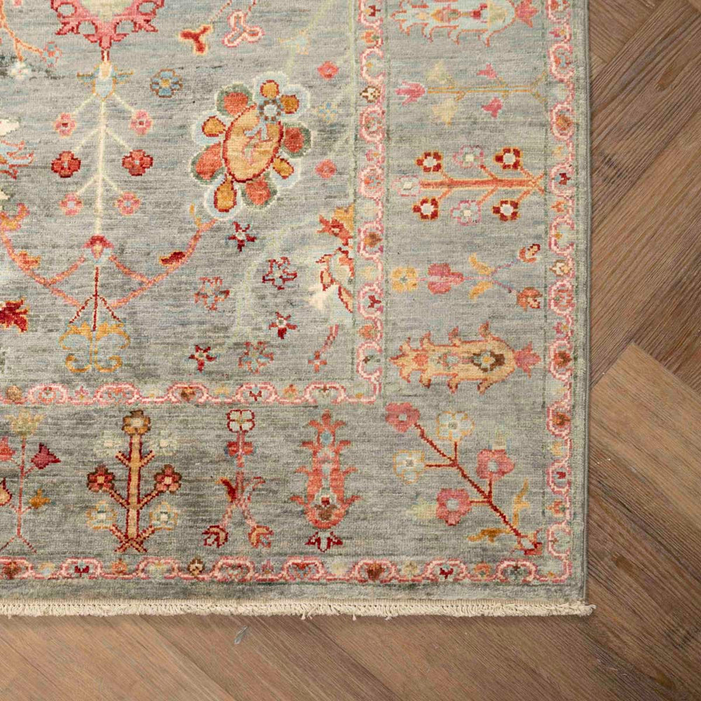 שטיח אריאנה בעבודת יד, בעל עיצוב פרחוני עדין וקלאסי, המשלב אומנות מסורתית עם צבעוניות רכה ומרגיעה. השילוב בין הרקע התכלכל לגוונים הוורודים, האפרסקיים והקרם יוצר שטיח אלגנטי וייחודי שמכניס תחושת אור ורעננות לחלל.