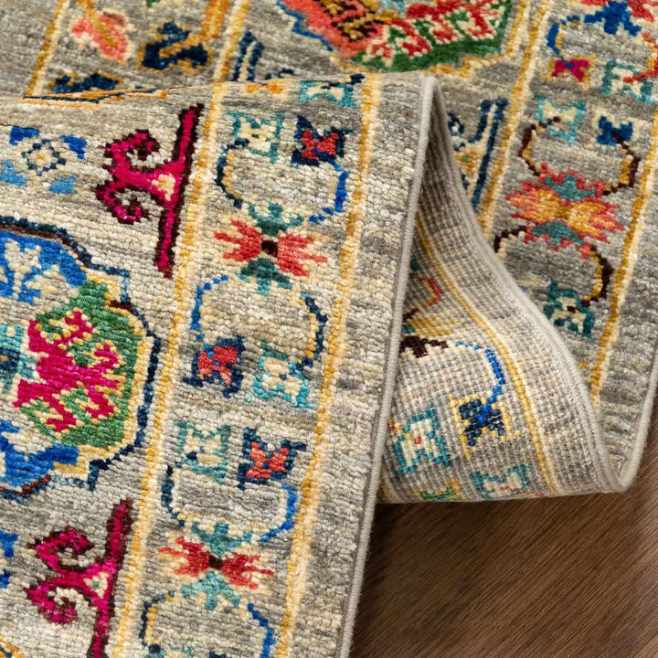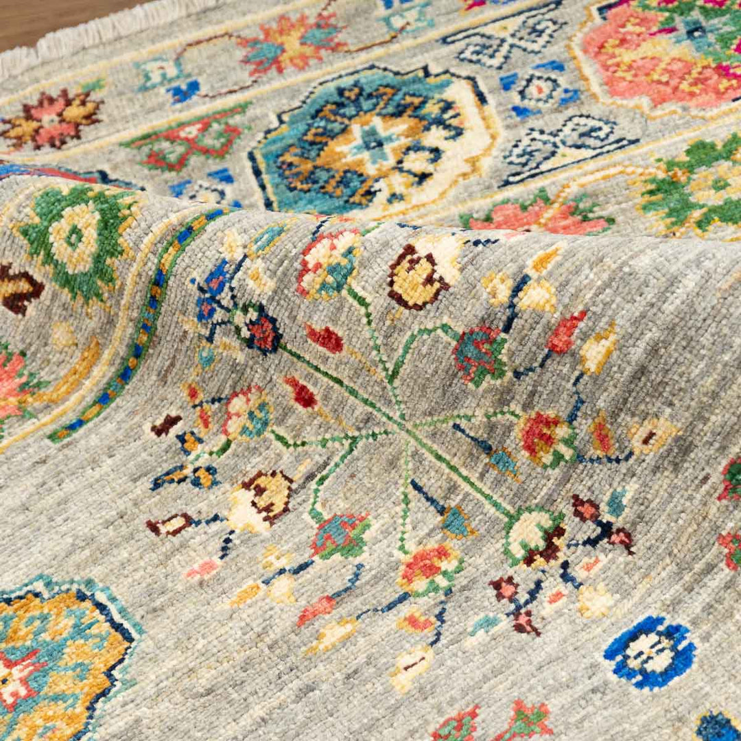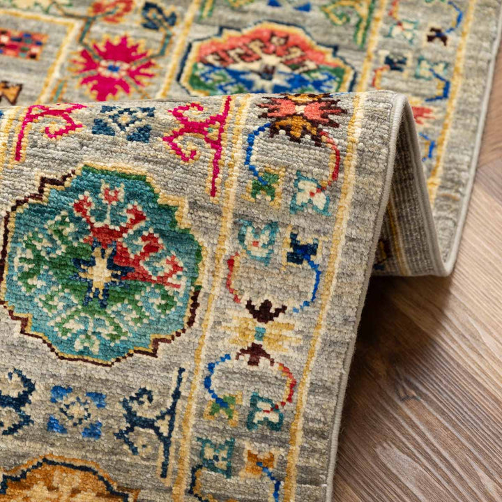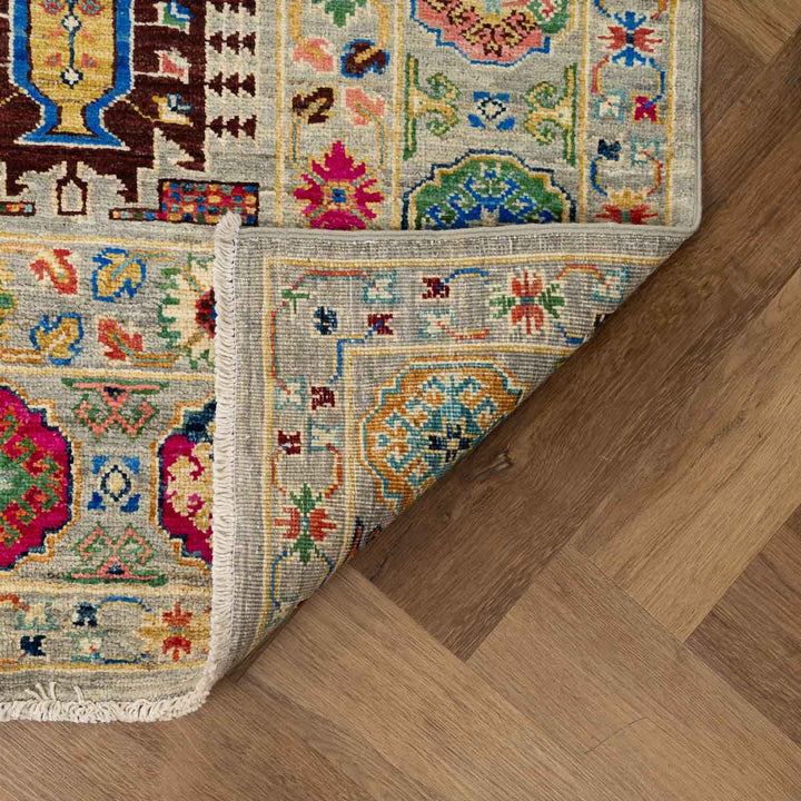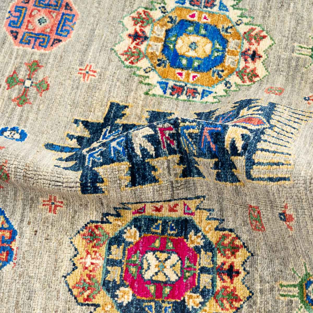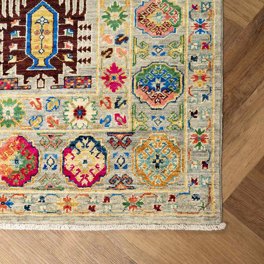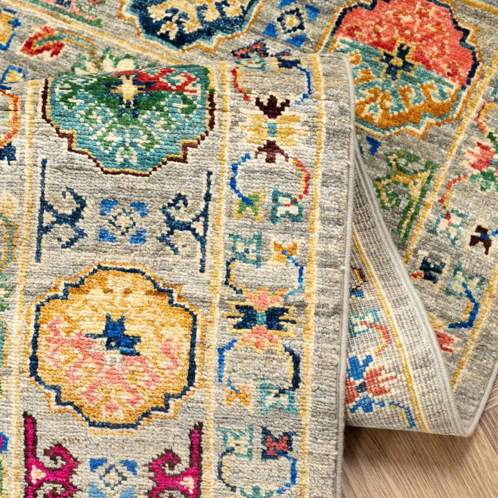 שטיח אריאנה מרהיב בעבודת יד עם עושר של צבעים ודוגמאות מסורתיות שמתחברות לעיצוב האוזבקי והטורקמני. הדפסים גאומטריים וסימבוליים משתלבים על רקע בגוון טבעי ומאוזן, ומקנים לשטיח מראה אותנטי ומלא חיים.