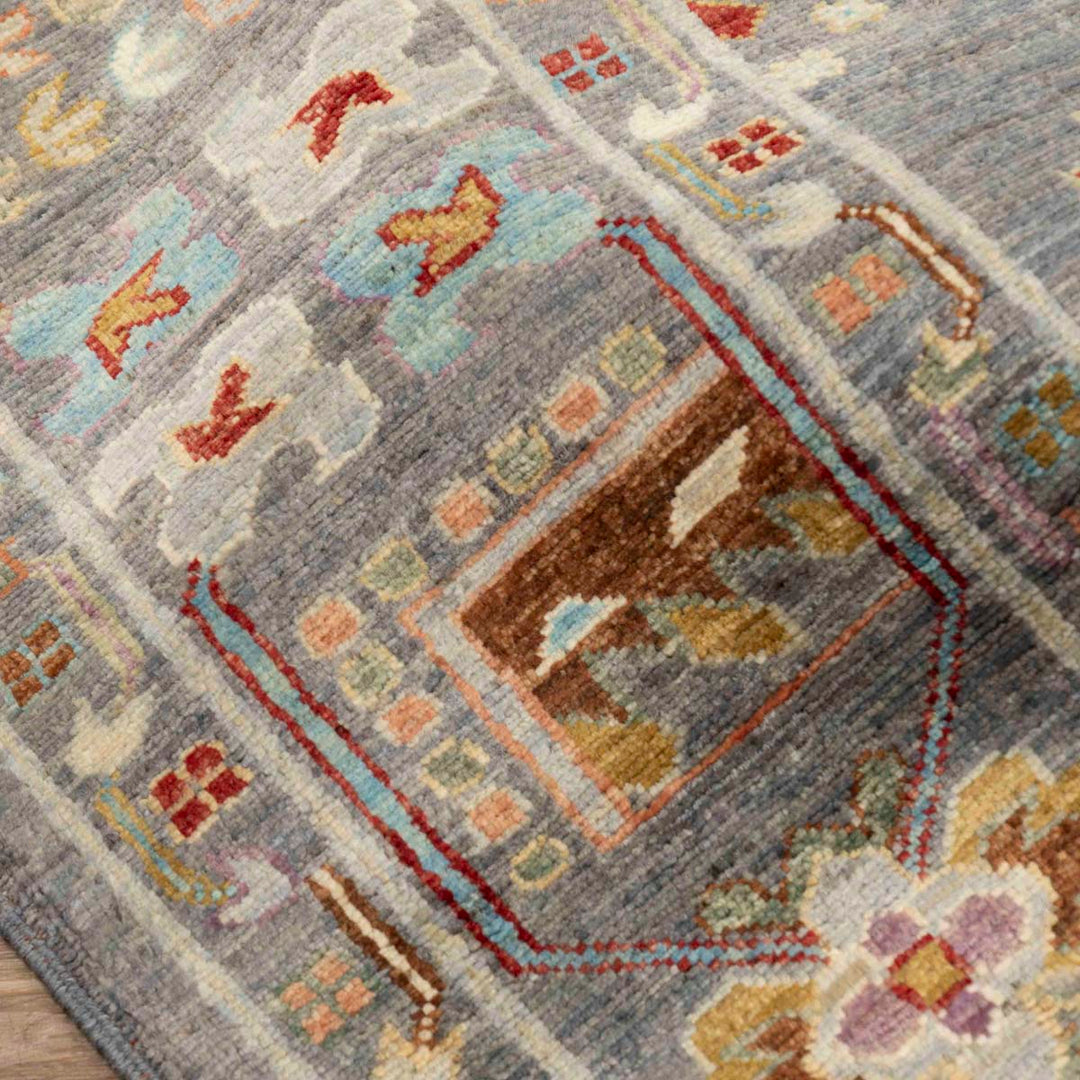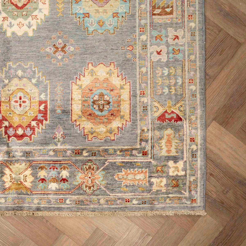 שטיח אריאנה בעבודת יד, עשוי צמר טבעי, בעל דוגמאות גיאומטריות גדולות המשלבות צבעים חמים ורכים על רקע אפור-כחלחל מעושן. השטיח משדר יוקרה, אלגנטיות ותחכום, ומתאים להכניס עומק ועושר עיצובי לכל חלל.