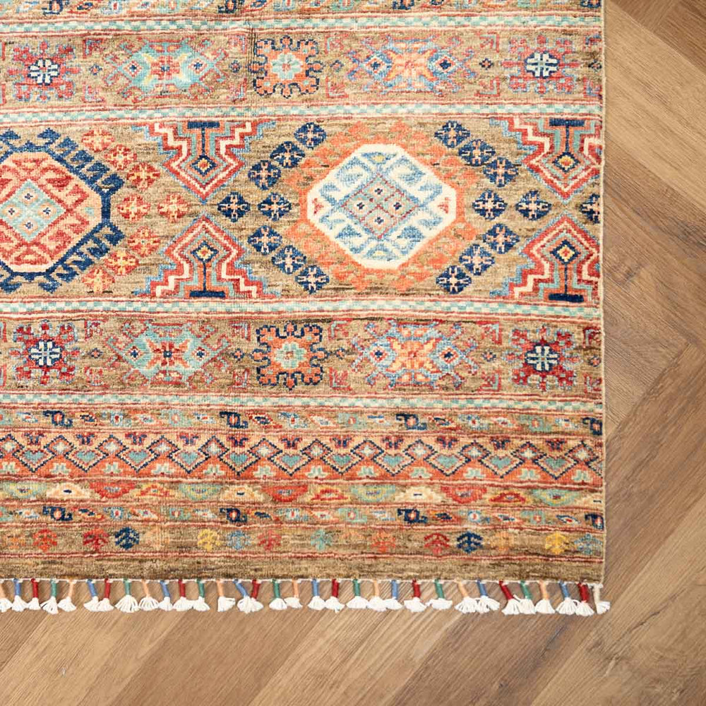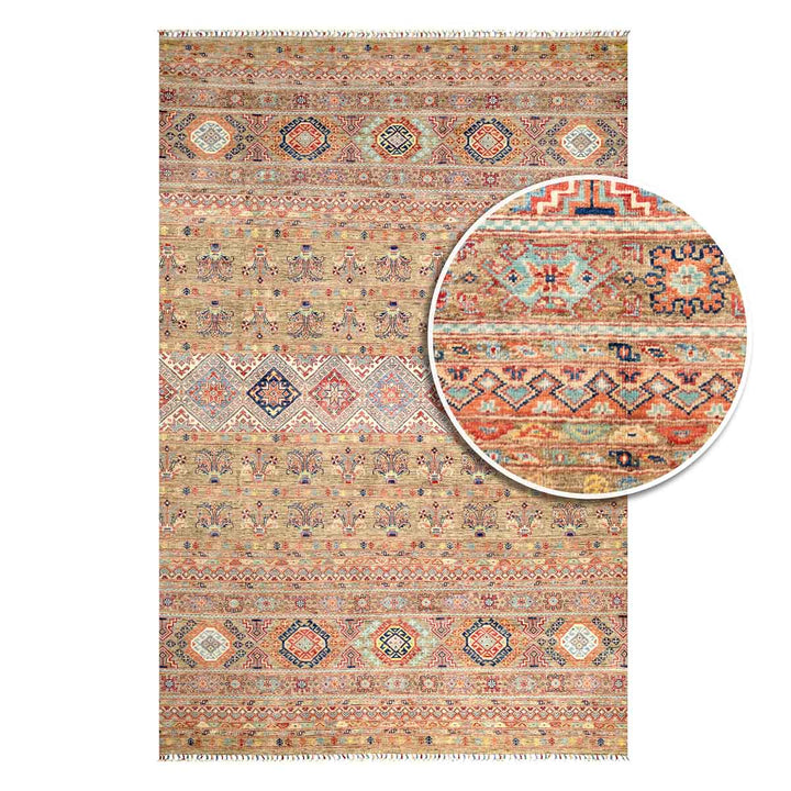 שטיח אריאנה צבעוני זה הוא חגיגה של תרבות, צבע ודפוסים שבטיים מסורתיים. הוא משלב קומפוזיציה מאוזנת של צורות גאומטריות, עיטורים אתניים ופרחים סמליים, על רקע בז’ חם שמעניק תחושת עומק וחמימות לחלל.