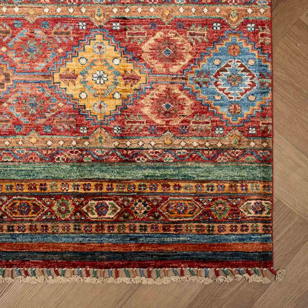שטיח ארוך בעיצוב שבטי עשיר בדוגמאות גיאומטריות קלאסיות, שנשזרו בקפידה בצבעים עמוקים של אדום, כחול, זהב וירוק. המרקם רך ונעים, והגוונים מעניקים לחלל תחושת חמימות אותנטית עם ניחוח מסורתי. אידיאלי למסדרונות, מבואות או חללים צרים שבהם רוצים להוסיף נוכחות מרשימה ואלגנטית.