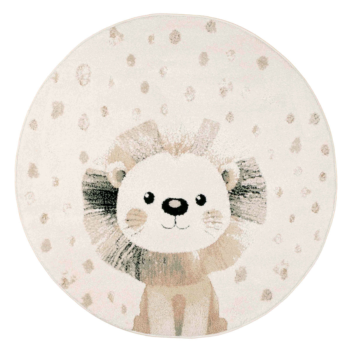 איור מינימליסטי של אריה מחויך במרכז השטיח, מוקף נקודות רכות המדמות כוכבים או פתיתי אור. הקומפוזיציה העגולה יוצרת תחושת זרימה ורוך, ומתאימה במיוחד לחללים קטנים ופינות משחק.