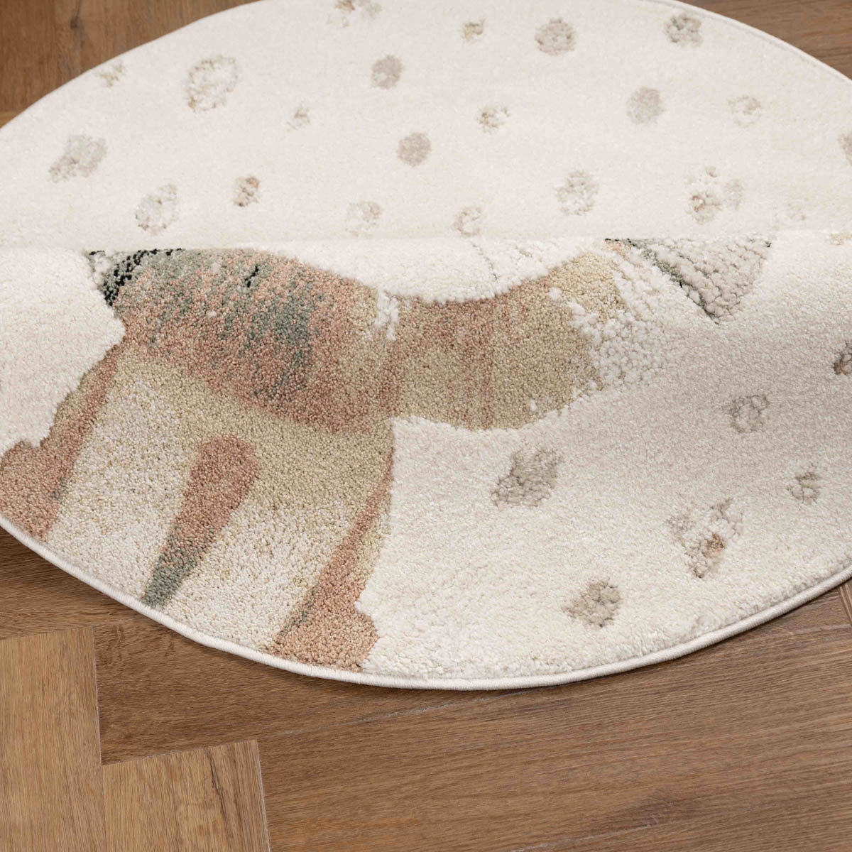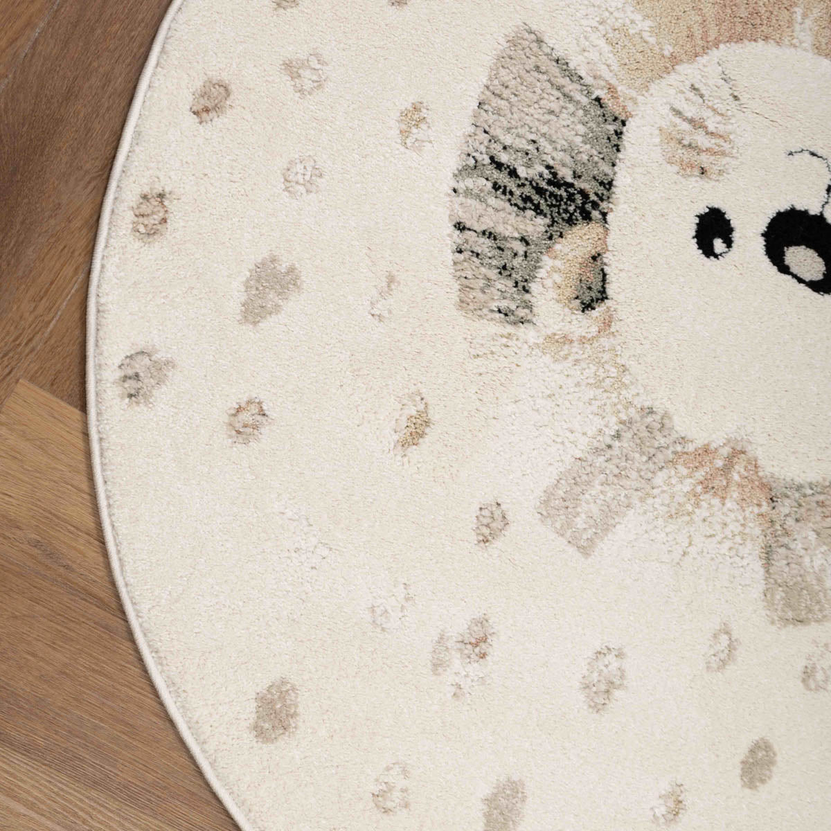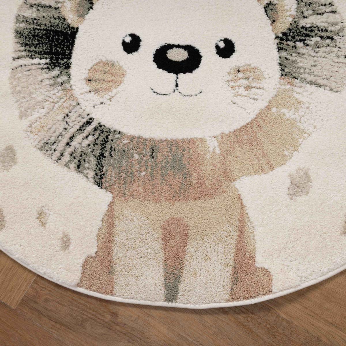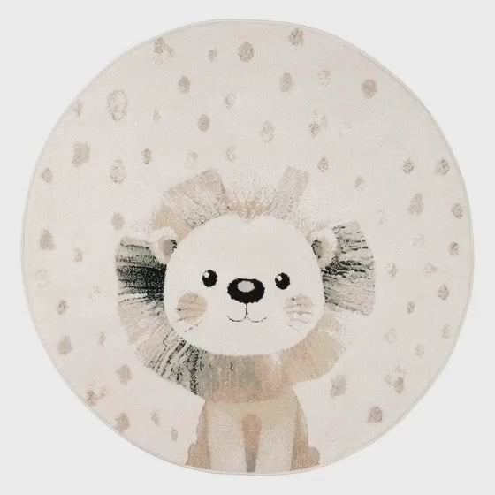 שטיח ילדים עגול ורך עם איור אריה מתוק ועדין. פריט שמכניס חמימות, רוגע ודמיון לחלל, בלי להעמיס ובלי רעש ויזואלי.