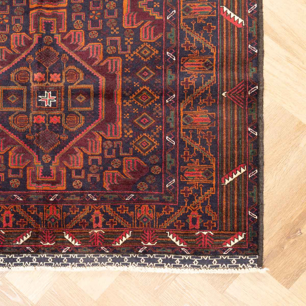 שטיח בעבודת יד מהאזור הבלוצ'י שבמזרח איראן, בעל עיצוב שבטי עז ונוכחות דרמטית. הגוונים האדמדמים והדפוסים הגאומטריים יוצרים מראה חם ועשיר שמכניס עומק לכל חלל.