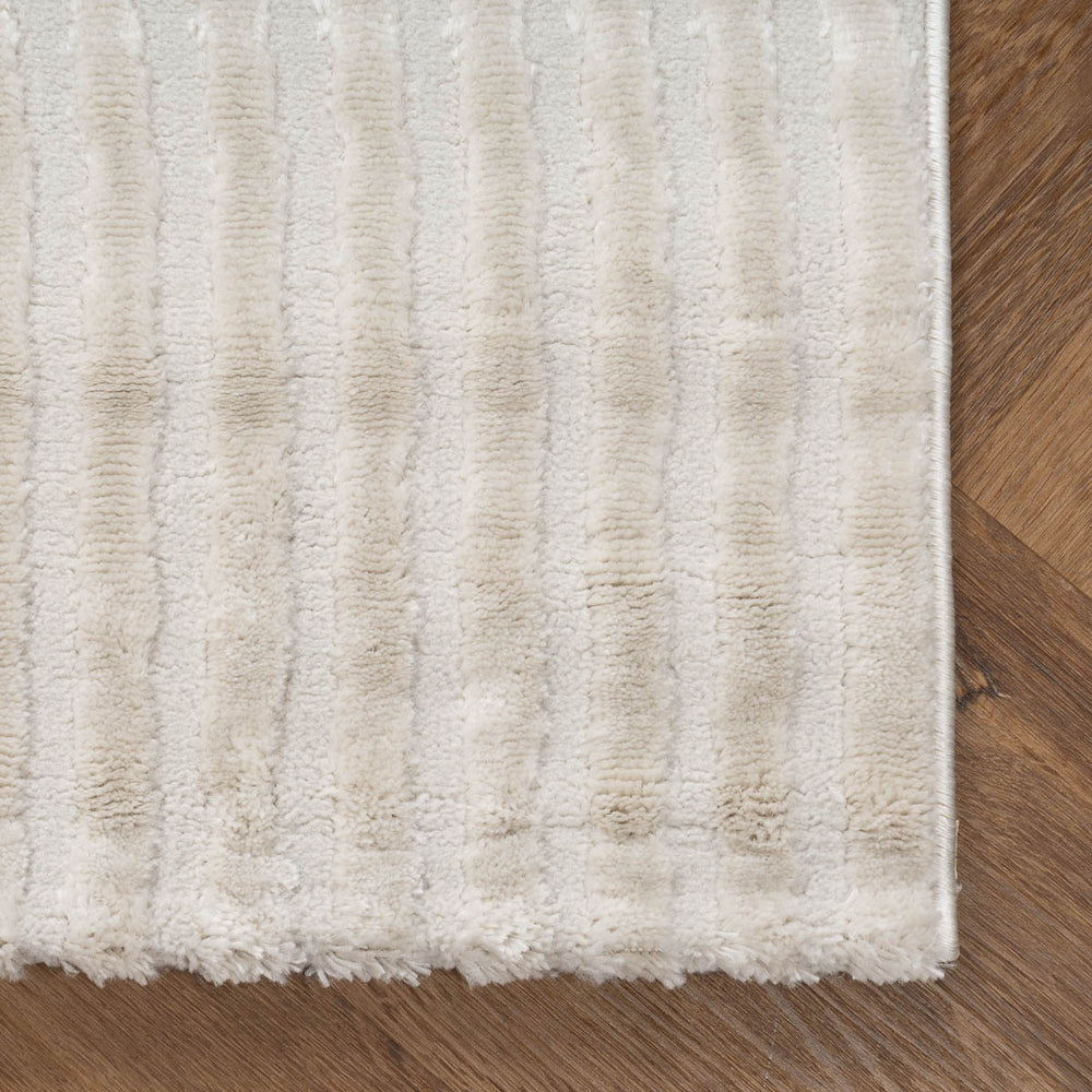 שטיח יוקרתי בסגנון מודרני-מינימליסטי, עם טקסטורת קווים חרוטים בצורת קשתות גיאומטריות סימטריות, על רקע בגוון בז' בהיר ונקי. זהו שטיח שמכניס תחכום בשקט – מבלי להשתלט על החלל.