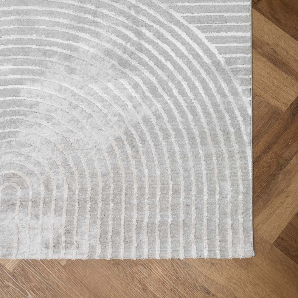 שטיח אלגנטי, בעל עיצוב מודרני עם דוגמת קווים וקשתות חרוטות, בגווני אפור בהיר נקיים. מושלם למי שמחפש איזון בין מראה מינימליסטי לבין טקסטורה שמוסיפה עומק וחומריות לחלל.
