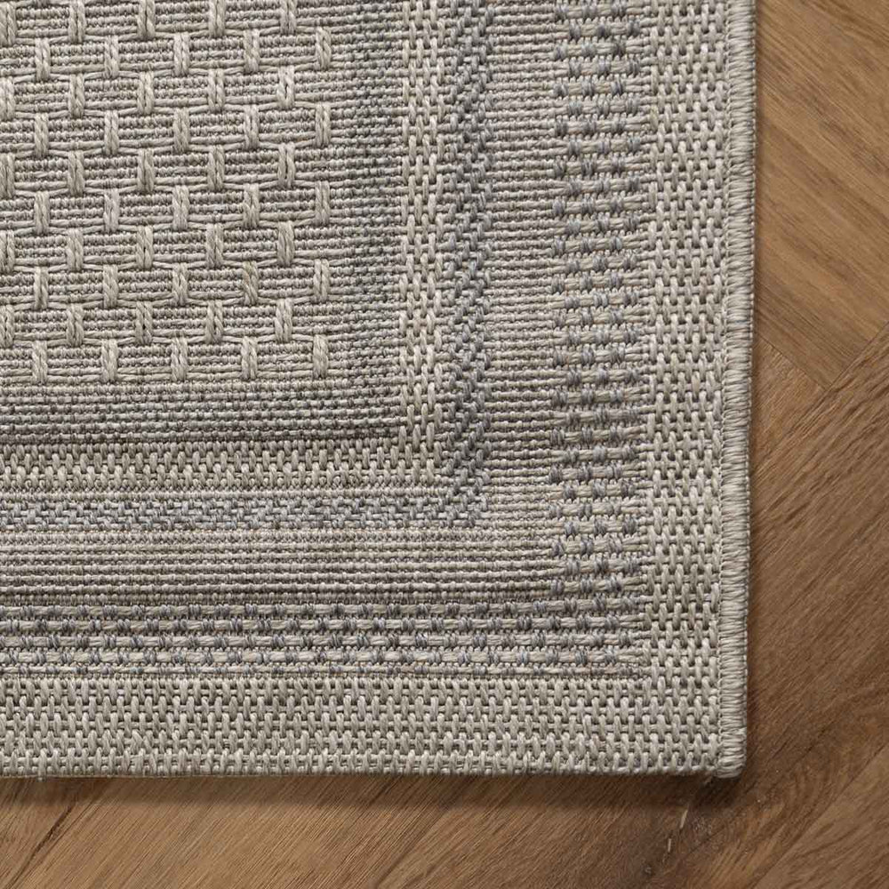 שטיח חוץ-פנים בגוון אפור עמוק, עם טקסטורת אריגה גאומטרית עדינה ומסגרת כפולה שמעניקה מראה מדויק ואסתטי. פתרון פרקטי ודקורטיבי לחללים עמוסים או חשופים.
