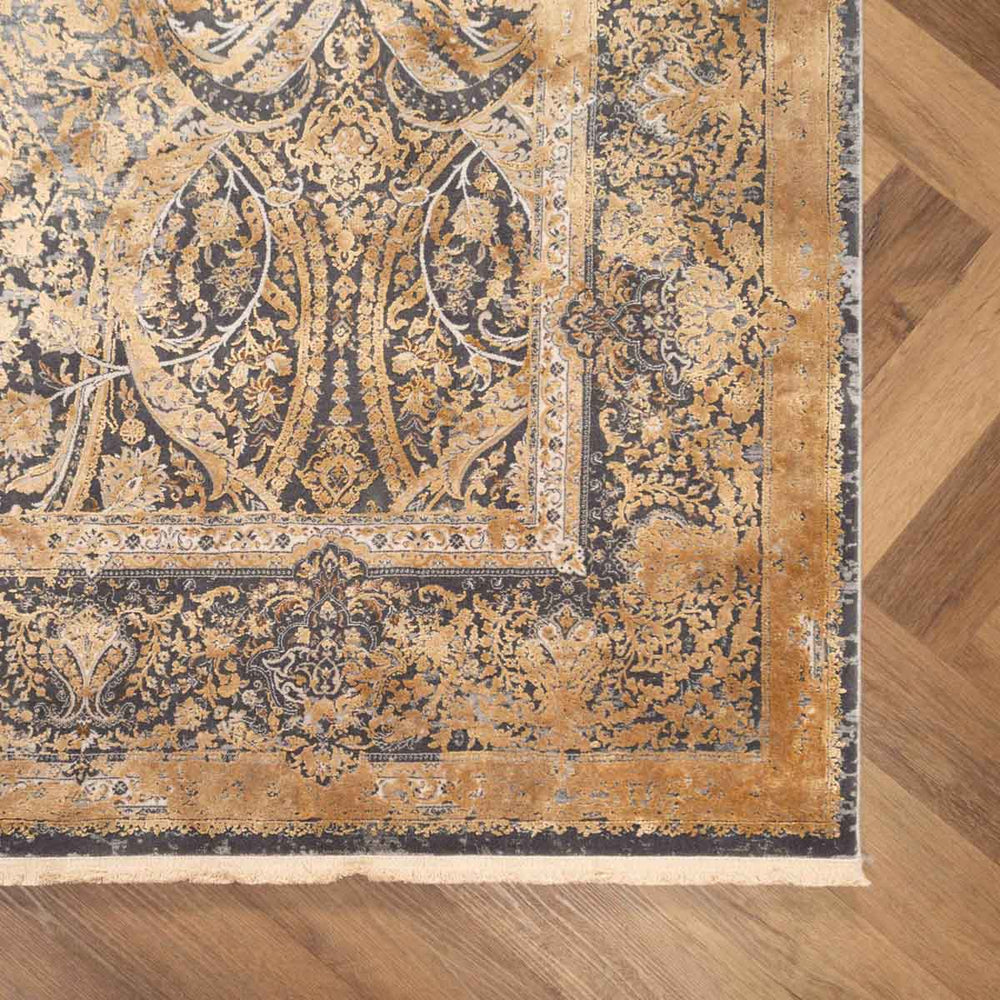 שטיח יוקרתי בסגנון קלאסי-פרסי עם נגיעות וינטאז' – בגווני כתום מעושן, אפור כהה וזהב עתיק, שמוסיפים עומק ותחושת אצילות לכל חלל.