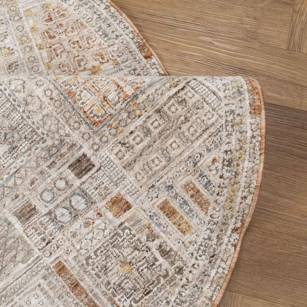 שטיח עגול בסגנון טקסטיל עתיק עם טוויסט מודרני. הדוגמה המדויקת והעשירה יוצרת מראה של פסיפס גאומטרי שנשחק בעדינות לאורך השנים, בגווני בז', חום קוניאק ונגיעות פסטל רכות.
