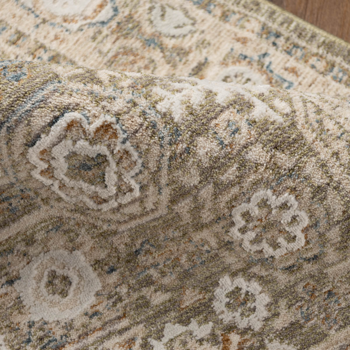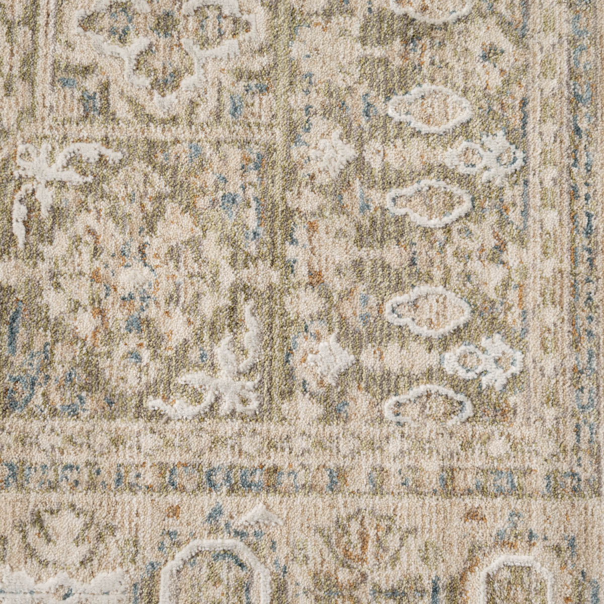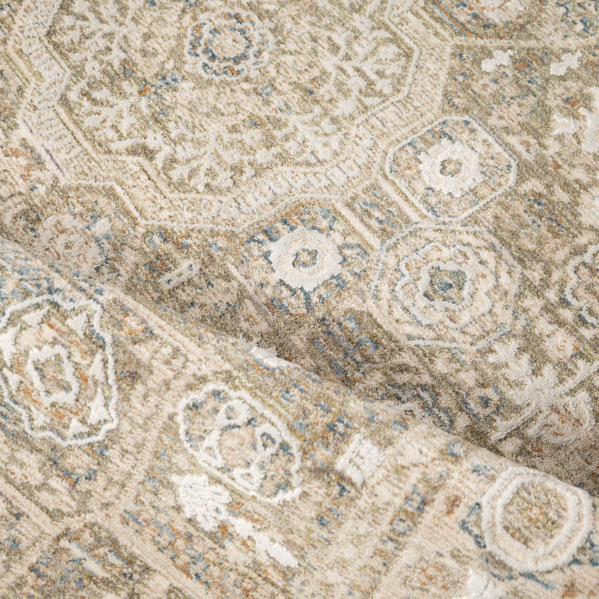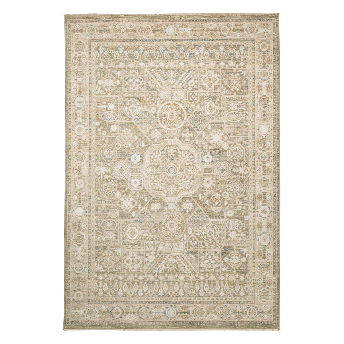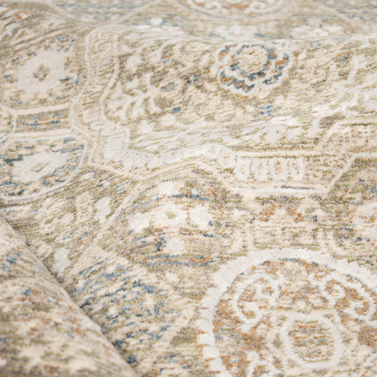 שטיח בסגנון קלאסי עדין שמשלב גווני ירוק, בז' ואפור ליצירת מראה רגוע, טבעי ומאיר חלל. הדוגמה המפורטת והמרקם הרך מעניקים תחושה חמימה ונעימה ומתאימים כמעט לכל סגנון עיצוב.