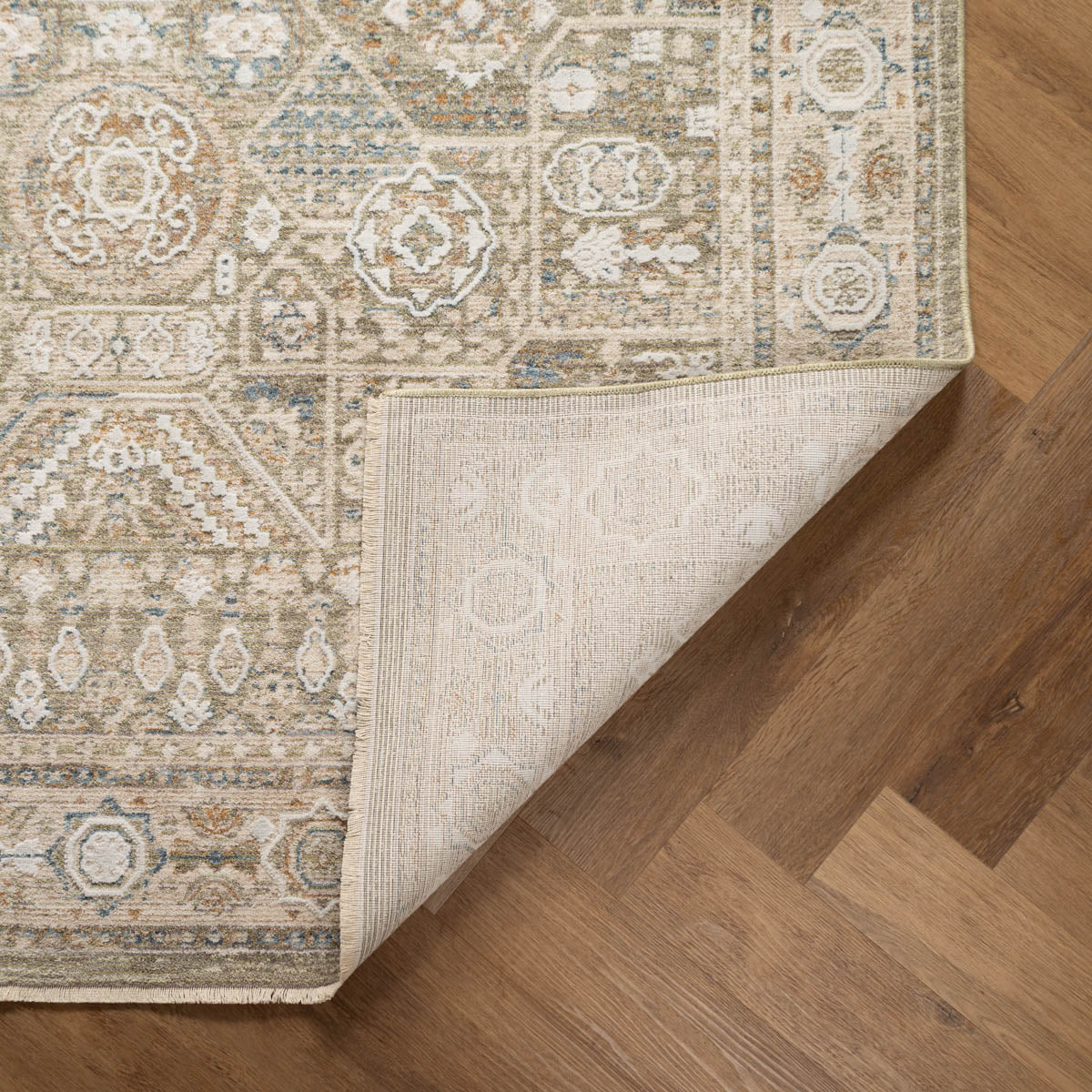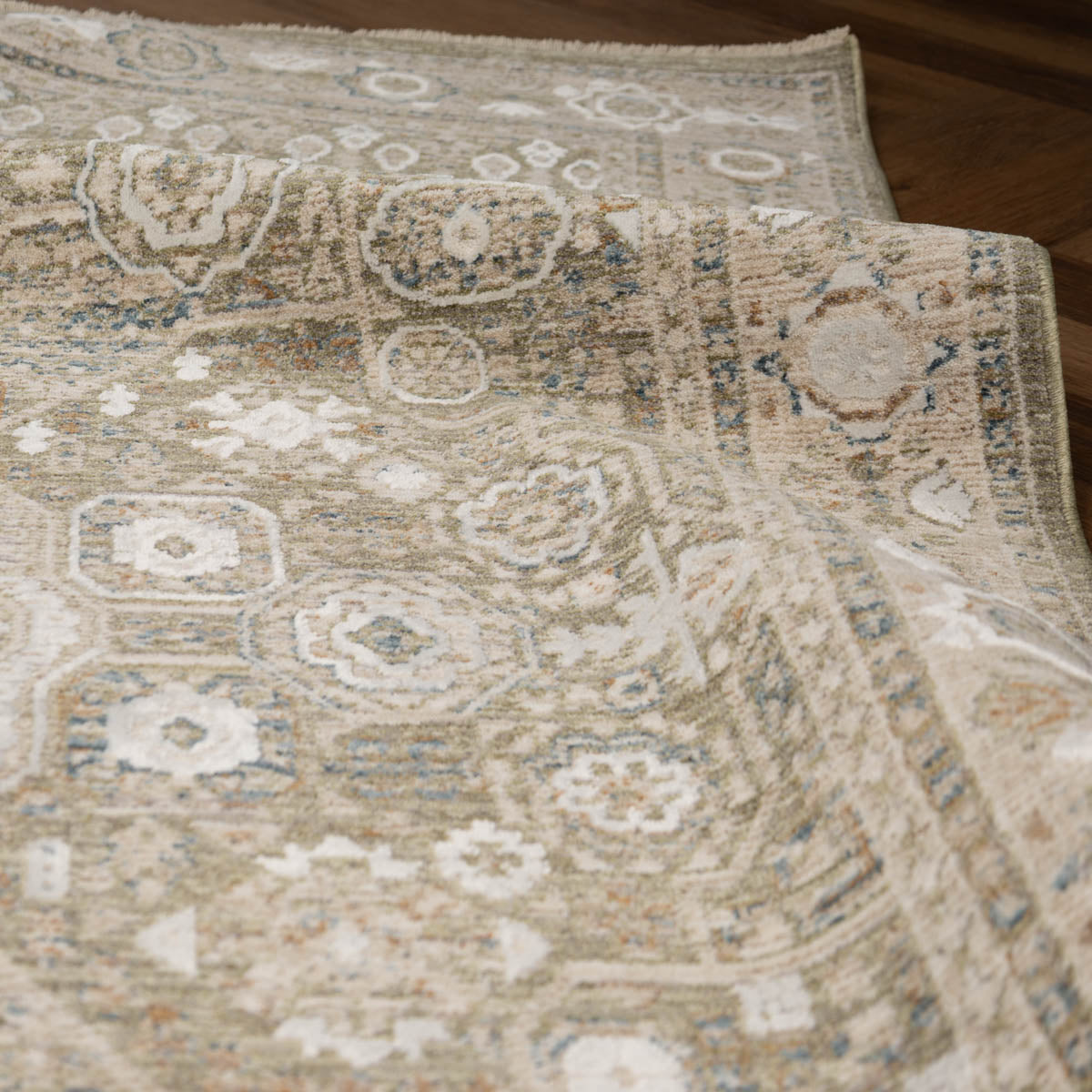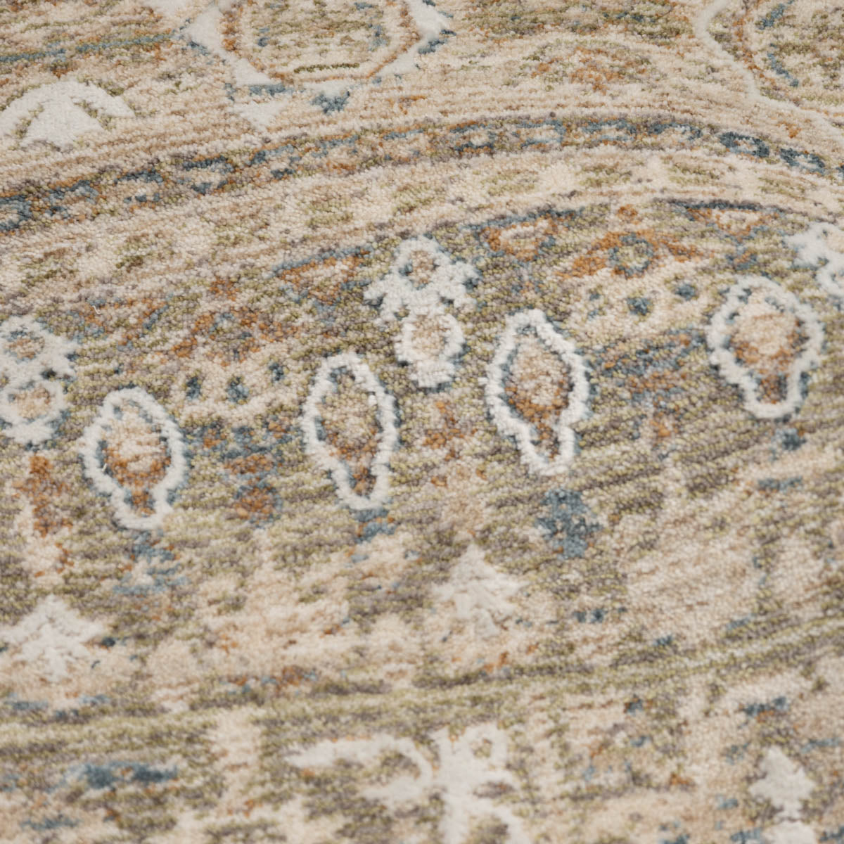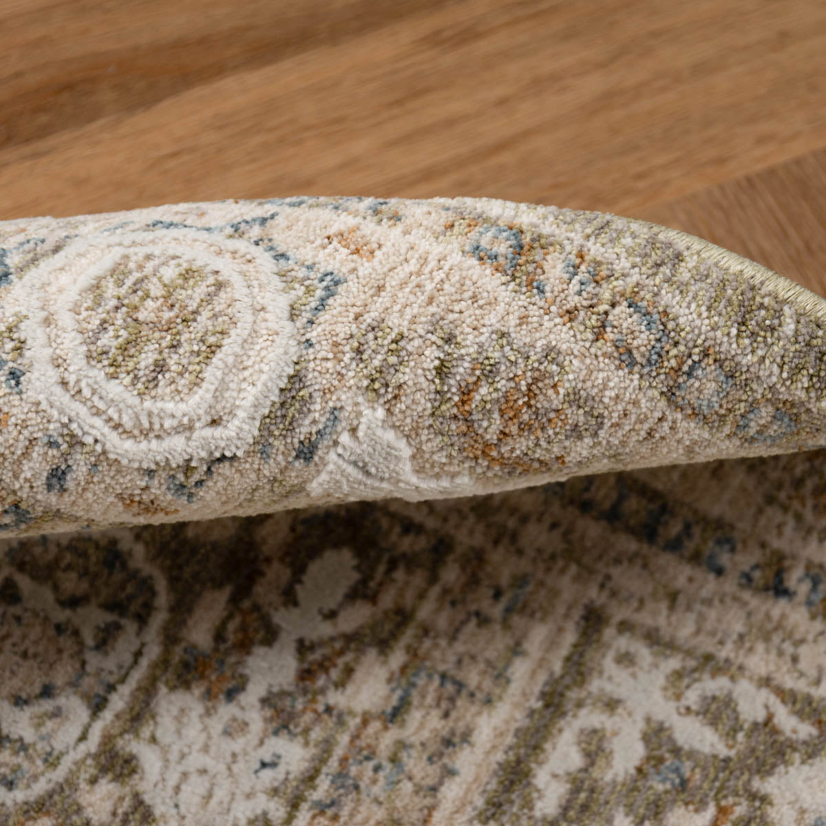 שטיח בסגנון קלאסי עדין שמשלב גווני ירוק, בז' ואפור ליצירת מראה רגוע, טבעי ומאיר חלל. הדוגמה המפורטת והמרקם הרך מעניקים תחושה חמימה ונעימה ומתאימים כמעט לכל סגנון עיצוב.