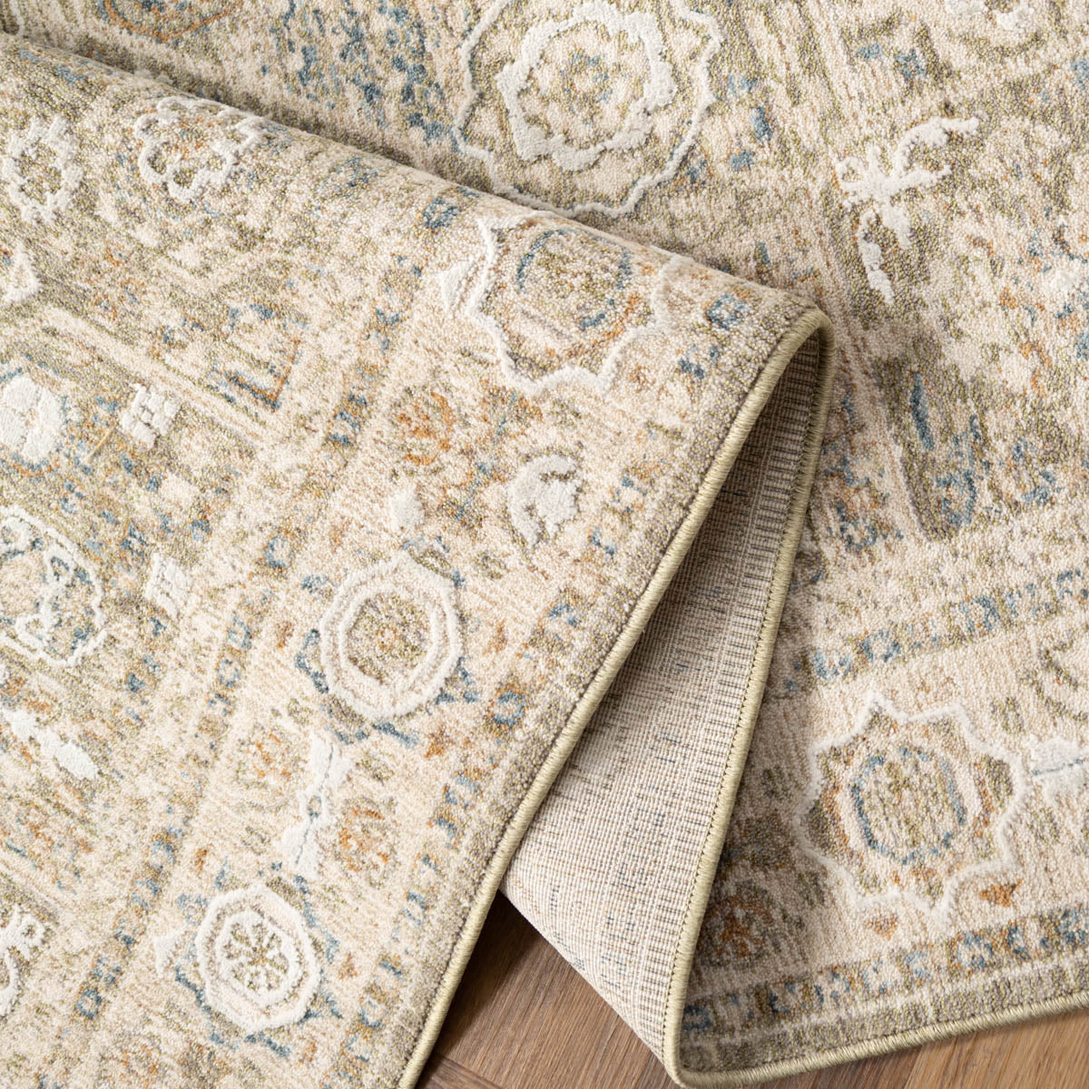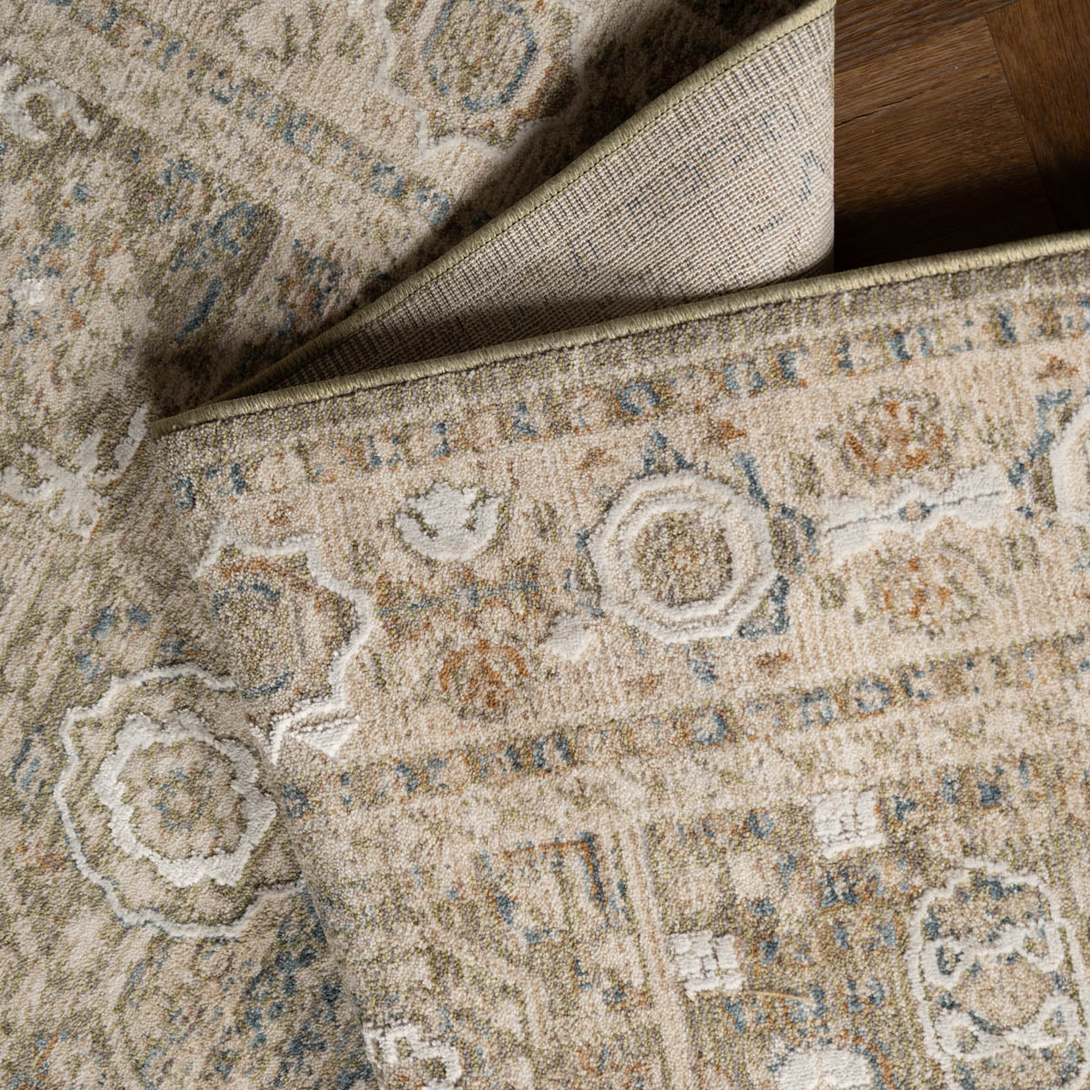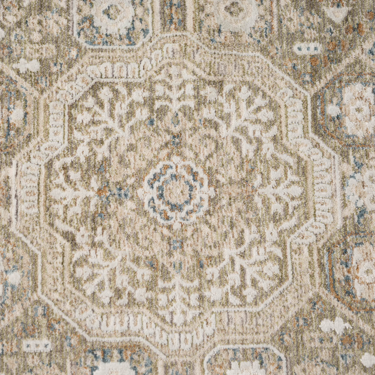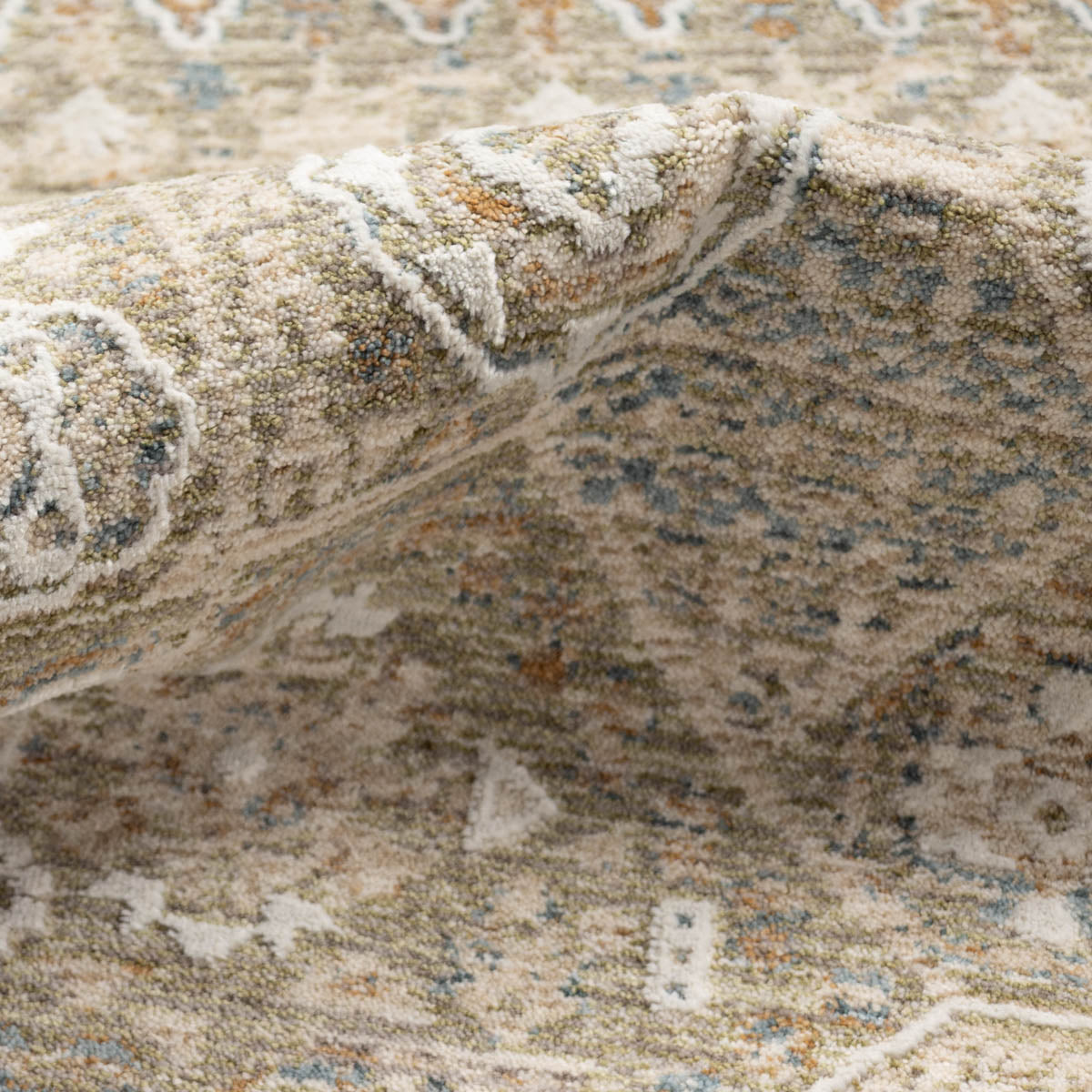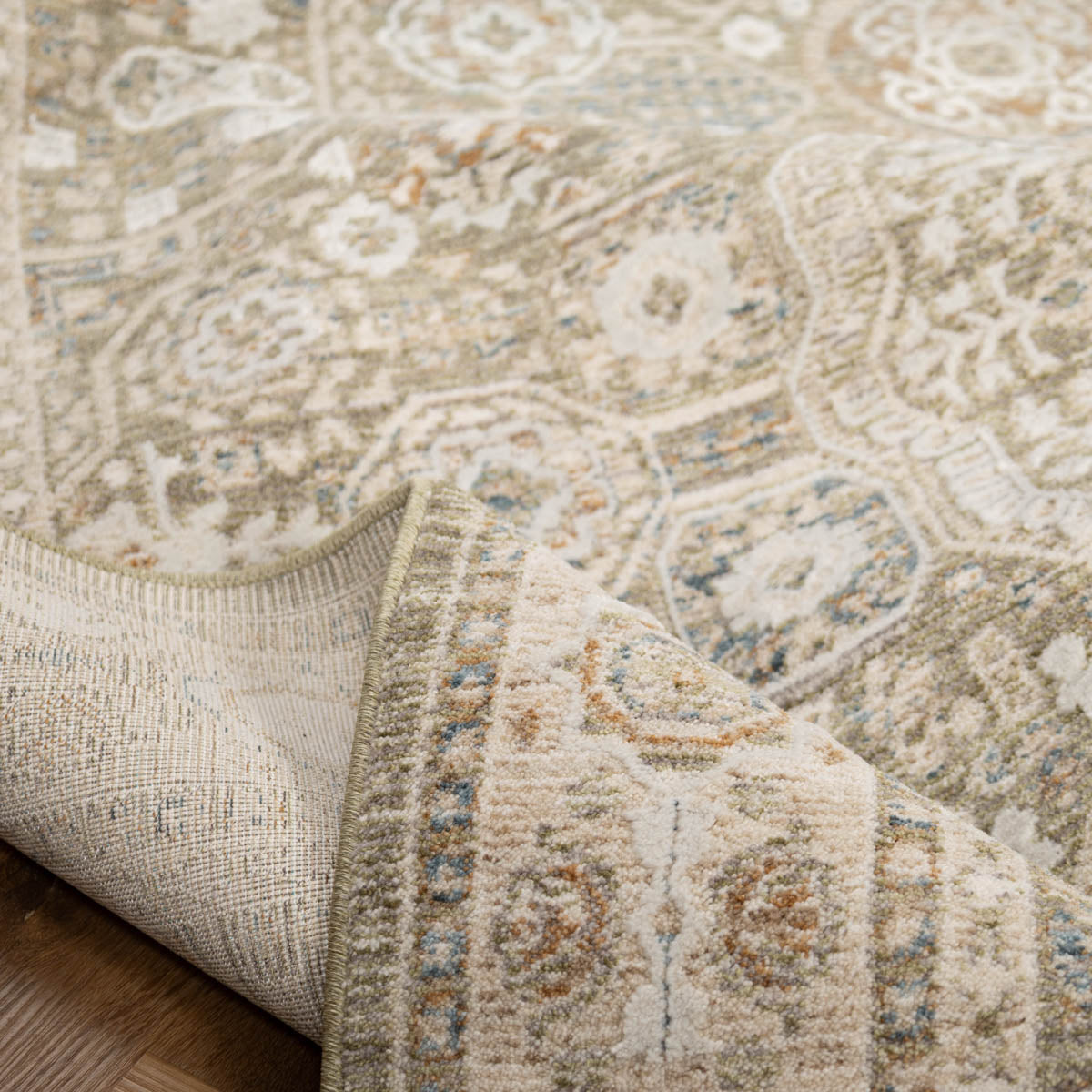 שטיח בסגנון קלאסי עדין שמשלב גווני ירוק, בז' ואפור ליצירת מראה רגוע, טבעי ומאיר חלל. הדוגמה המפורטת והמרקם הרך מעניקים תחושה חמימה ונעימה ומתאימים כמעט לכל סגנון עיצוב.