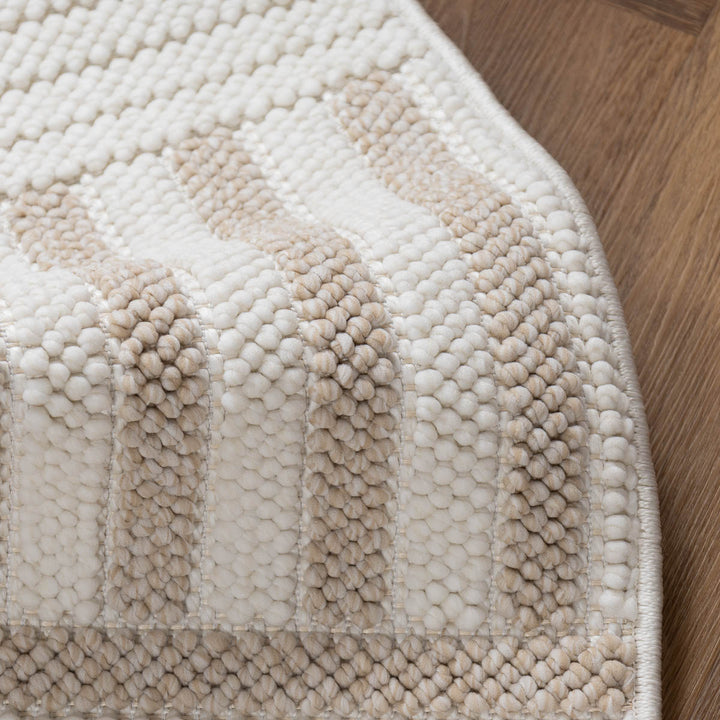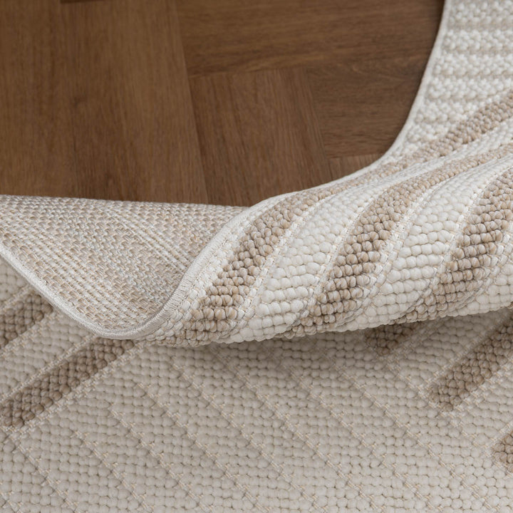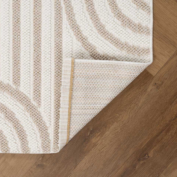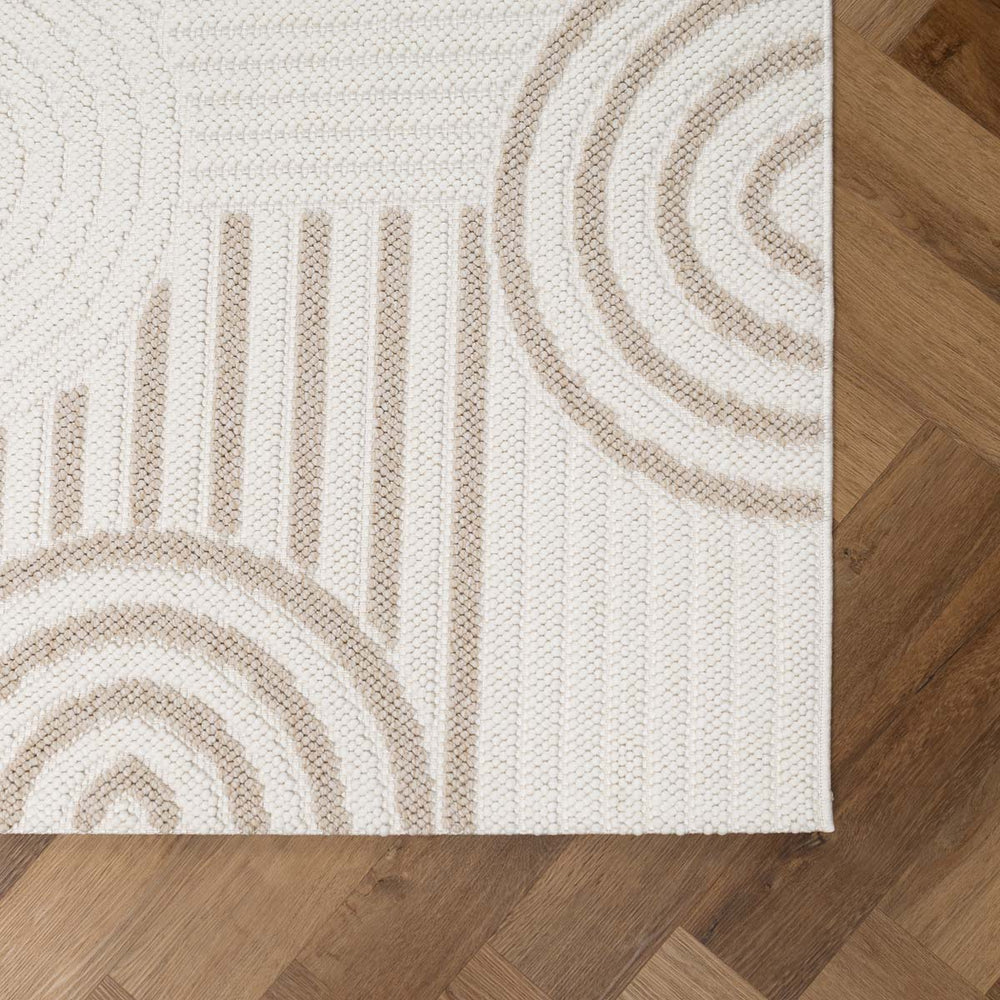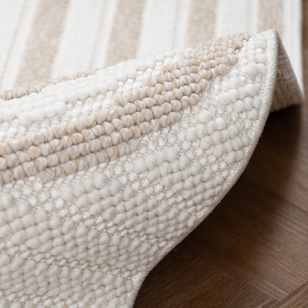 שטיח באריגה שטוחה, בעיצוב מודרני עם דפוסים גיאומטריים מרהיבים בגווני קרם ובז'. יוצר מראה אלגנטי, שקט ומלא עומק, תוך שמירה על קווים נקיים ועדכניים שמתאימים לכל חלל בבית.