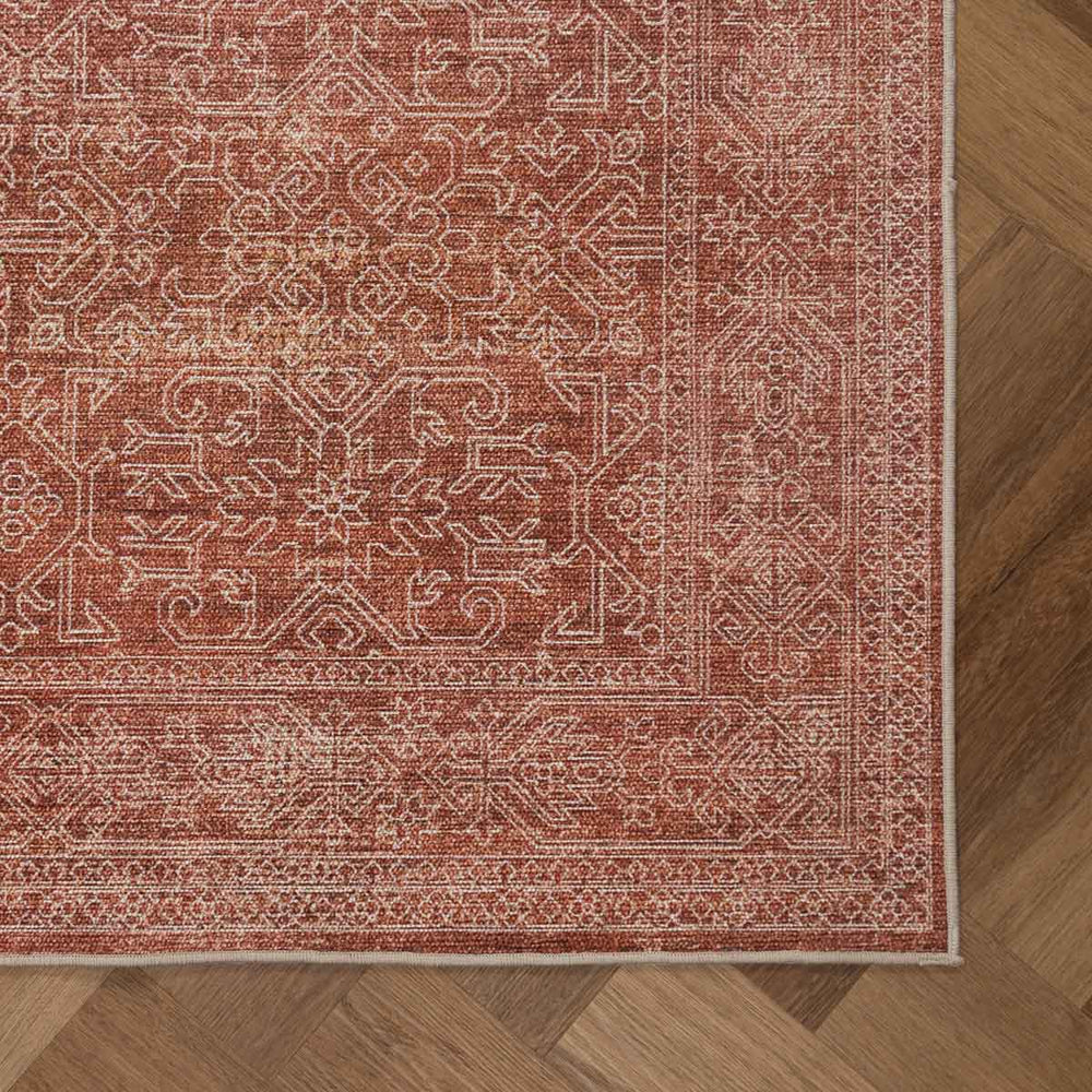 שטיח בסגנון וינטאז' קלאסי בגוון בריק אדמדם, עם דוגמה עדינה המשווה לו מראה שחוק ואלגנטי. שילוב מושלם בין חמימות מזרחית לאסתטיקה מודרנית-רגועה.