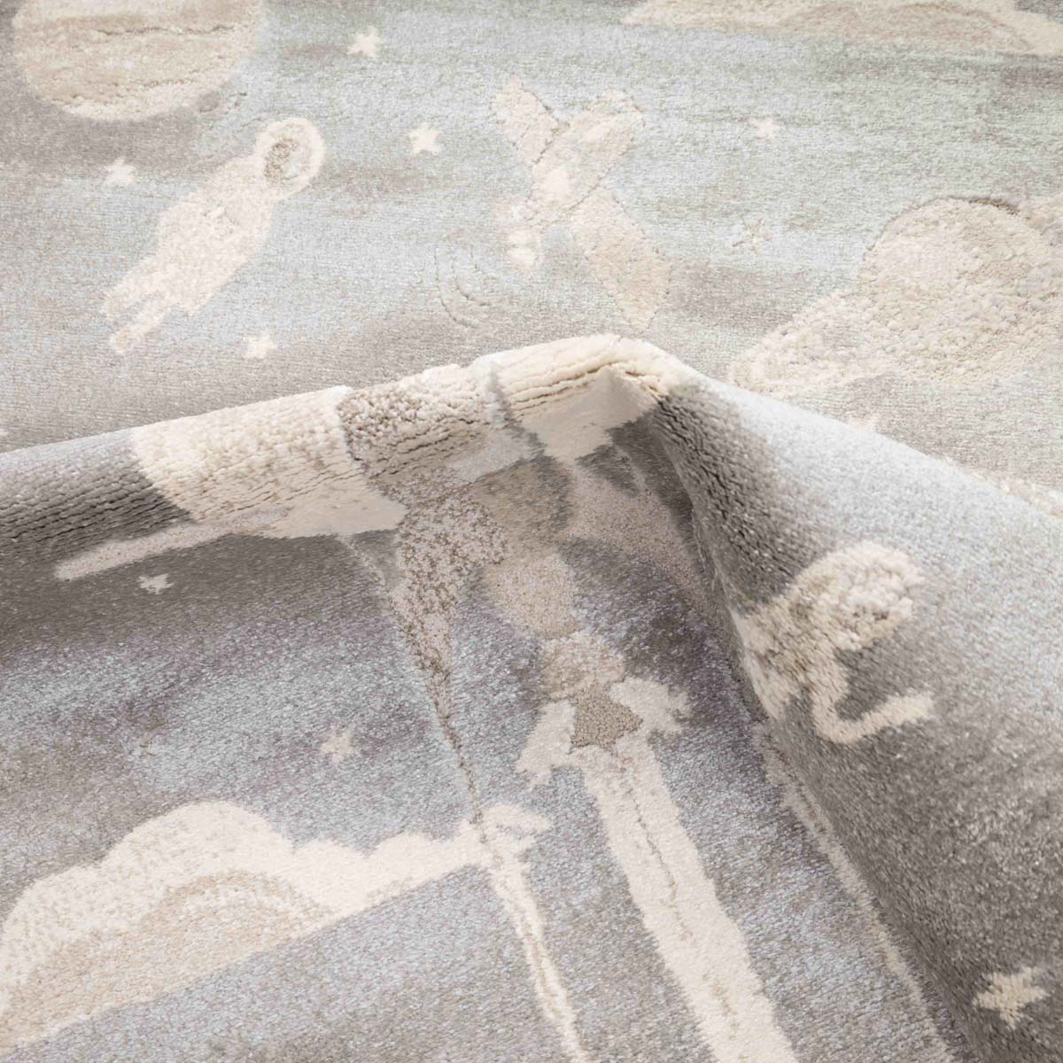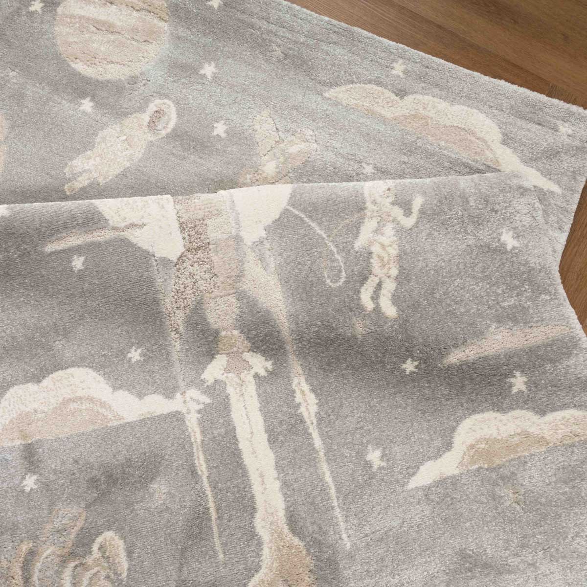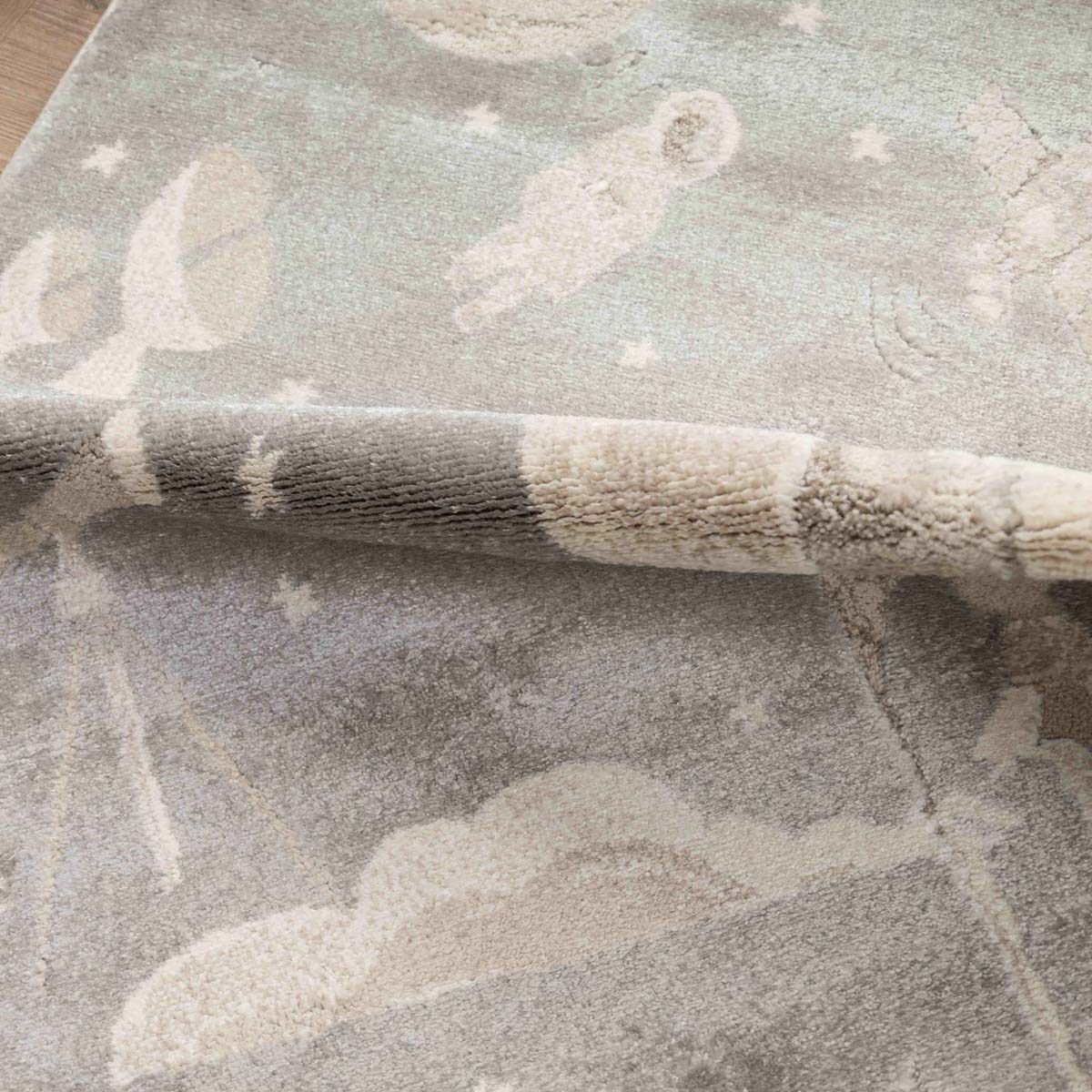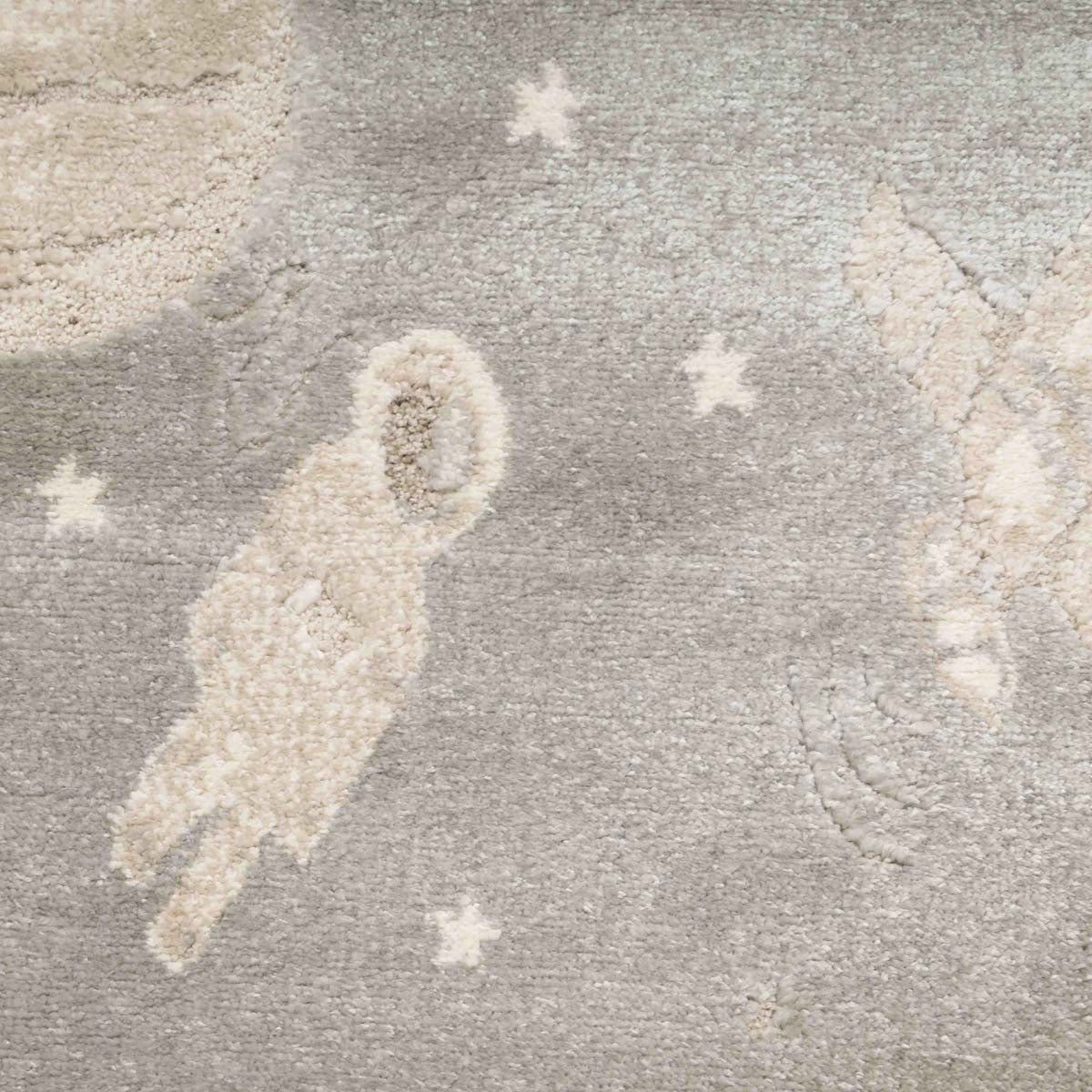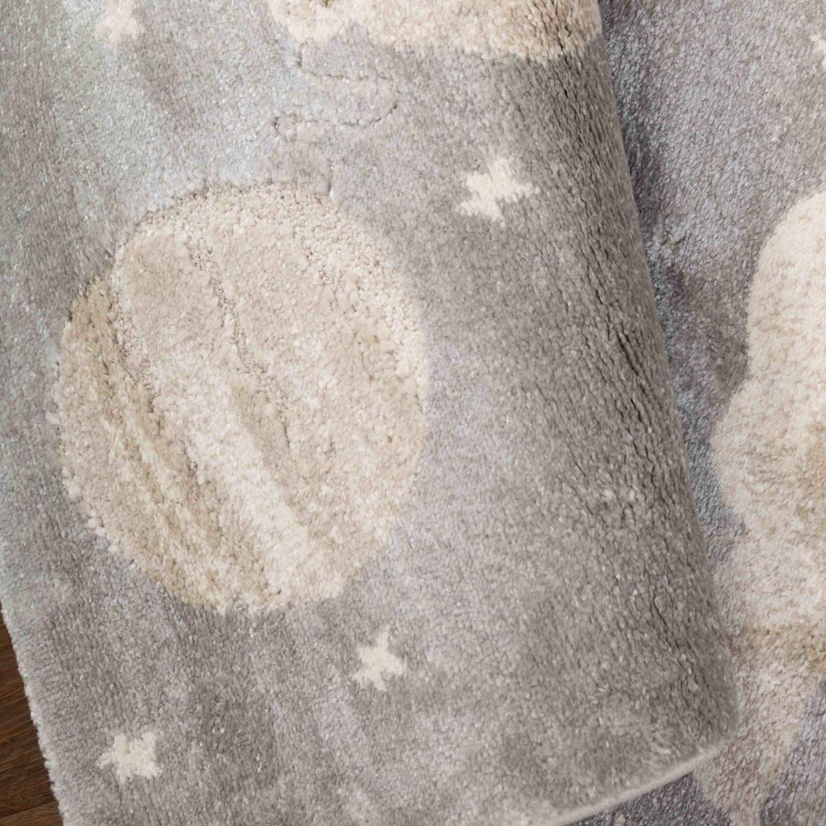 שטיח רך ועדין בהשראת עולם החלל והדמיון. עיצוב שקט וחלומי שיוצר תחושת רוגע וביטחון בחדר הילדים, בלי עומס ובלי צבעים חזקים.