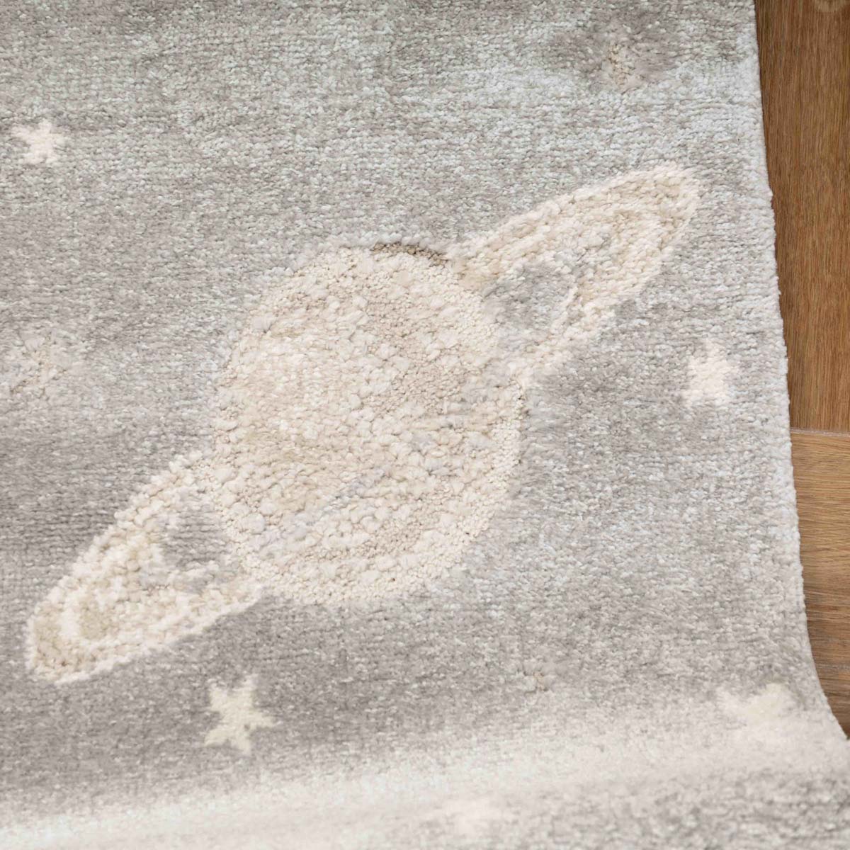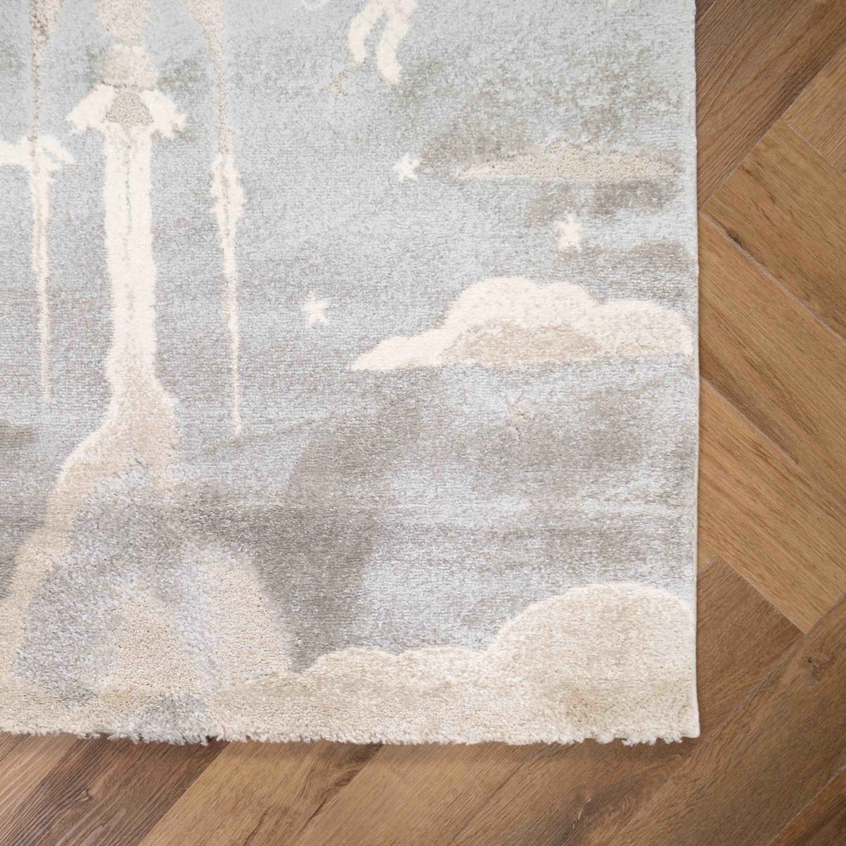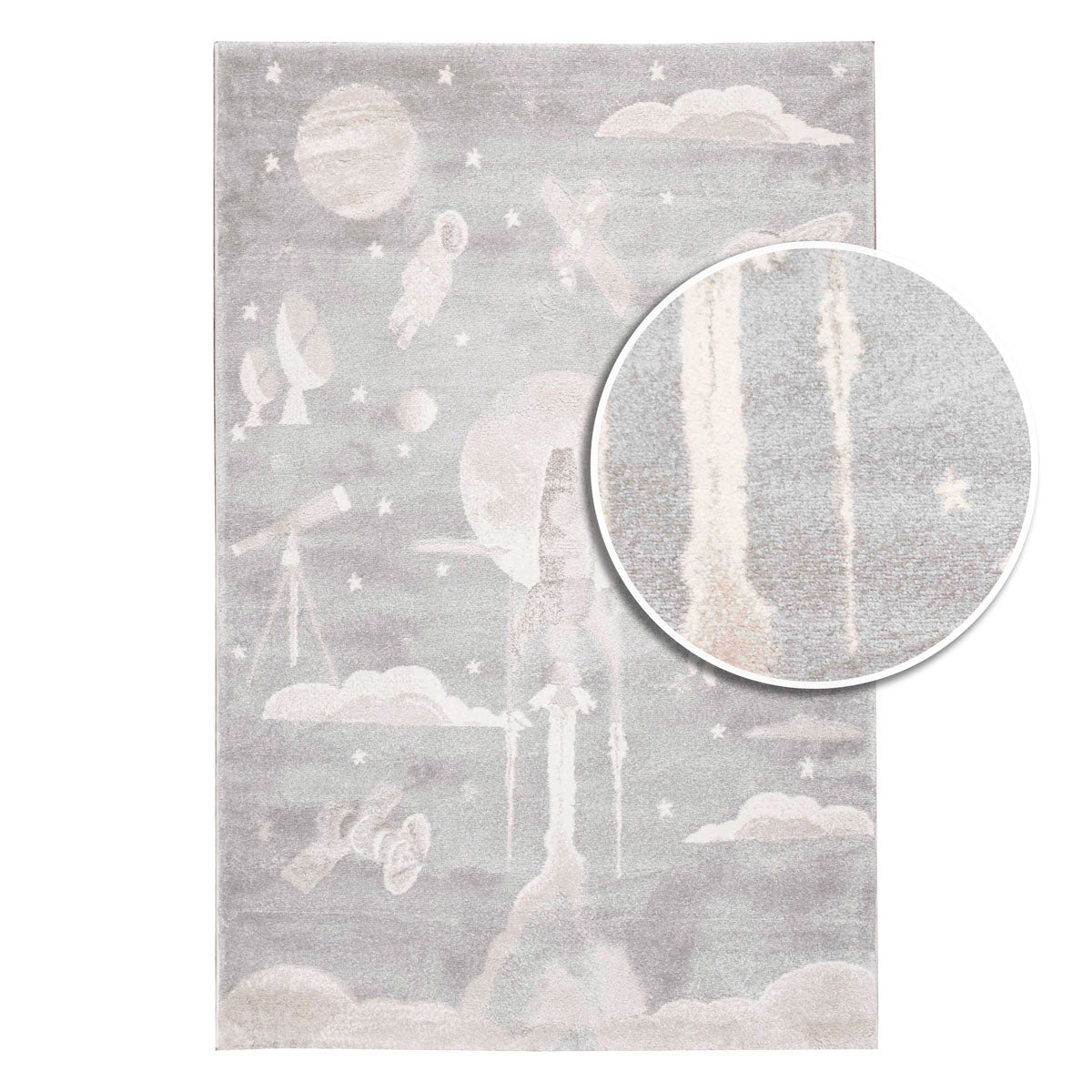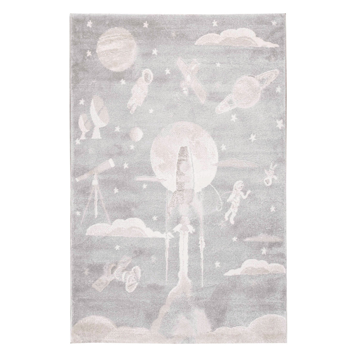 שטיח רך ועדין בהשראת עולם החלל והדמיון. עיצוב שקט וחלומי שיוצר תחושת רוגע וביטחון בחדר הילדים, בלי עומס ובלי צבעים חזקים.