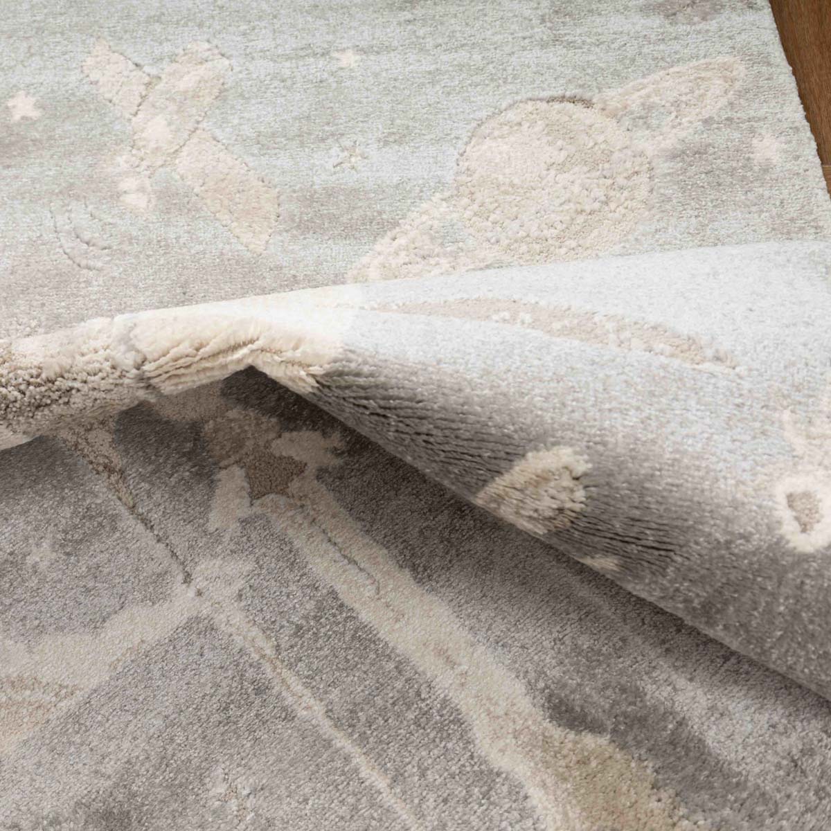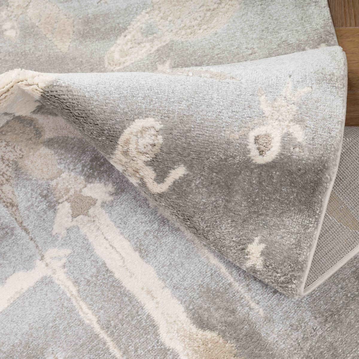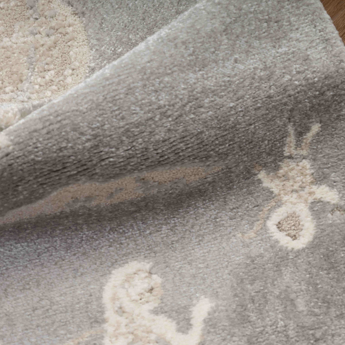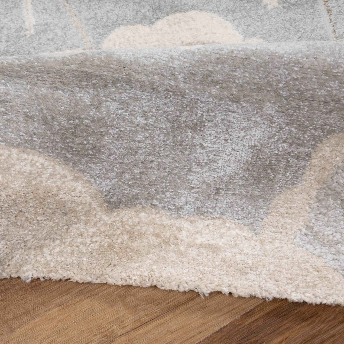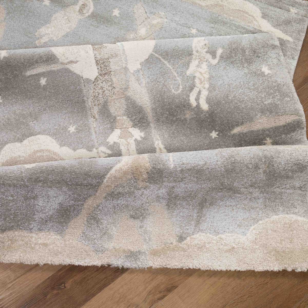 שטיח רך ועדין בהשראת עולם החלל והדמיון. עיצוב שקט וחלומי שיוצר תחושת רוגע וביטחון בחדר הילדים, בלי עומס ובלי צבעים חזקים.