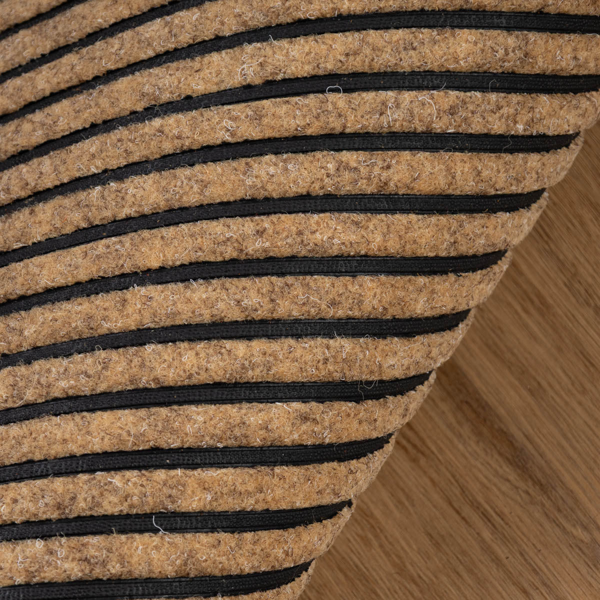 השטיח עשוי מסיבי קוקוס טבעיים בגוון בז' חמים, המשולבים במסגרת גומי שחורה שמדגישה את הדוגמה הקווית ומוסיפה נוכחות מודרנית. הפסים האופקיים יוצרים מראה מינימליסטי אך יוקרתי, שמתאים לבתים פרטיים, דירות ומשרדים.
