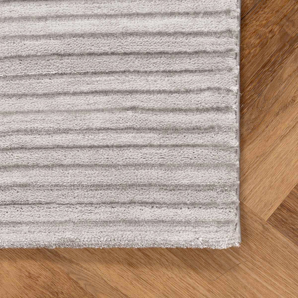 שטיח "לונדון 21" בגוון אפור בהיר משלב מראה מינימליסטי ופשטות מודרנית, המשלב דוגמת פסים עדינה להוספת מרקם ויזואלי בחלל.
