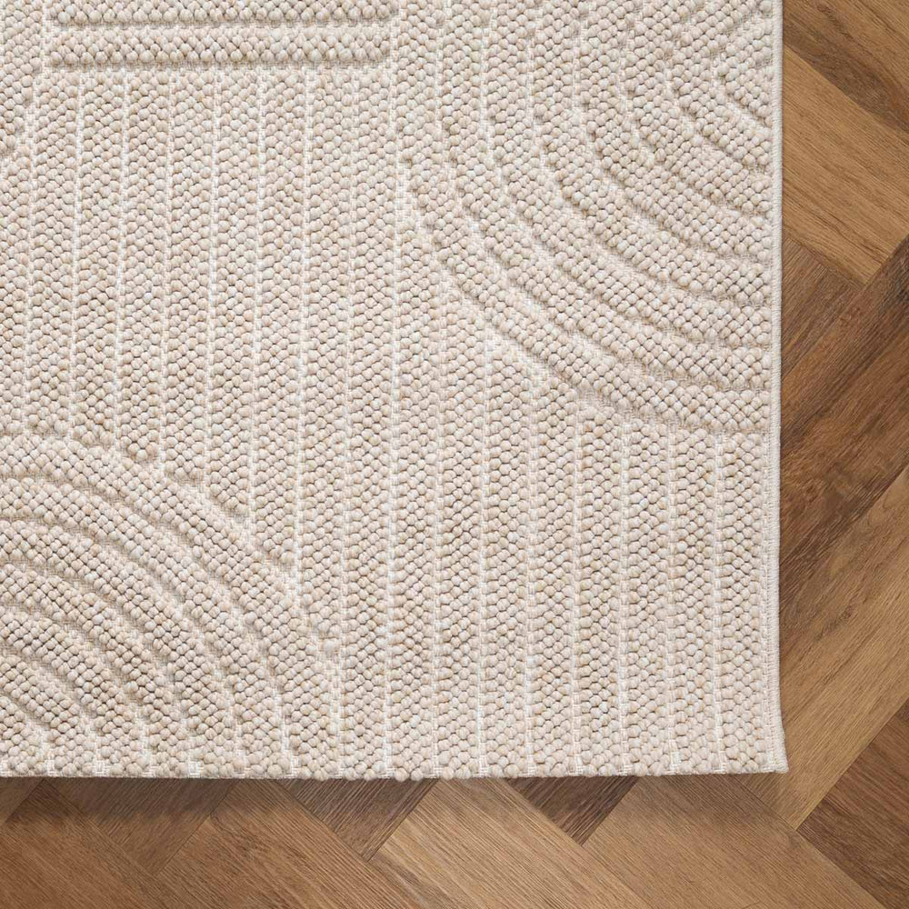 שטיח מודרני בקווים מעוגלים וטקסטורת תבליט ייחודית, בגוון בז' רך ונקי – עיצוב עכשווי שמכניס סדר, שלווה ואלגנטיות לכל חלל.