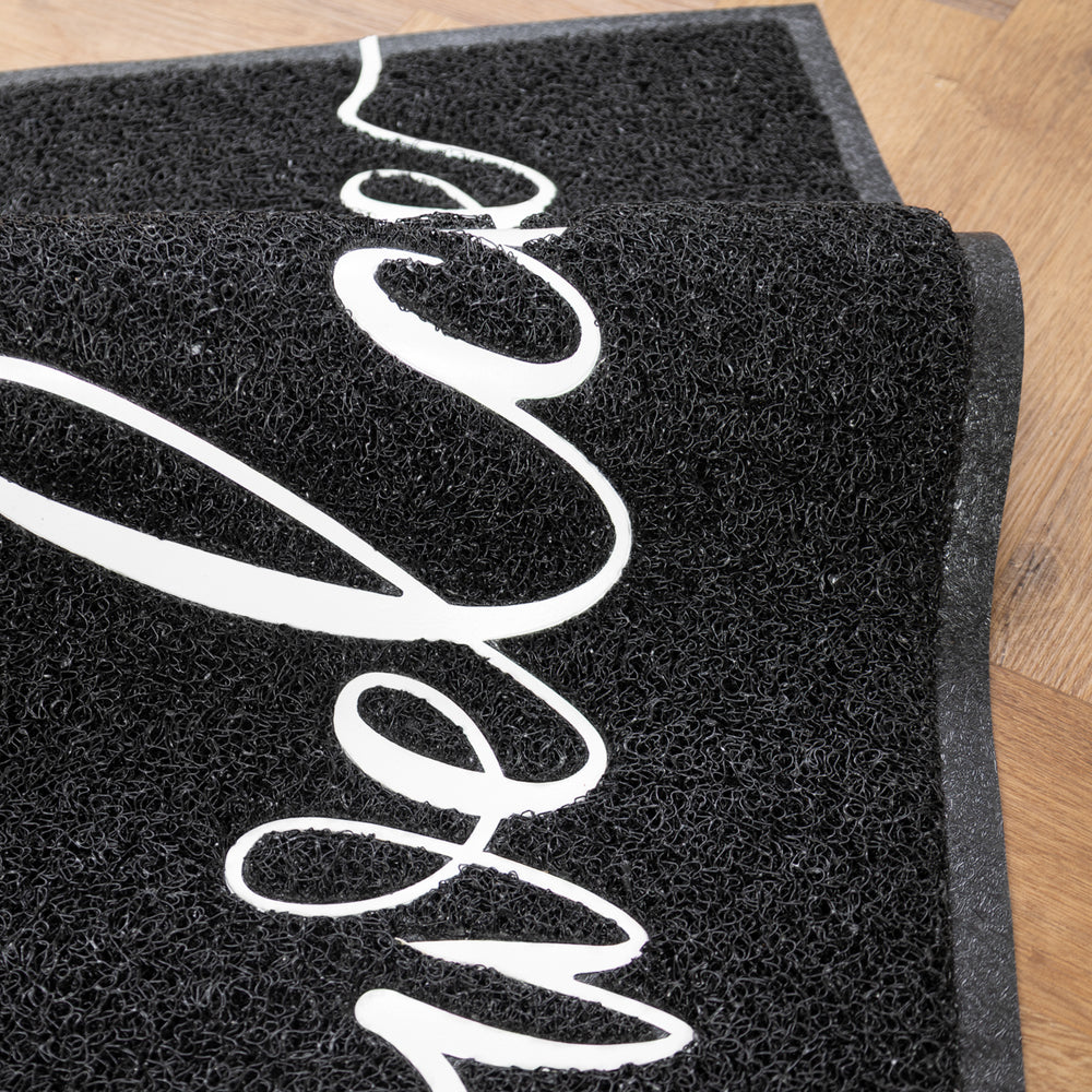 שטיח כניסה בגוון שחור יוקרתי עם כיתוב לבן "WELCOME" בעיצוב קליגרפיה מודרני – מוסיף סטייל כבר מהצעד הראשון.