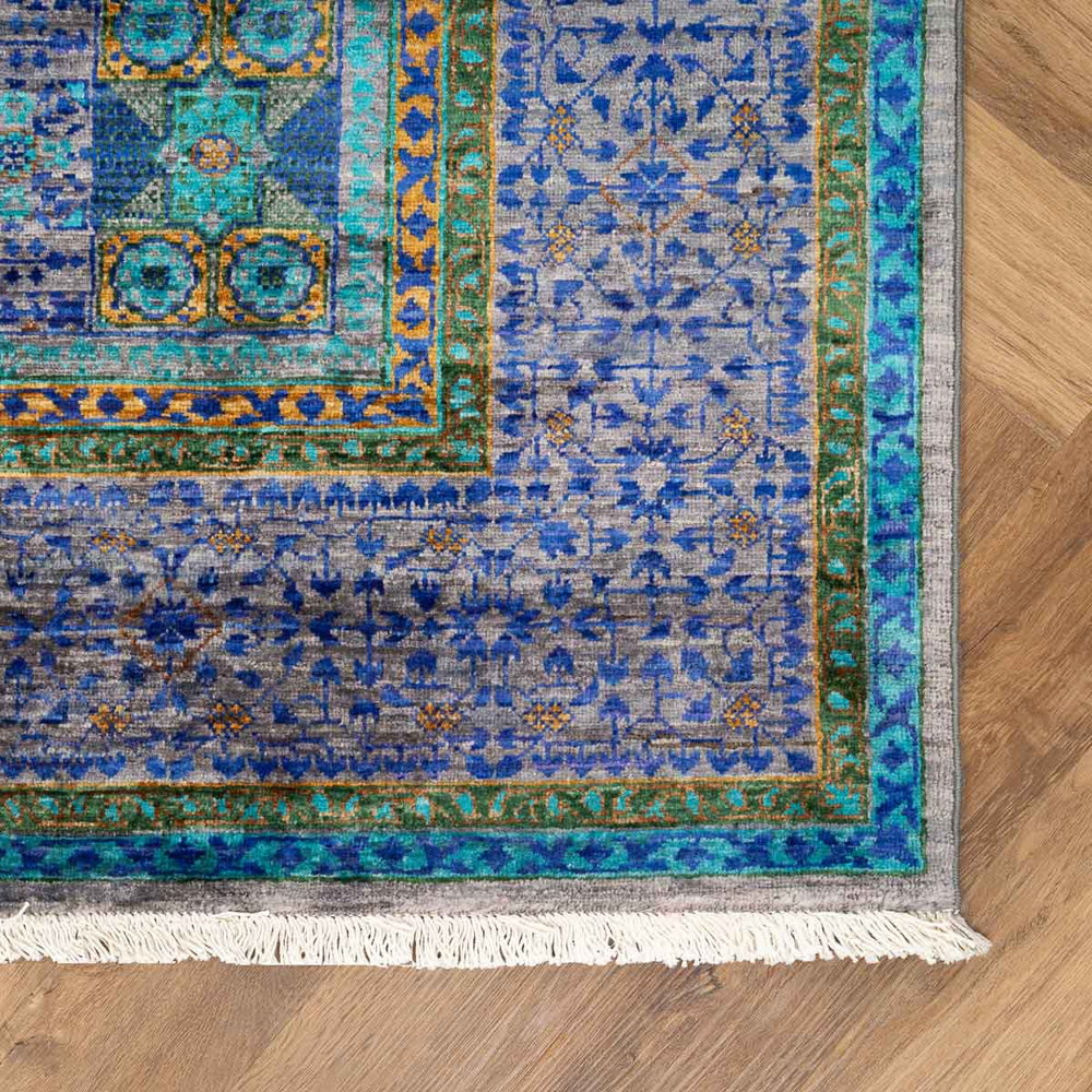 שטיח ממלוק זה הוא יצירת אמנות מרהיבה בהשראת השטיחים ההיסטוריים מתקופת הממלוכים. שילוב עוצמתי של גווני כחול, טורקיז וזהב על רקע מורכב ודחוס בפרטים – מעניקים לו נוכחות מלכותית ותחושת עומק עשירה.