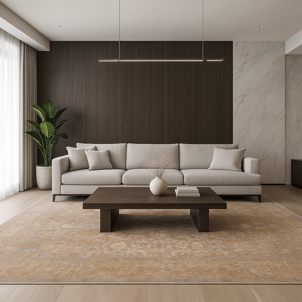 - עיצוב יוקרתי ומרשים: שטיח בגווני אפור וחרדל המשלב דוגמאות קלאסיות עם נגיעות מודרניות, מתאימות לחללים בעלי עיצוב מתוחכם.