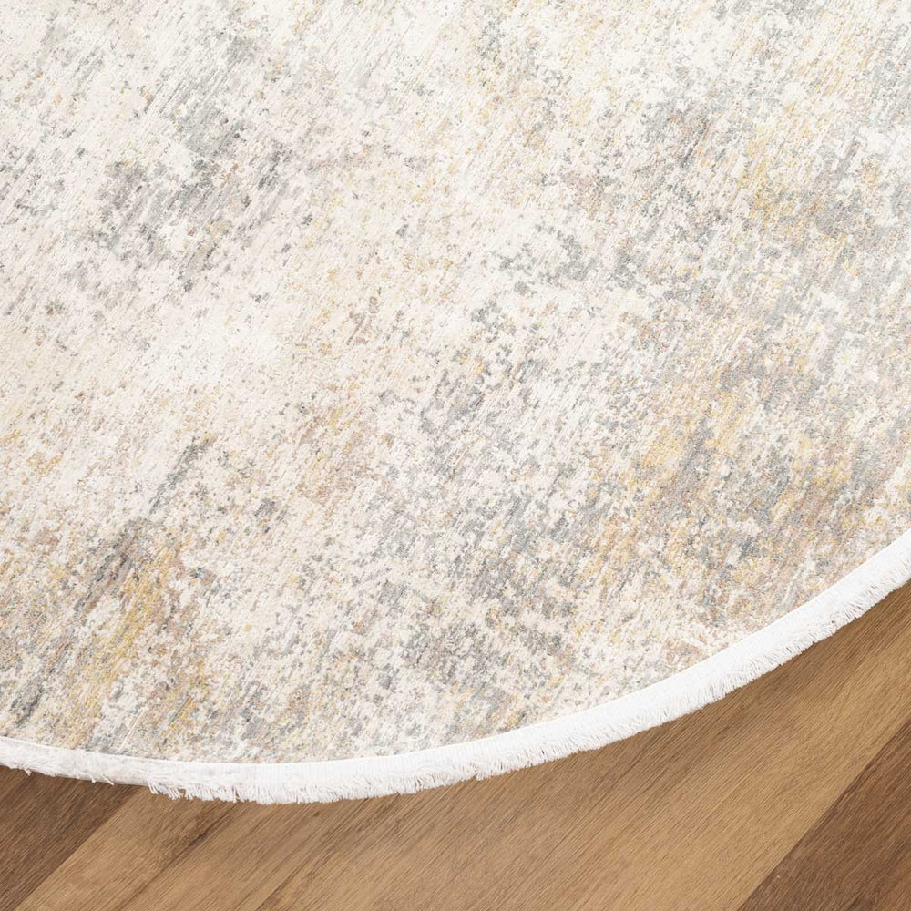 שטיח עגול עם דוגמת אבסטרקט מופשטת בגווני בז', אפור בהיר ונגיעות זהובות שמוסיפות חמימות ואופי לחלל. שילוב עדין של טקסטורות וגוונים יוצרים מראה עשיר, אך לא משתלט, שמתאים כמעט לכל סגנון עיצוב.