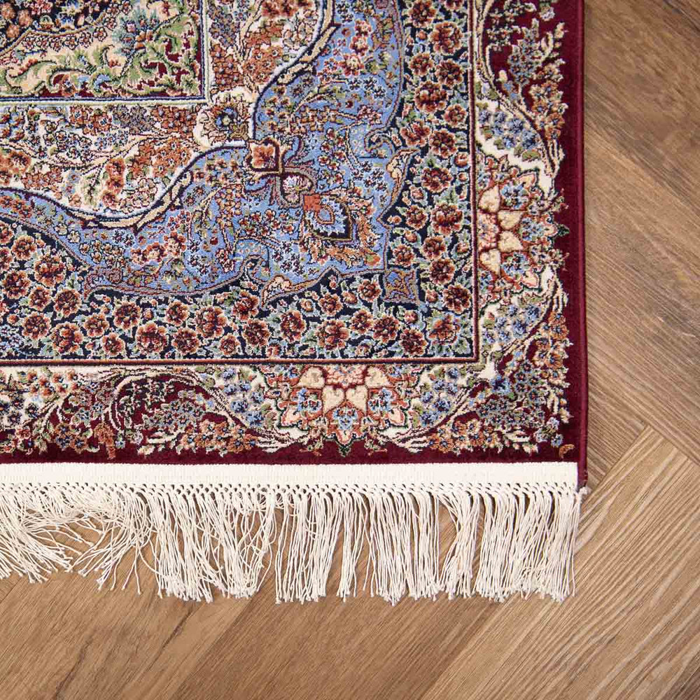 השטיח מעוצב בגוון אדום עשיר, המעוטר במוטיבים פרחוניים מורכבים ובדפוסים מעוגלים בגווני כחול, בז' ושמנת. במרכז השטיח בולטת מנדלה סימטרית מרשימה, המושכת את העין ומשלימה את המראה האצילי והקלאסי של השטיח.