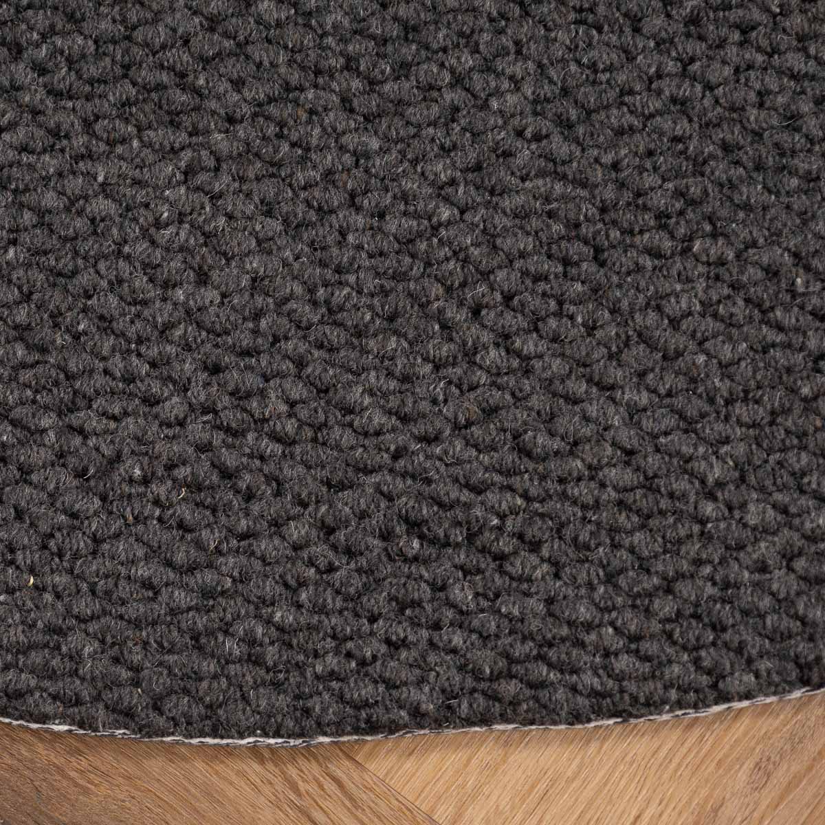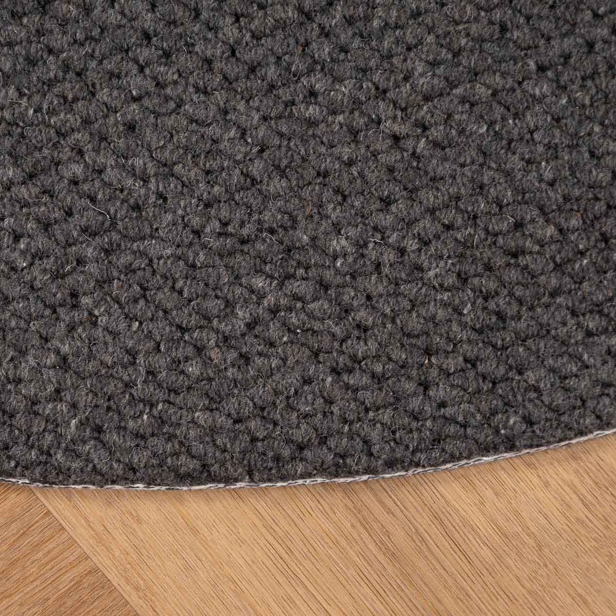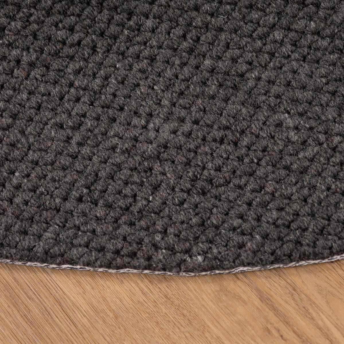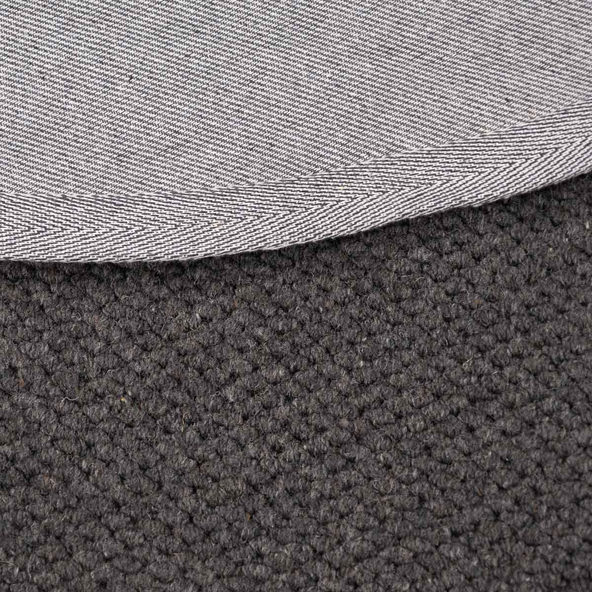 שטיח עגול בעבודת יד, עשוי 100% צמר טבעי בגוון אפור כהה עמוק. טקסטורה צפופה ונעימה למגע, עם מראה מודרני, נקי ועל זמני. הצורה העגולה מרככת את החלל ויוצרת איזון מושלם בין חומריות לעיצוב.