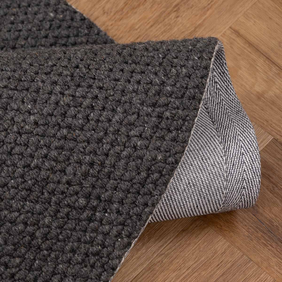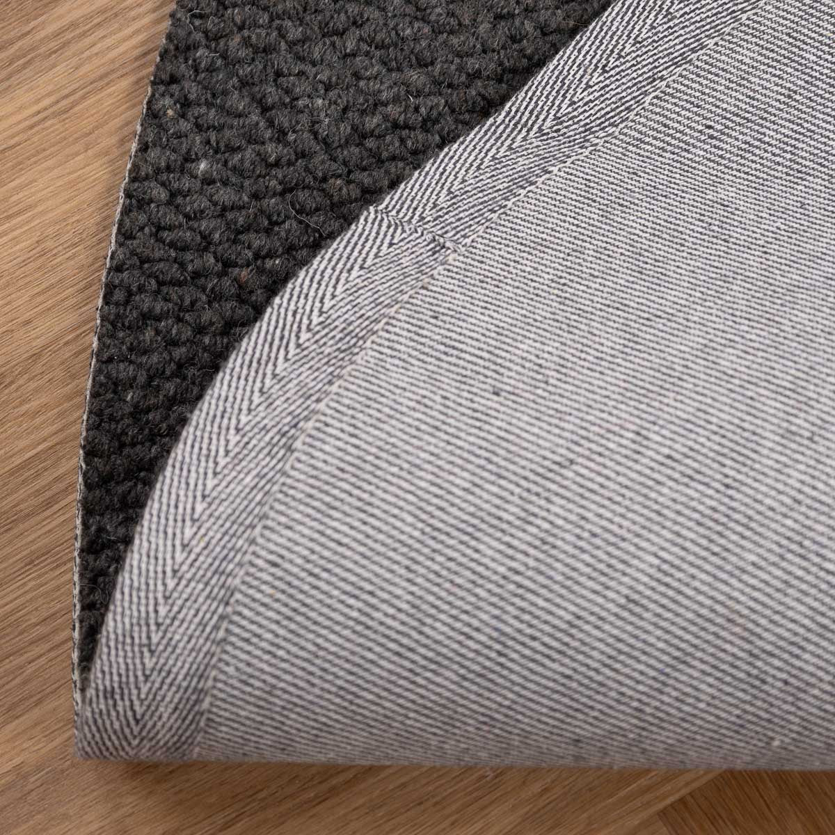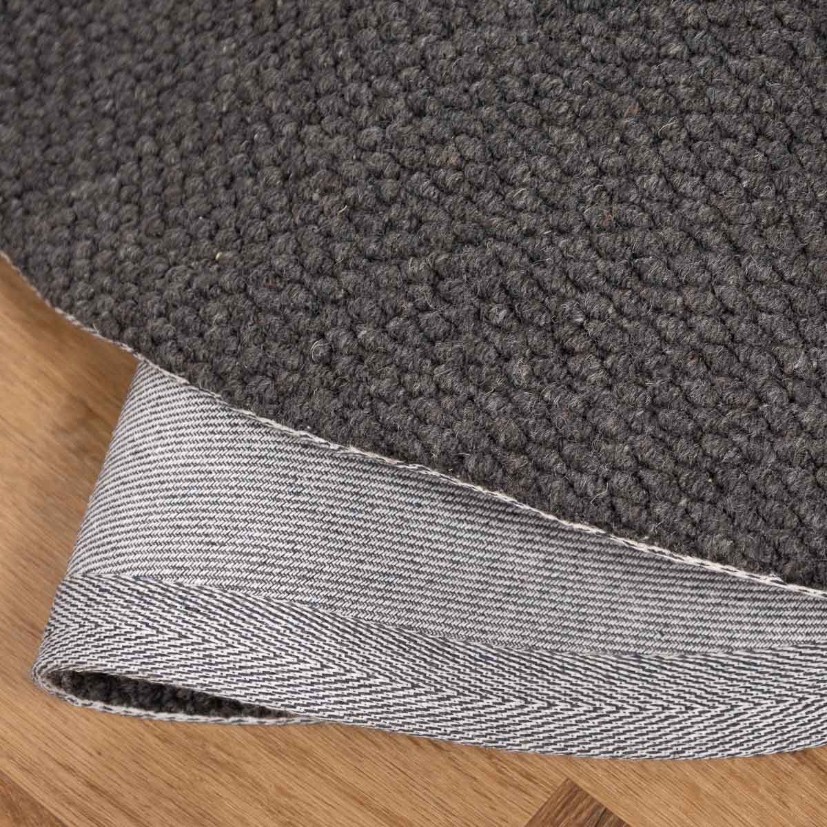 שטיח עגול בעבודת יד, עשוי 100% צמר טבעי בגוון אפור כהה עמוק. טקסטורה צפופה ונעימה למגע, עם מראה מודרני, נקי ועל זמני. הצורה העגולה מרככת את החלל ויוצרת איזון מושלם בין חומריות לעיצוב.