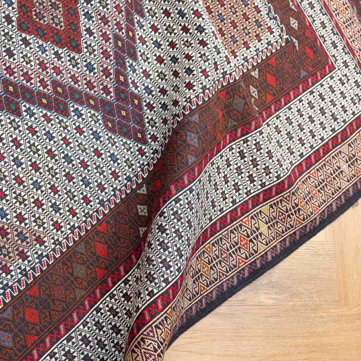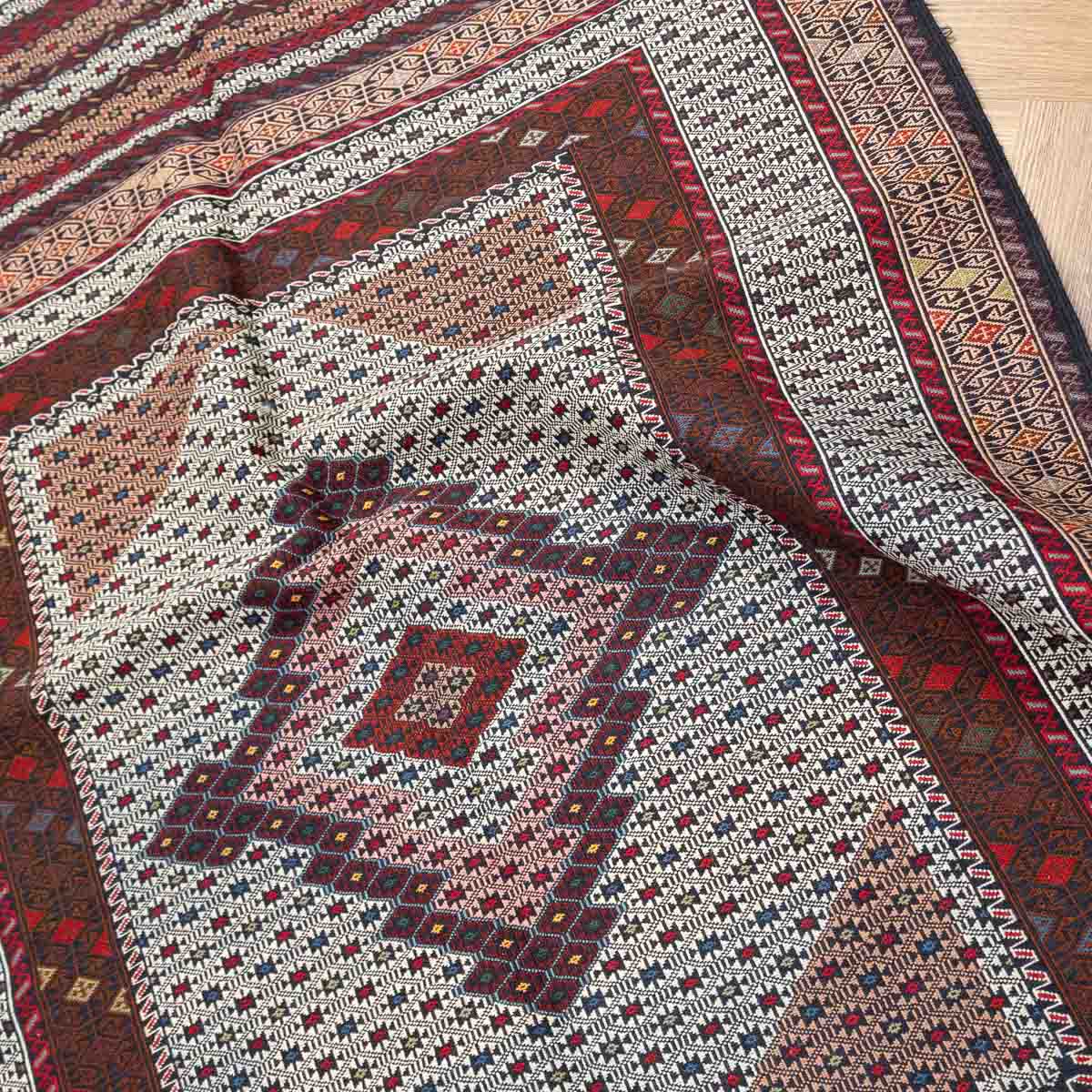 שטיח סומק פרסי בעבודת יד עם דוגמה שבטית מסורתית ועשירה בפרטים. הצבעוניות העמוקה בשילוב הגיאומטריה הקלאסית יוצרת שטיח שהוא פריט אמנות של ממש.