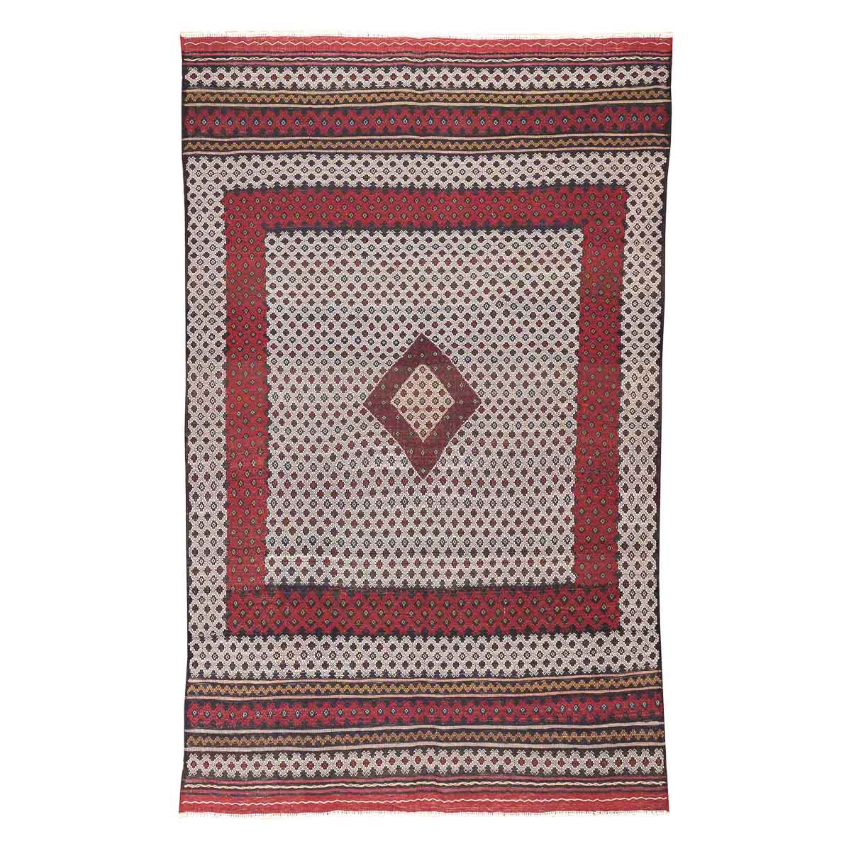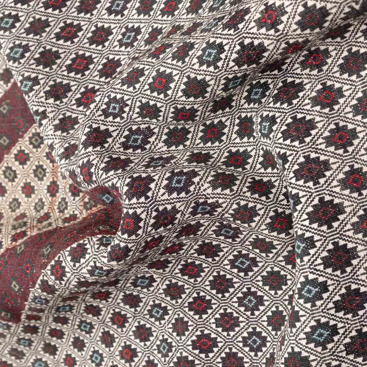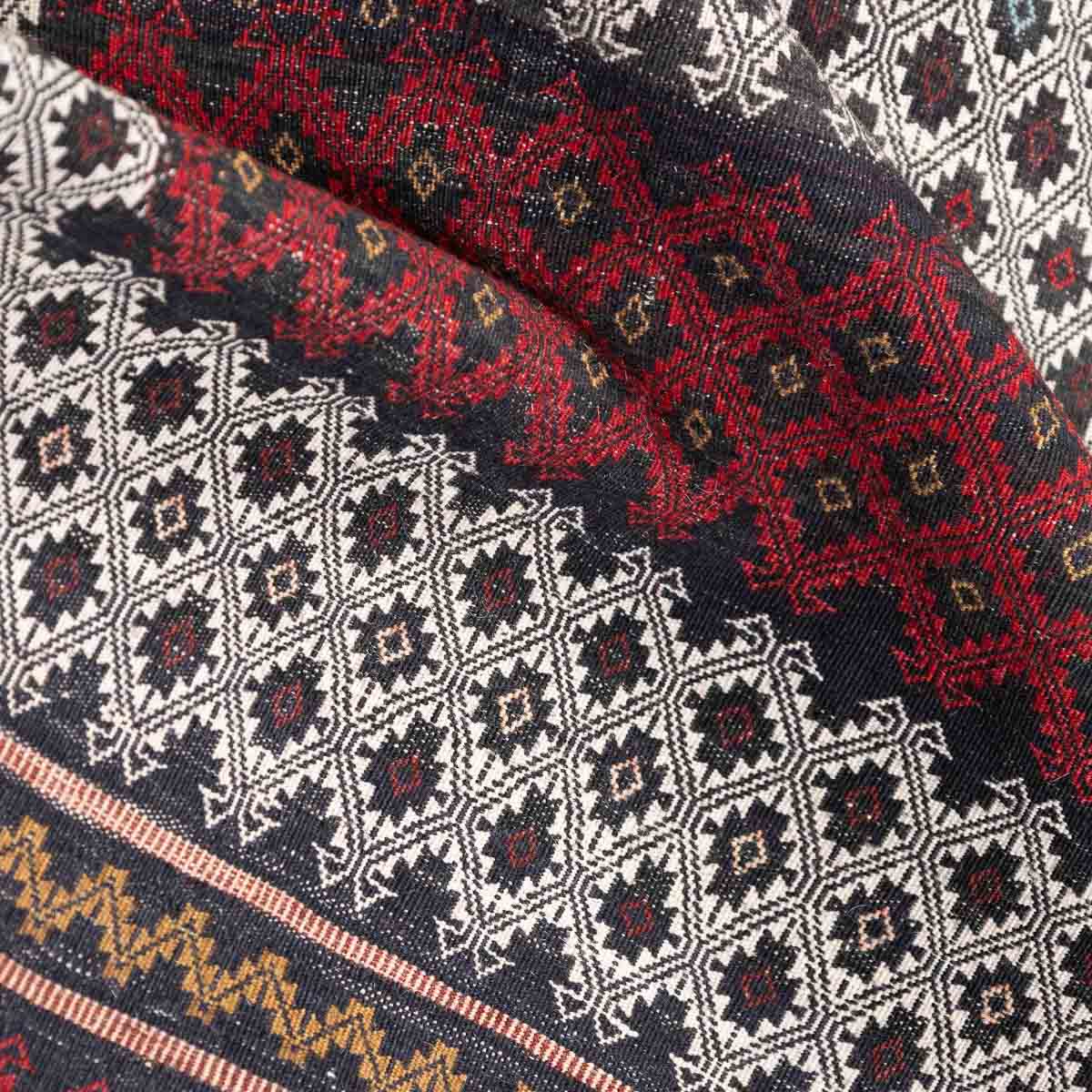 הדוגמה מבוססת על שילובי יהלומים, פסים גיאומטריים ומוטיבים שבטיים עתיקים. שילובי האדום והבורדו יוצרים מוקד עוצמתי והגוונים הבהירים מאזנים ומעניקים תחושת אור.