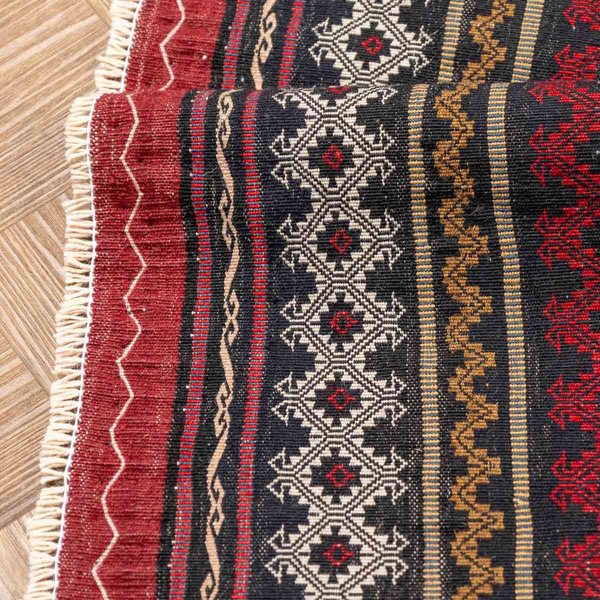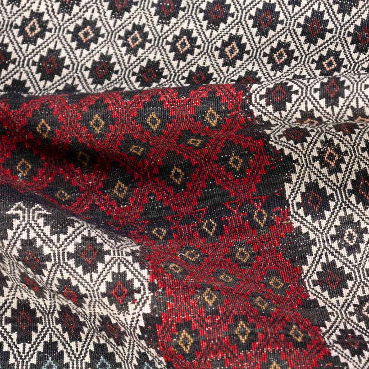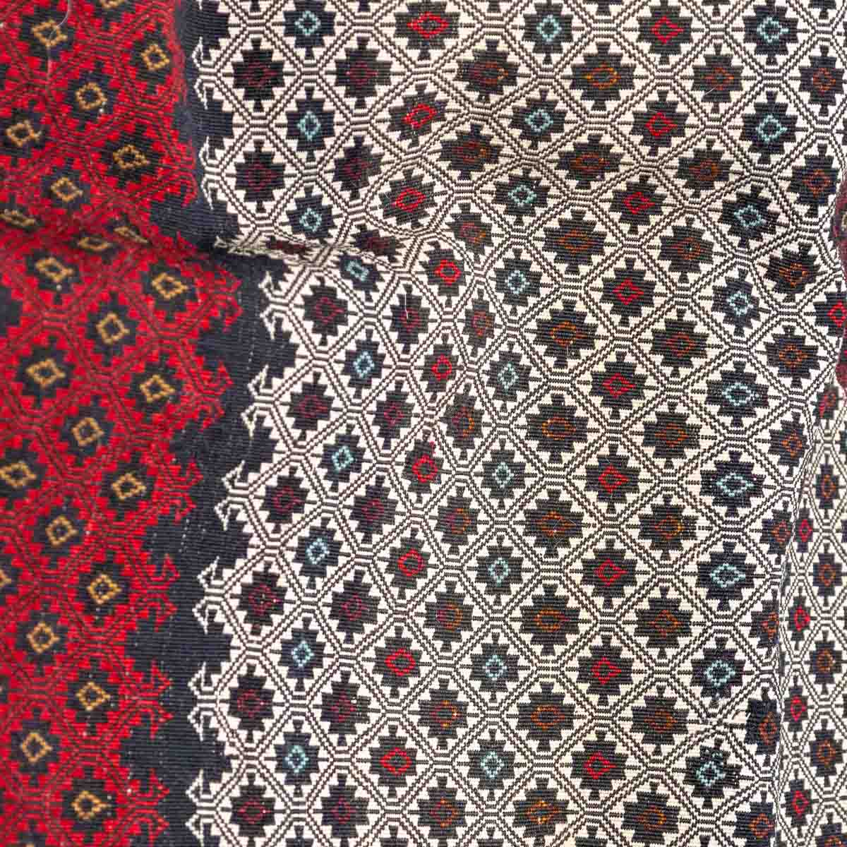 הדוגמה מבוססת על שילובי יהלומים, פסים גיאומטריים ומוטיבים שבטיים עתיקים. שילובי האדום והבורדו יוצרים מוקד עוצמתי והגוונים הבהירים מאזנים ומעניקים תחושת אור.