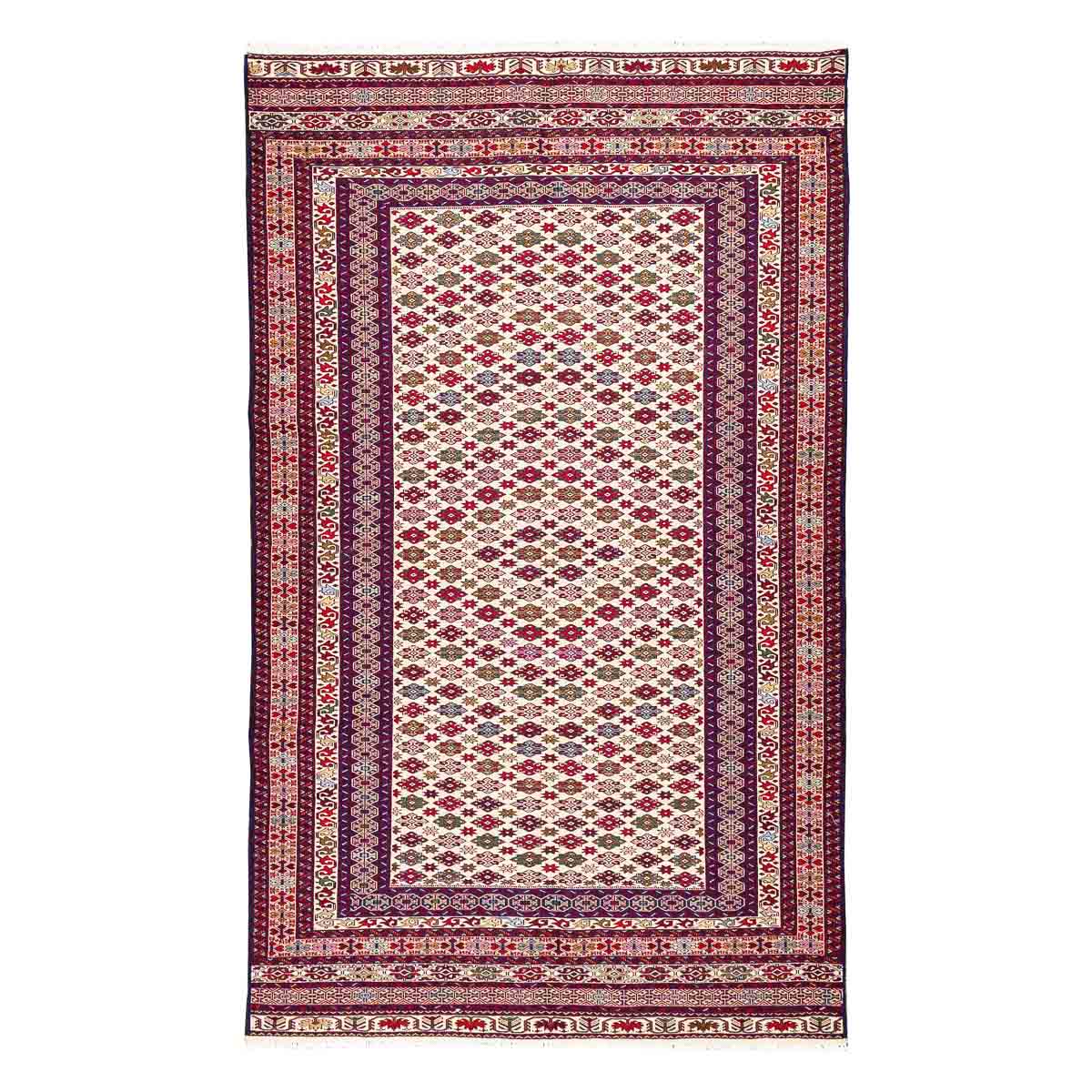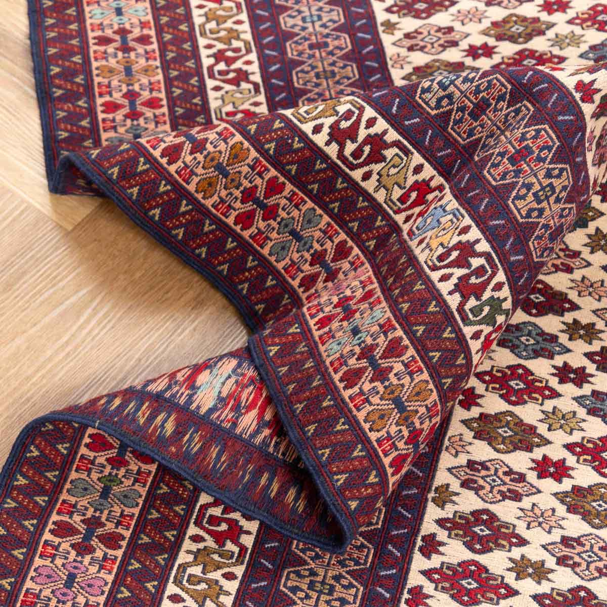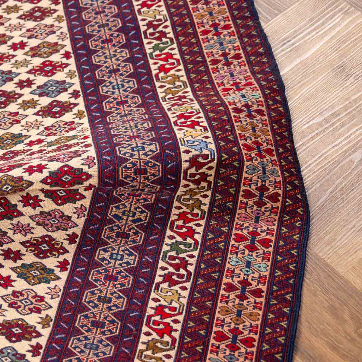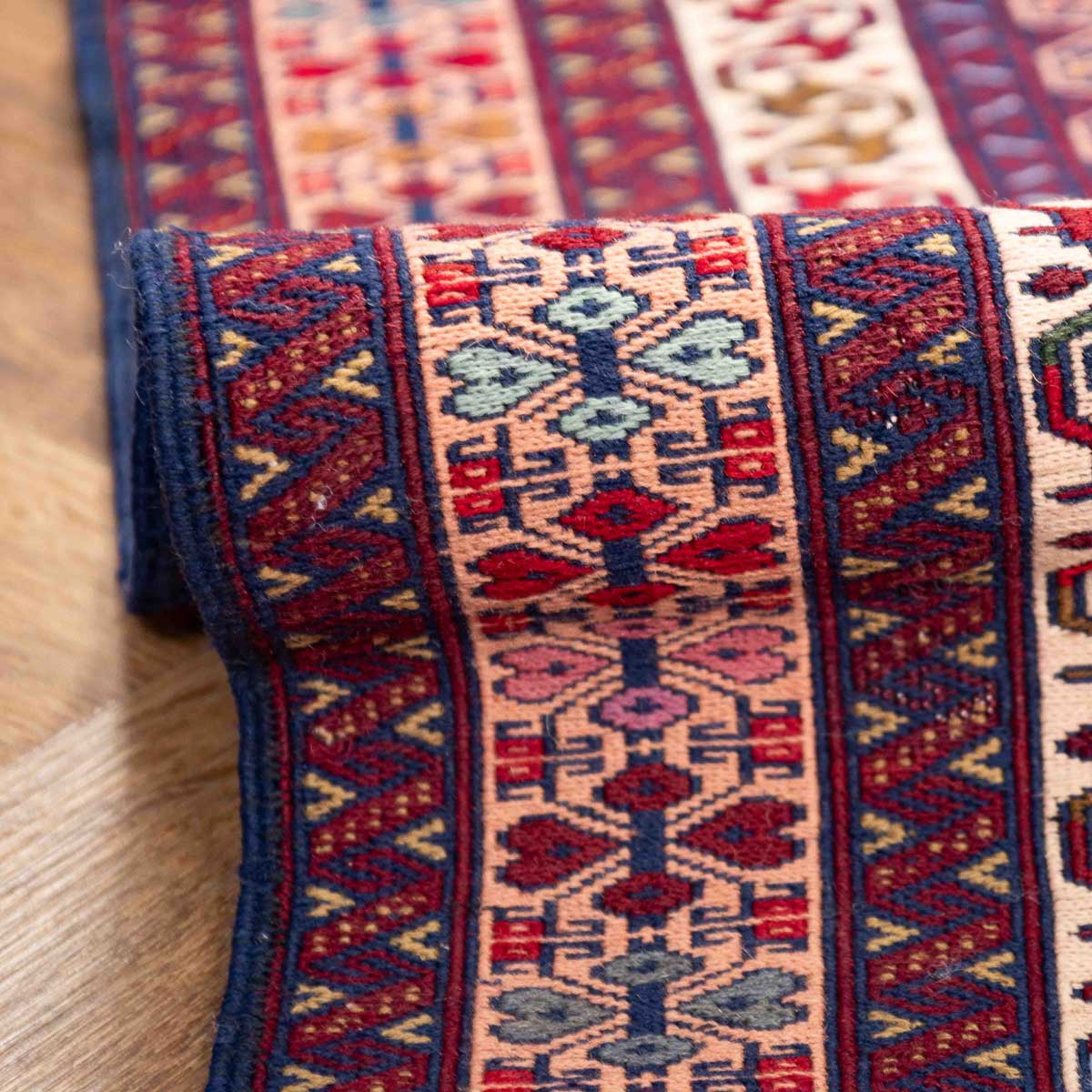 השטיח משלב גווני בורדו, סגול, כחול, קרם ואדום במבנה גיאומטרי מסודר. הדוגמה הפנימית צפופה ומדויקת ומוקפת בשכבות עיטור שמוסיפות עומק ונוכחות.