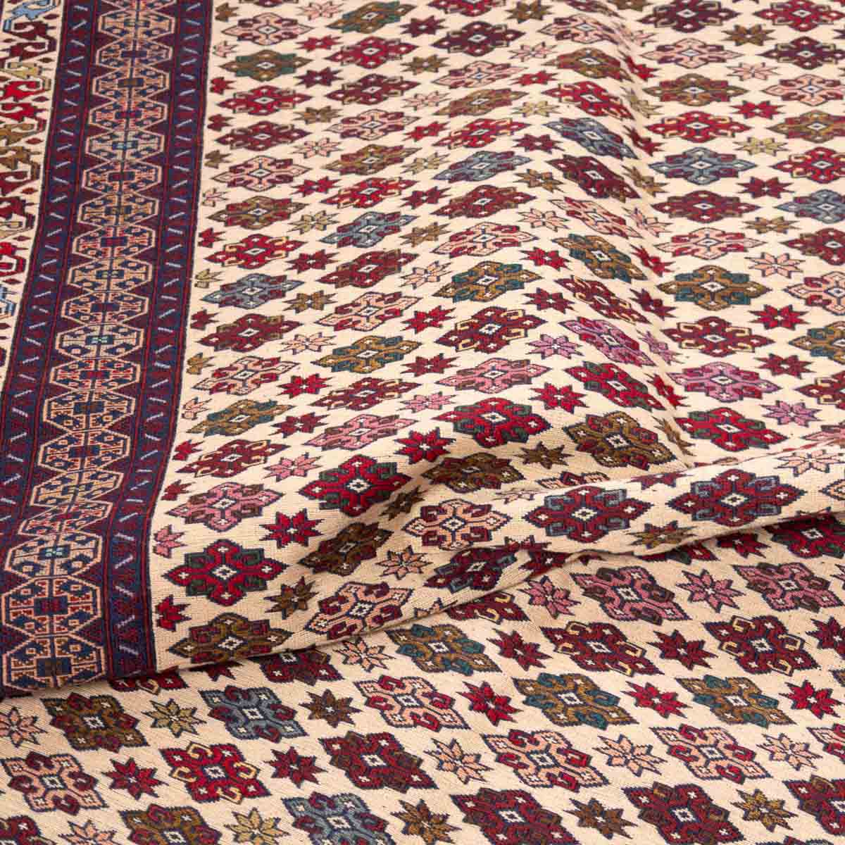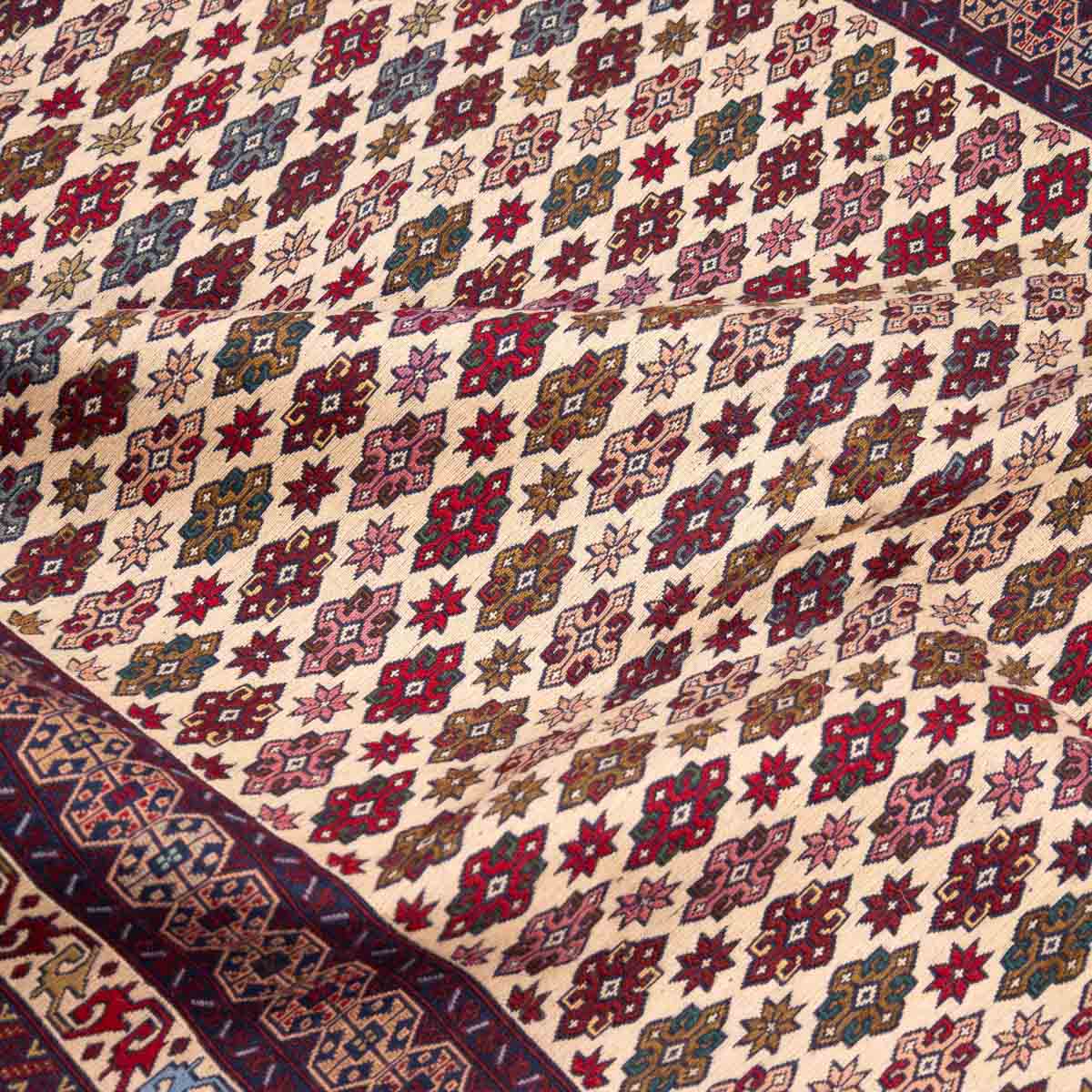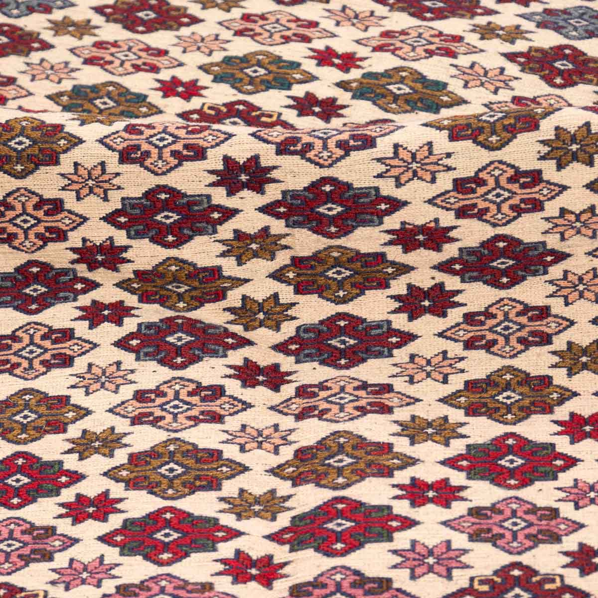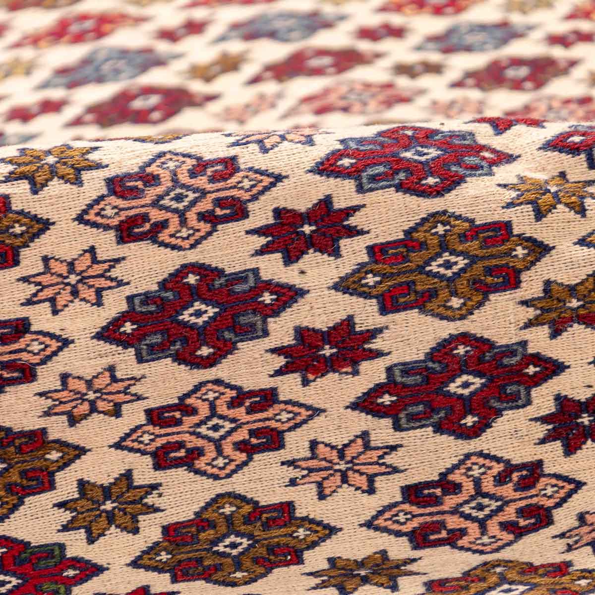 השטיח משלב גווני בורדו, סגול, כחול, קרם ואדום במבנה גיאומטרי מסודר. הדוגמה הפנימית צפופה ומדויקת ומוקפת בשכבות עיטור שמוסיפות עומק ונוכחות.