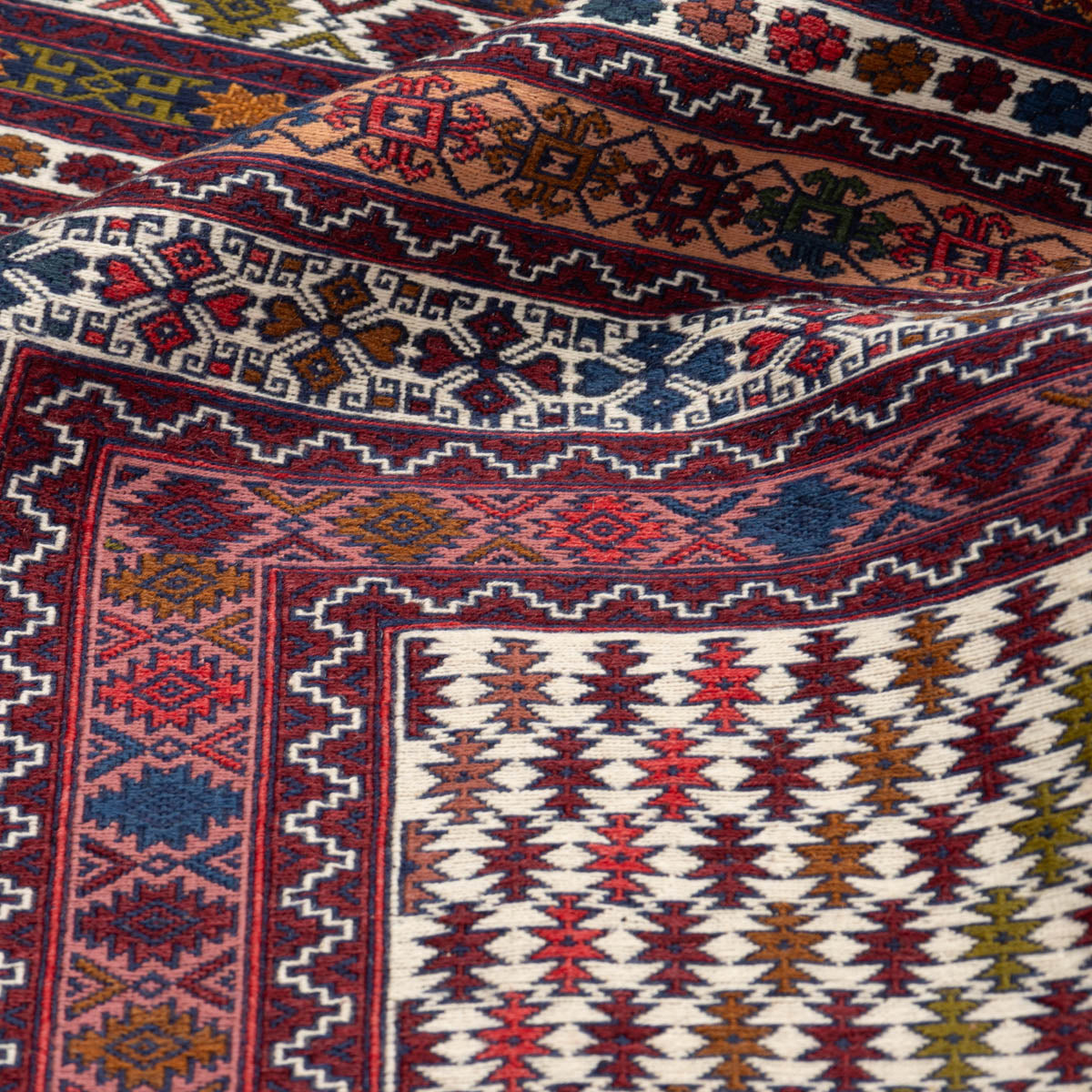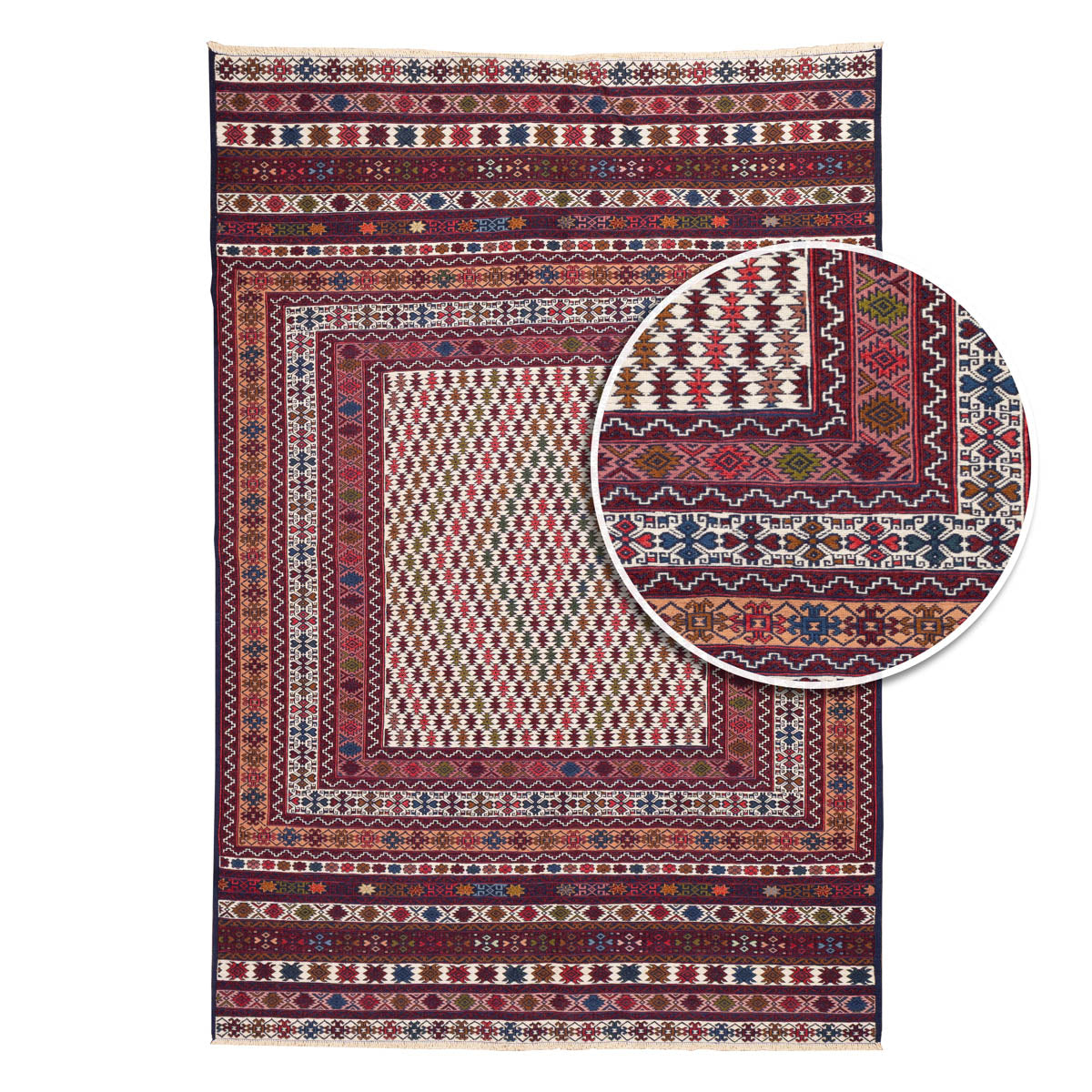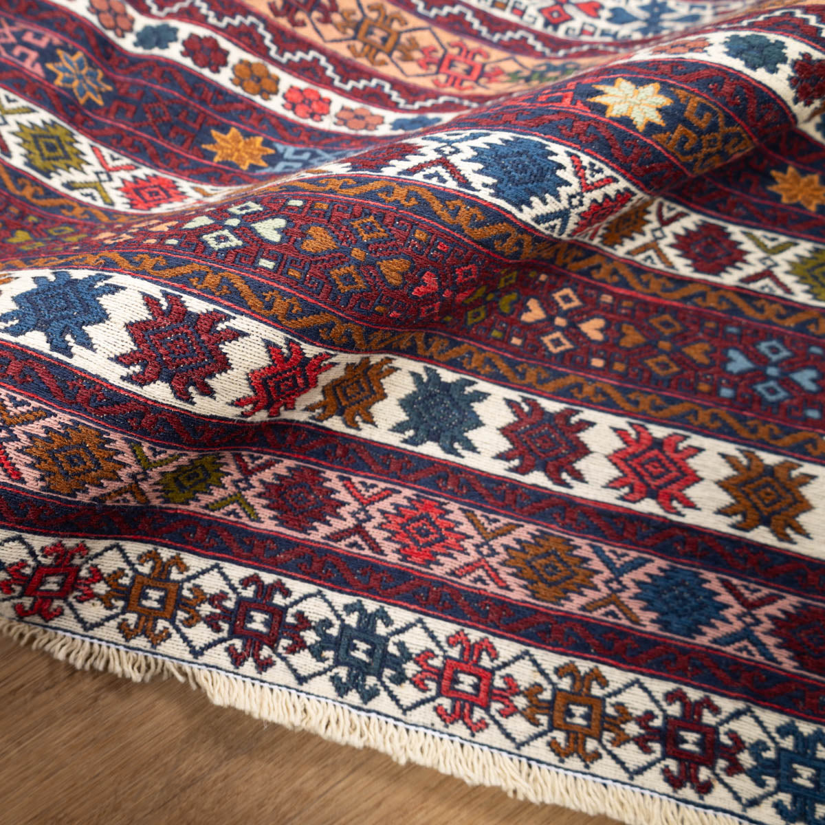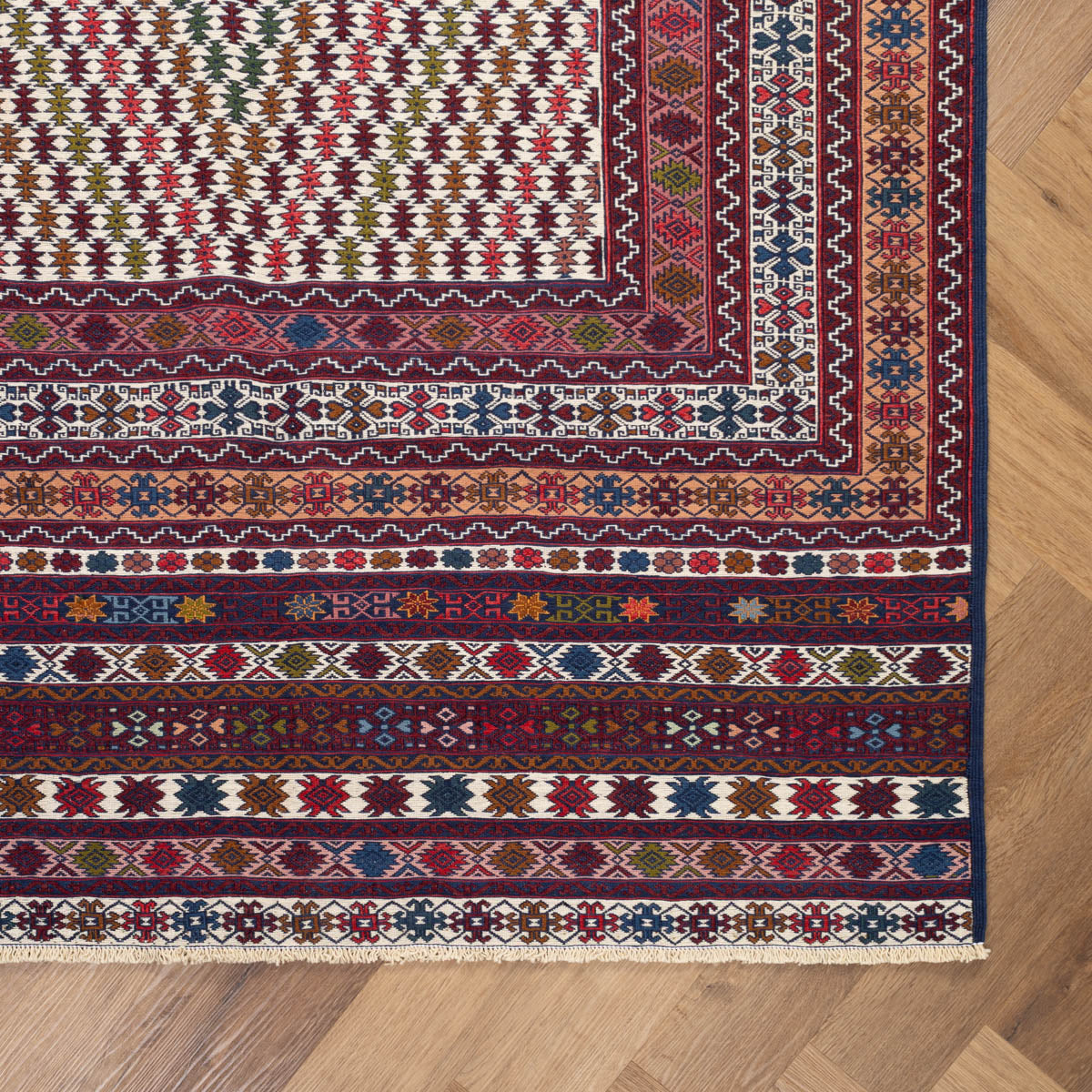 השילוב בין בורדו, כחול, ירוק, שמנת וצבעי אדמה יוצר מראה חם ועוצמתי. הדוגמה המסורתית בנויה בשכבות גיאומטריות צפופות שמדגישות את המורשת הפרסית.