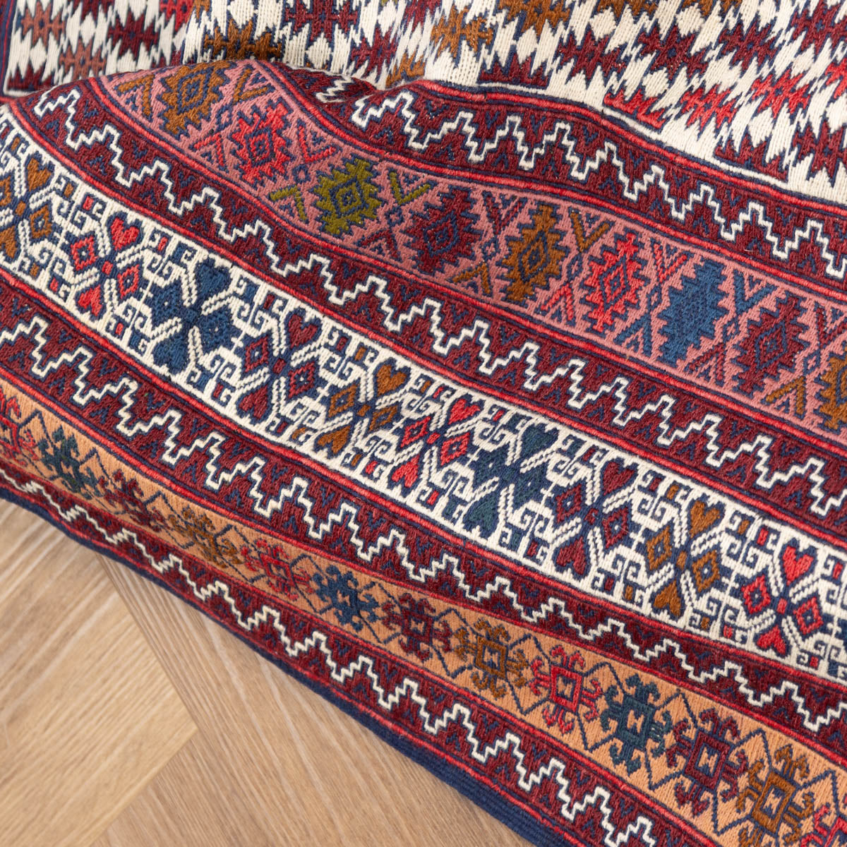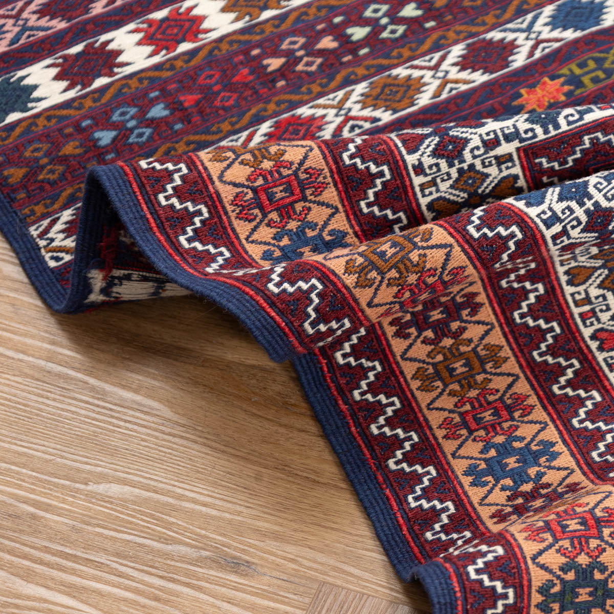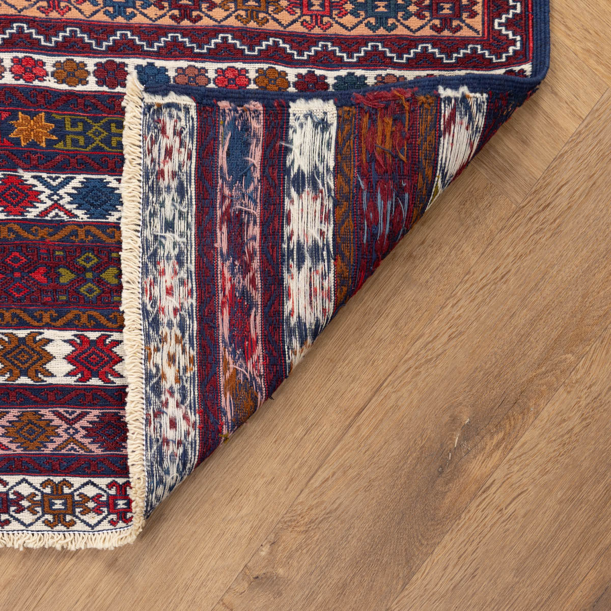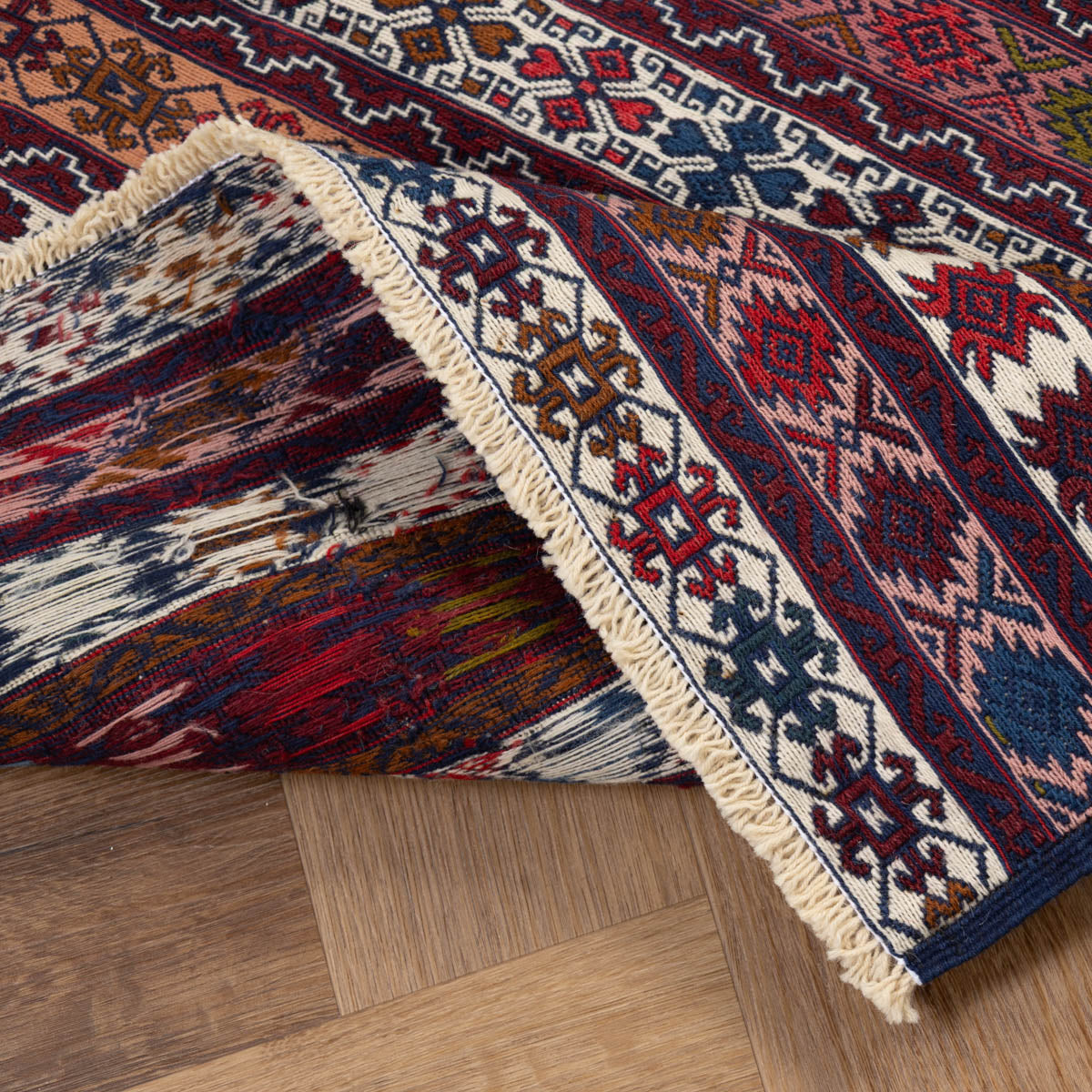 שטיח סומק פרסי בעבודת יד עם דוגמה שבטית מסורתית ועשירה בפרטים. הצבעוניות המגוונת והדוגמה הגיאומטרית יוצרים שטיח מלא עומק ואופי.