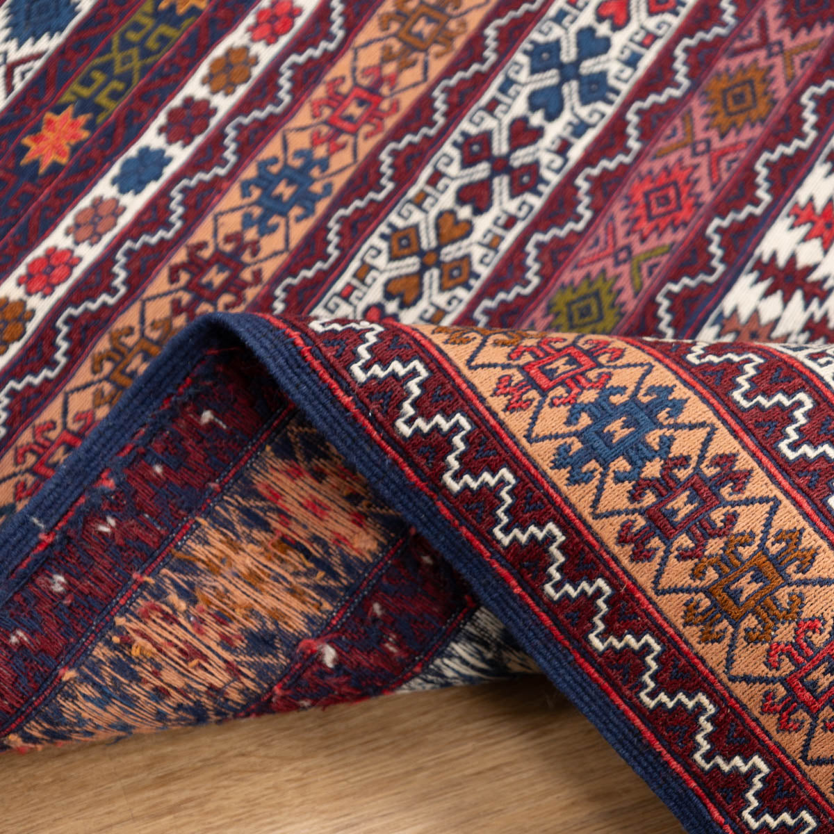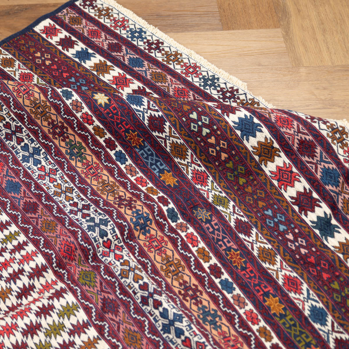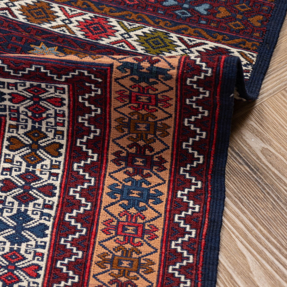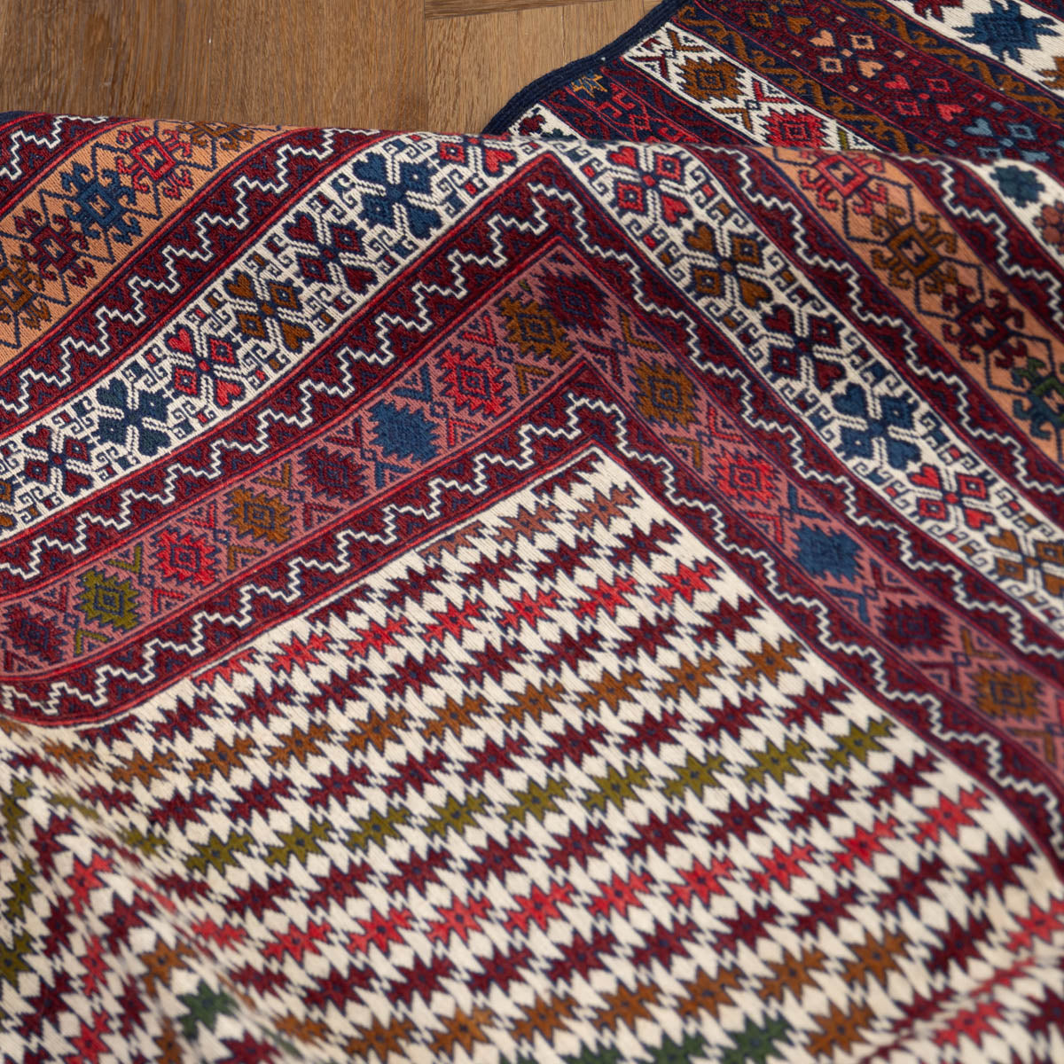 שטיח סומק פרסי בעבודת יד עם דוגמה שבטית מסורתית ועשירה בפרטים. הצבעוניות המגוונת והדוגמה הגיאומטרית יוצרים שטיח מלא עומק ואופי.