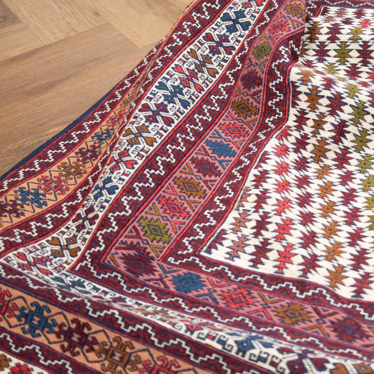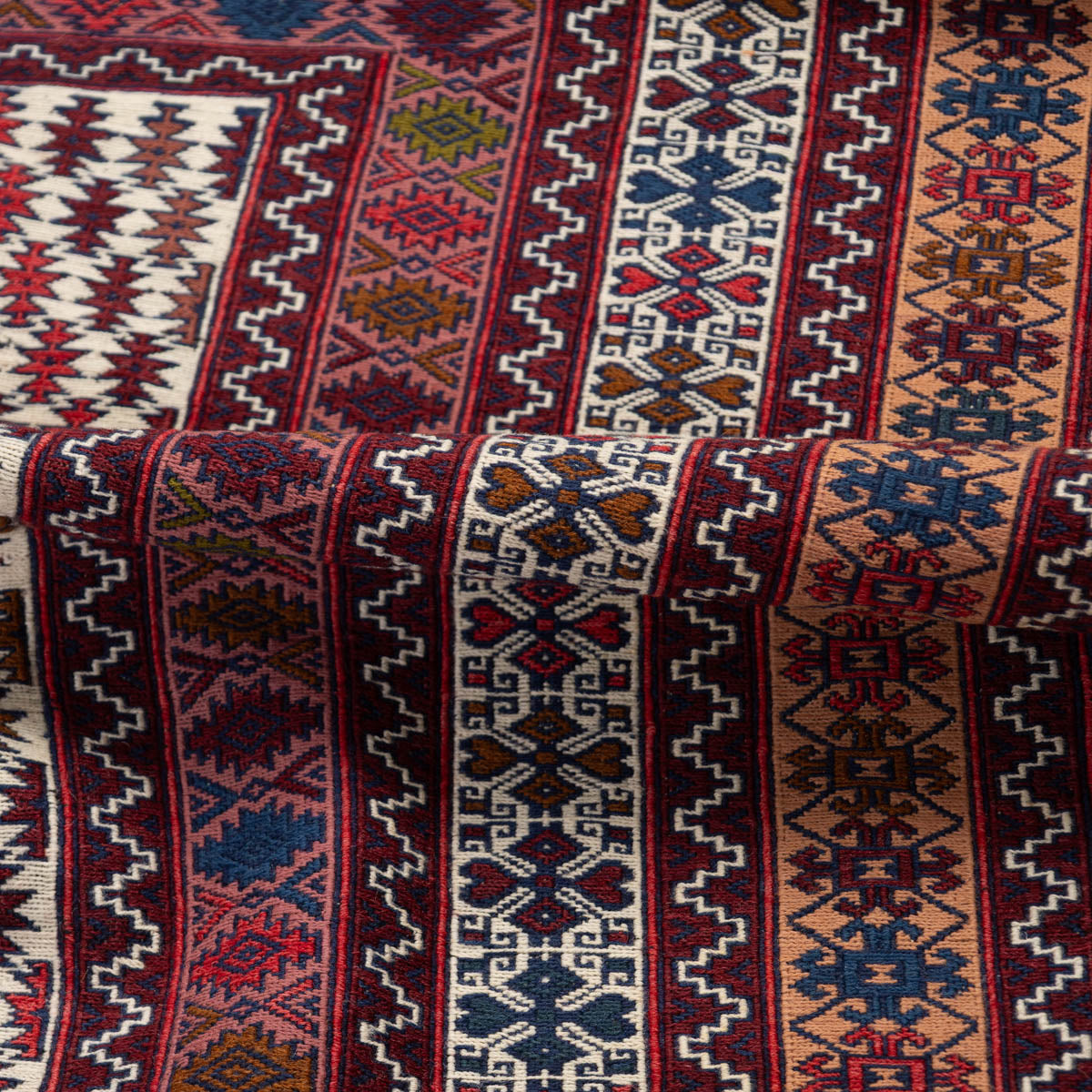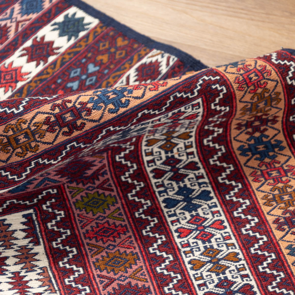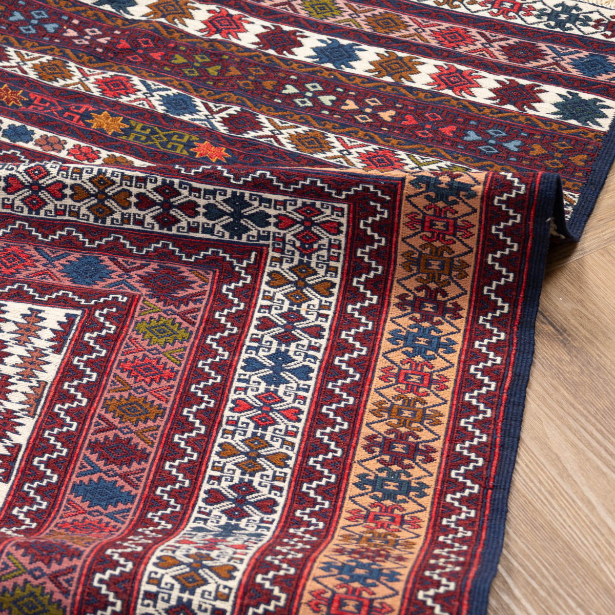 שטיח סומק פרסי בעבודת יד עם דוגמה שבטית מסורתית ועשירה בפרטים. הצבעוניות המגוונת והדוגמה הגיאומטרית יוצרים שטיח מלא עומק ואופי.