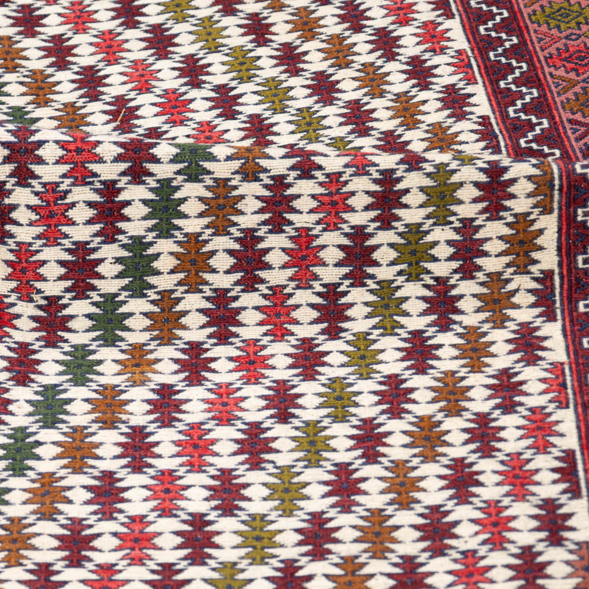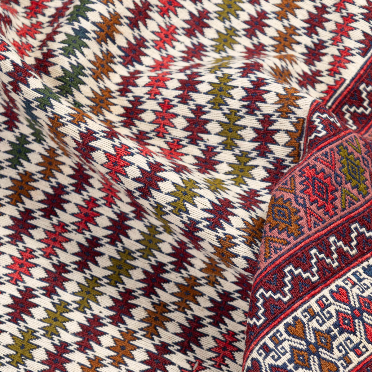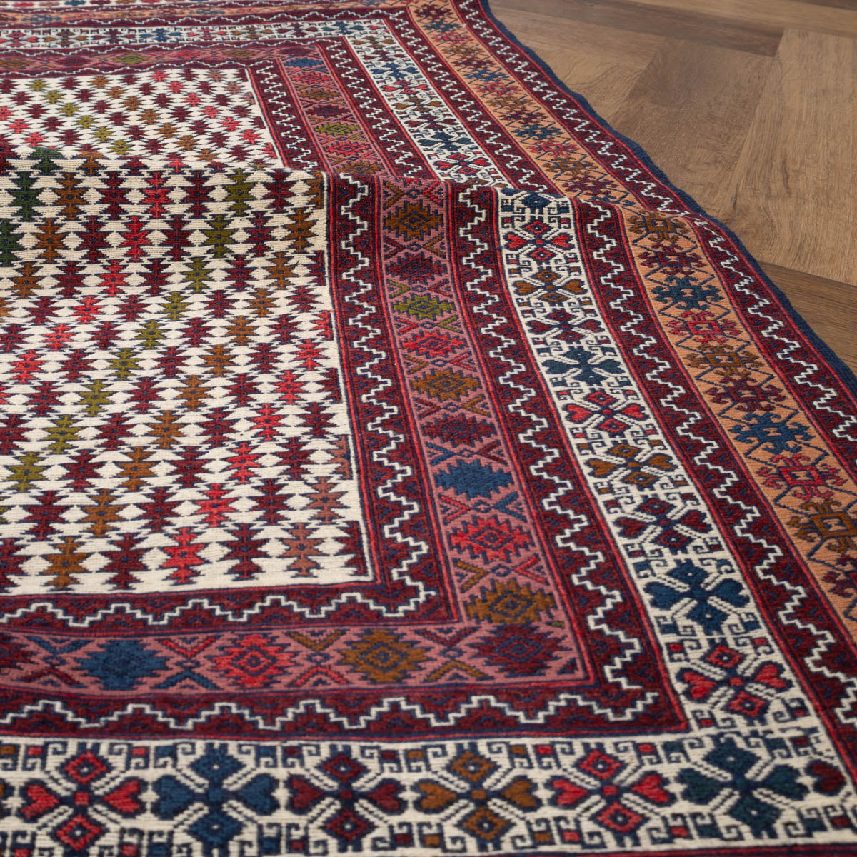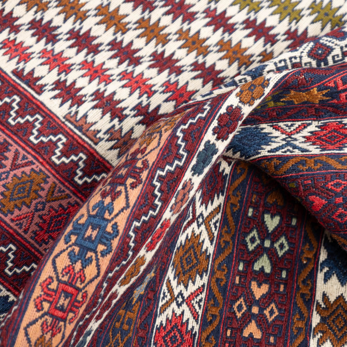 שטיח סומק פרסי בעבודת יד עם דוגמה שבטית מסורתית ועשירה בפרטים. הצבעוניות המגוונת והדוגמה הגיאומטרית יוצרים שטיח מלא עומק ואופי.