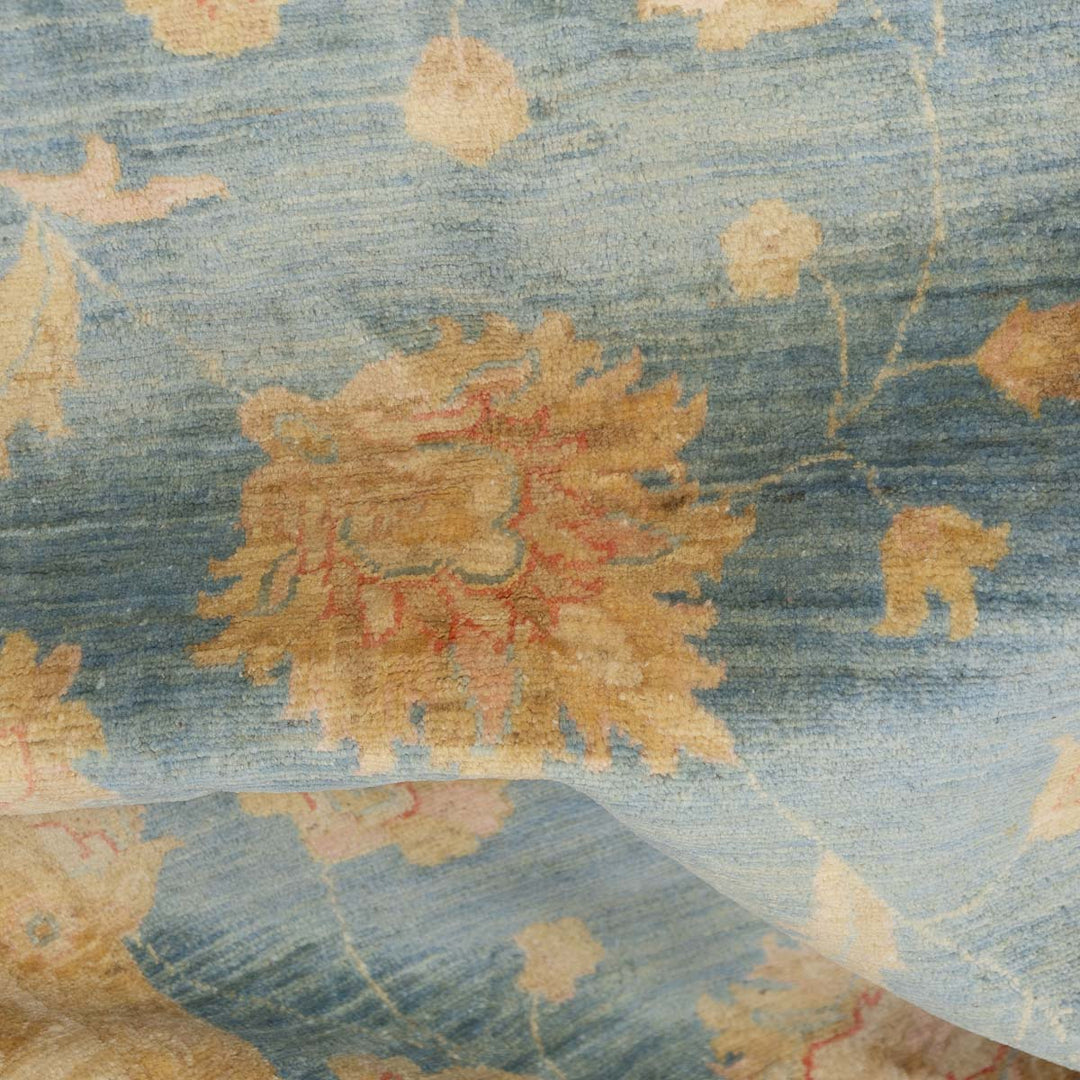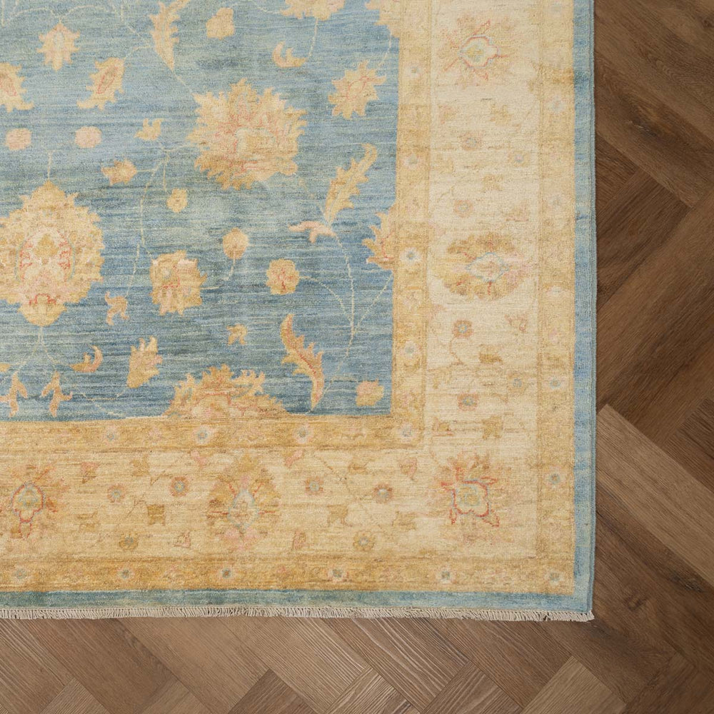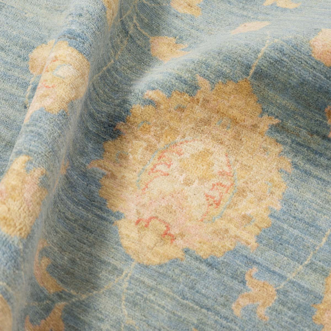 שטיח קלאסי בעבודת יד מהקטגוריה האקסקלוסיבית של סופר זיגלר – המשלב אומנות מסורתית עם צבעוניות רכה ועכשווית. רקע טורקיז מעושן ועדין פוגש עיטורים פרחוניים בגווני בז', שמנת ונגיעות אפרסק חיוור, ליצירת שטיח מרהיב ביופיו אך מאופק ונעים לעין.