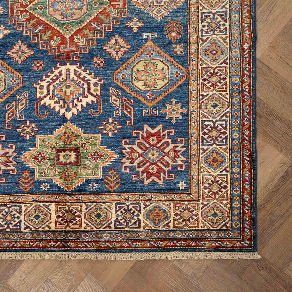 שטיח סופר קזאק 00 כחול בגודל 198x150 ס"מ הוא שטיח עבודת יד יוקרתי, המשתייך לסדרת Super Kazak הידועה באיכות הגבוהה שלה ובדוגמאות הגאומטריות המסורתיות.