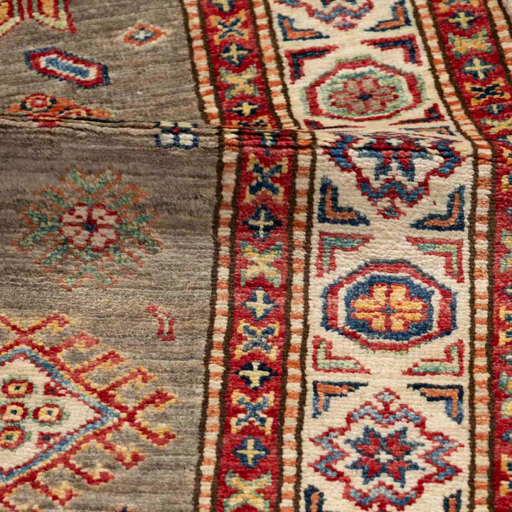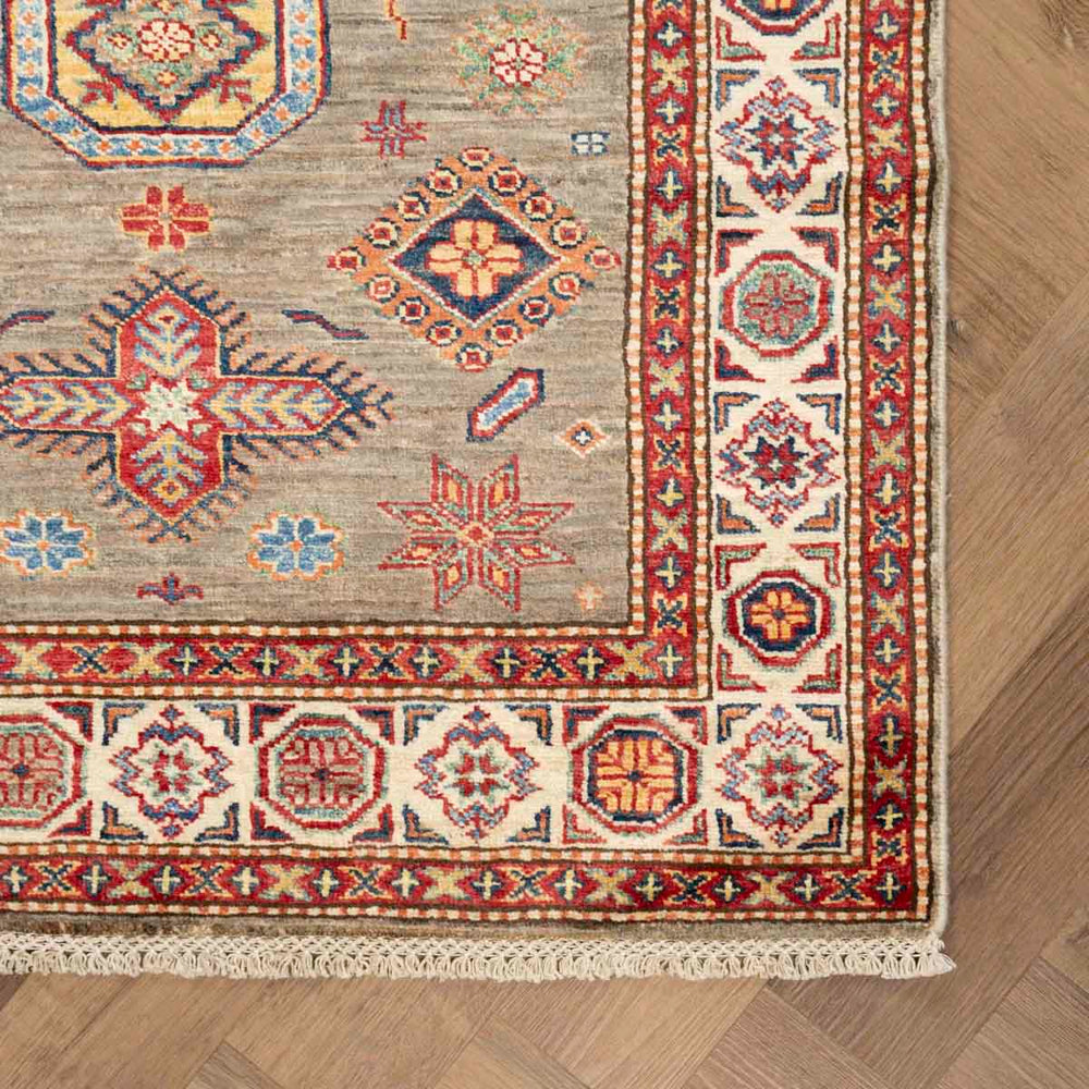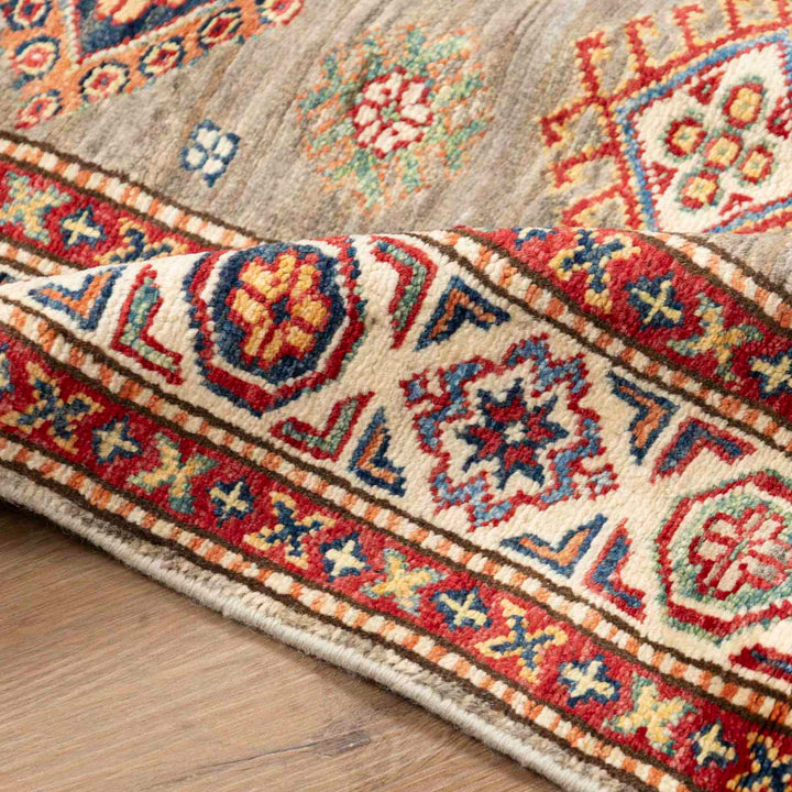 שטיח סופר קזאק ייחודי בעבודת יד, ארוג מצמר טבעי, עם עיצוב קווקזי מסורתי עשיר בפרטים ובדוגמאות גיאומטריות מדויקות. הרקע הבז'-חום משתלב בהרמוניה עם הצבעים התוססים ומכניס חמימות, עומק ואופי לכל חלל.