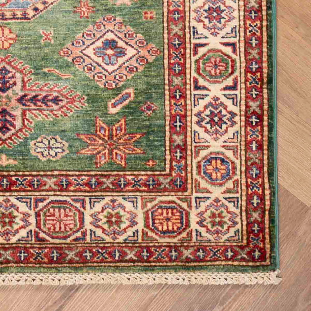 שטיח סופר קזאק מרהיב בעבודת יד, עשוי מצמר טבעי איכותי, עם עיצוב קווקזי מסורתי ועשיר בפרטים גיאומטריים. הרקע הירוק העמוק משתלב נפלא עם צבעים חמים ותוססים, ויוצר שטיח עם נוכחות יוקרתית ואופי ייחודי.