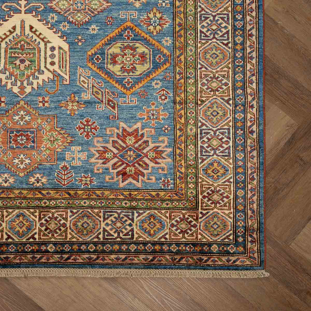 שטיח סופר קזאק בעבודת יד, יצירת אומנות אותנטית המשלבת דוגמאות גיאומטריות מסורתיות עם צבעים עשירים ונועזים. רקע כחול עז עם אלמנטים אדומים, ירוקים, לבנים וזהובים מעניקים לשטיח עומק מרהיב ואווירה חמה ומזמינה.