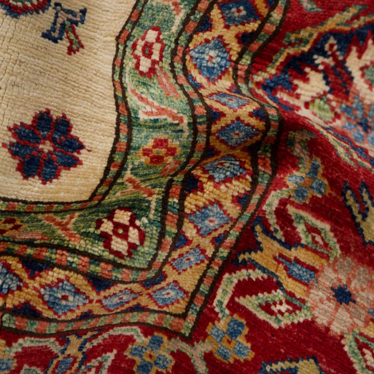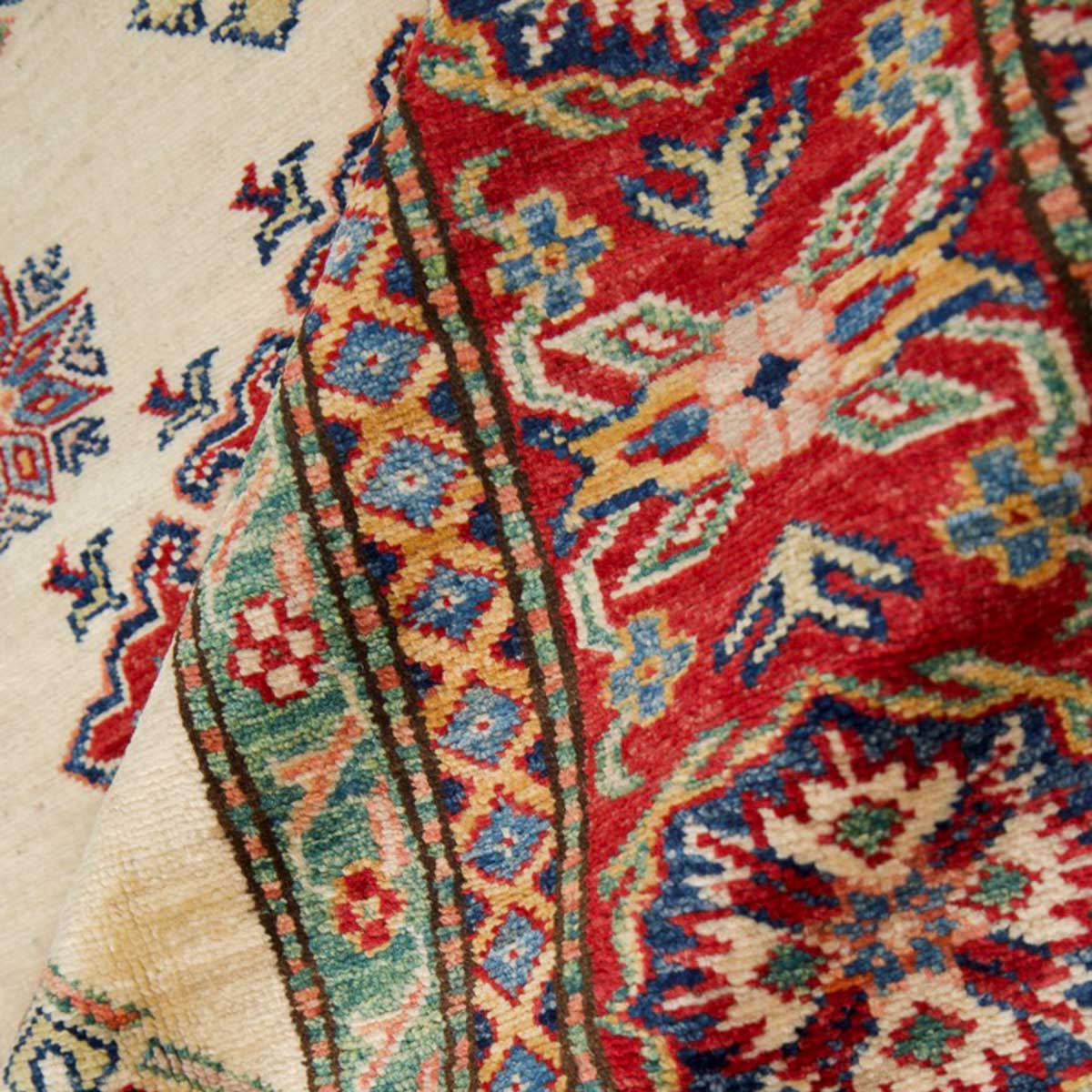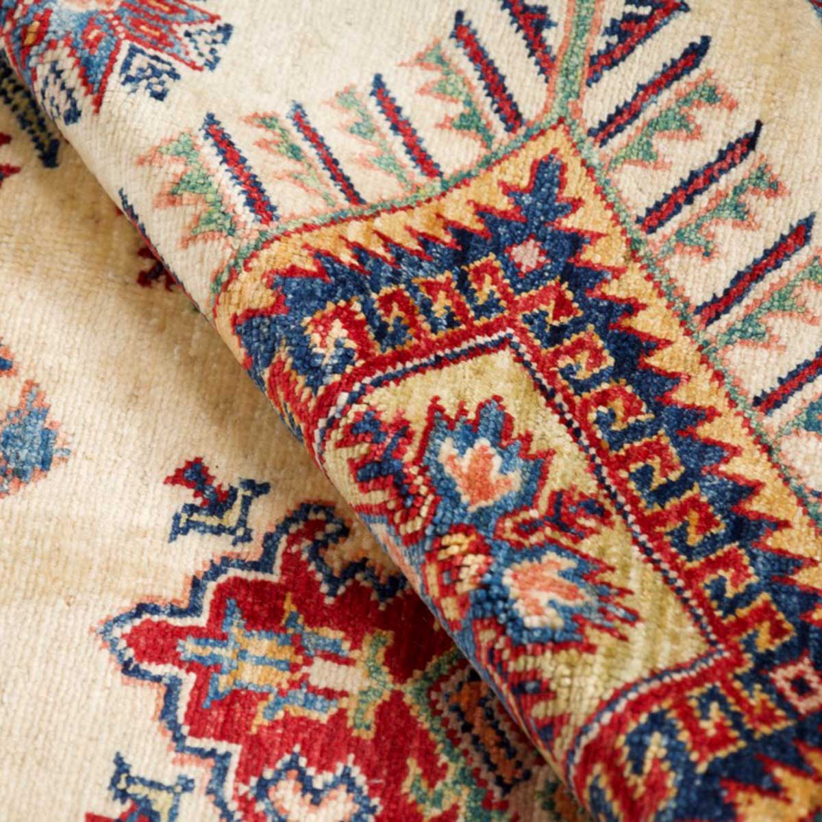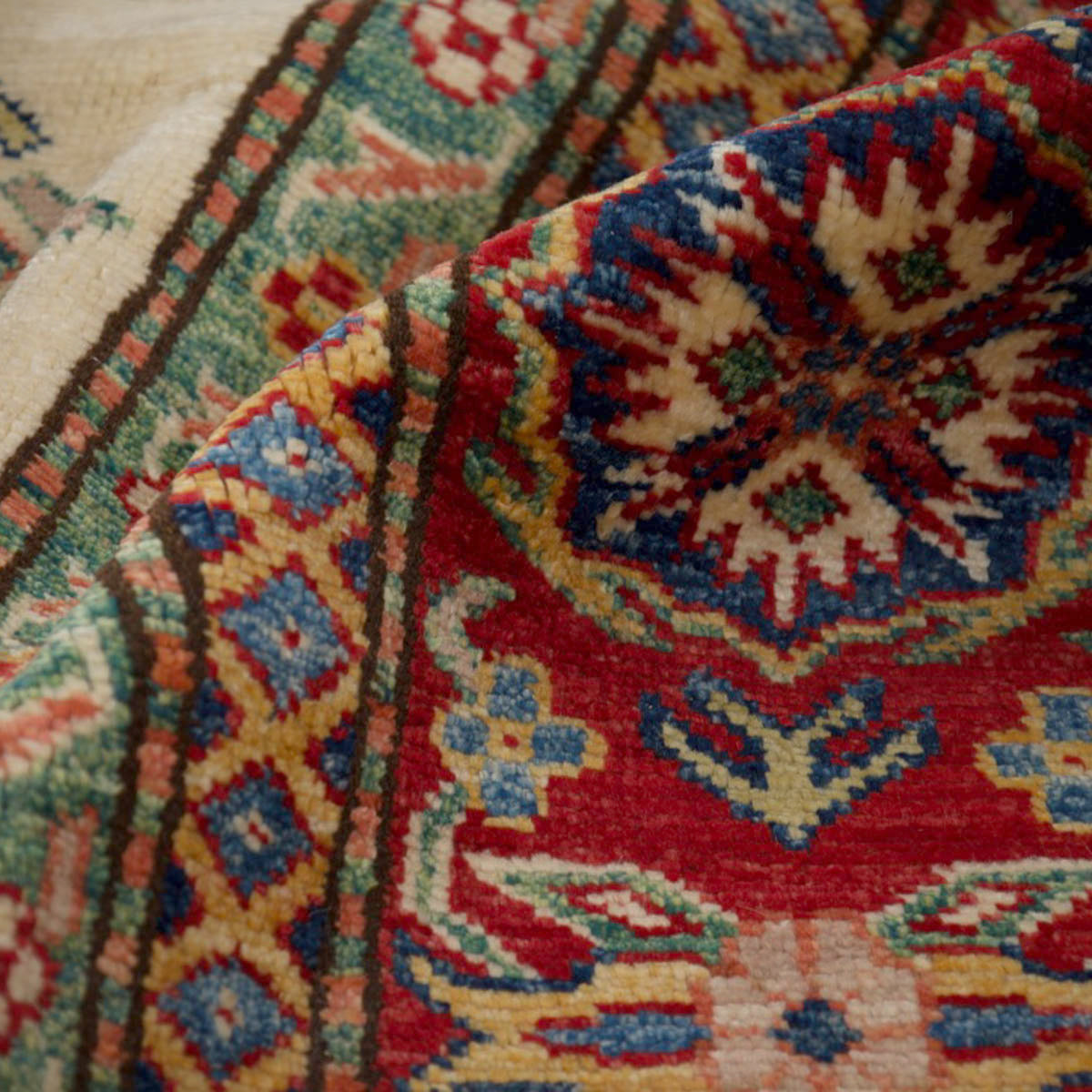 השטיח עשוי מצמר טבעי איכותי, רך וחזק, שנבחר בקפידה. דוגמת הקזאק הקלאסית משלבת אדום עמוק, כחול עז, ירוק ונגיעות זהב על רקע בהיר, בהרמוניה עשירה ומדויקת.