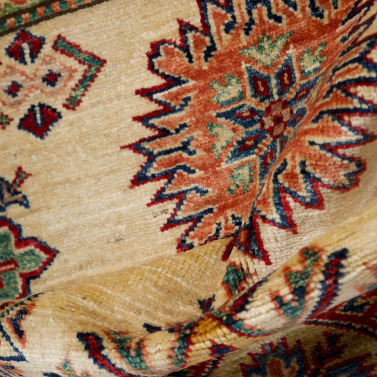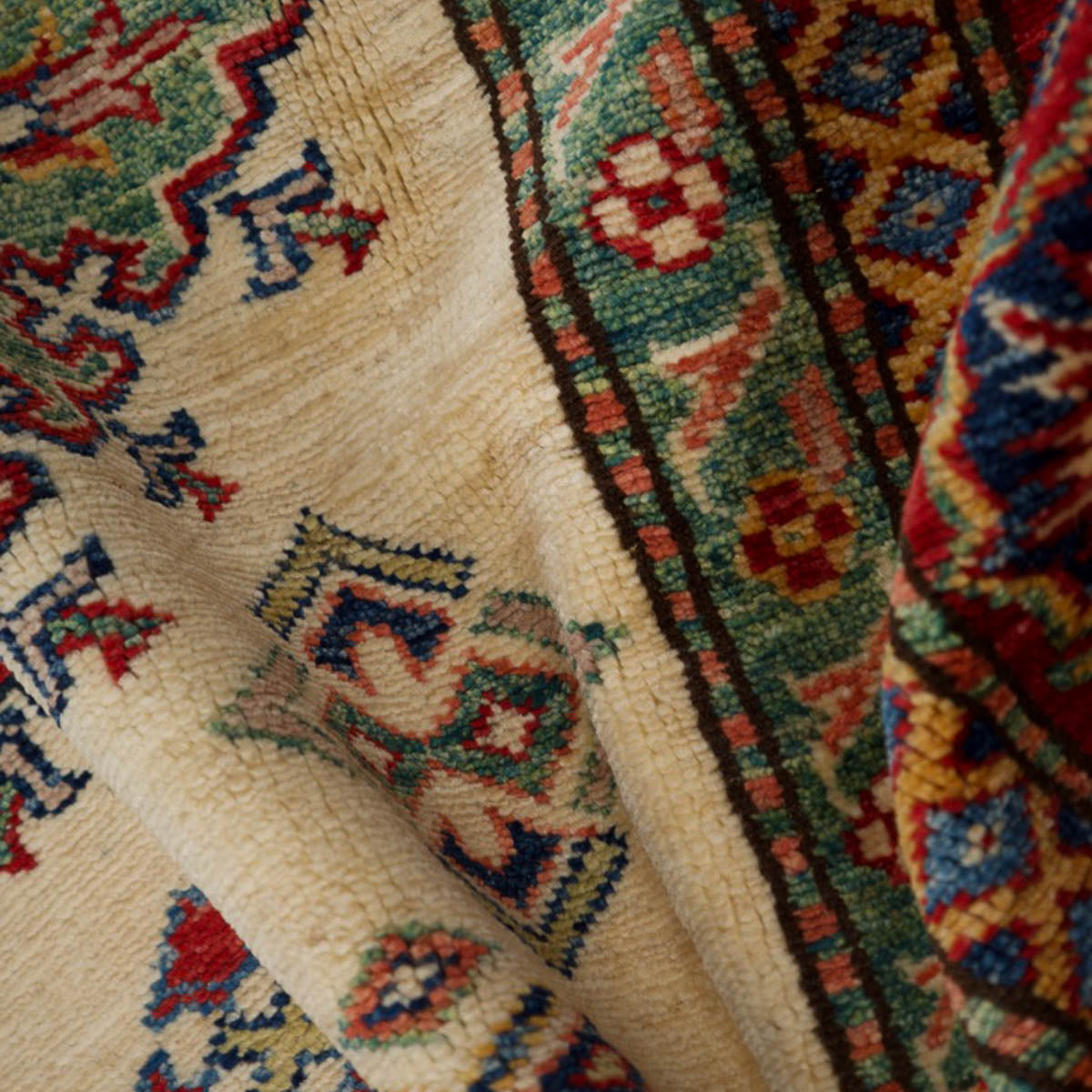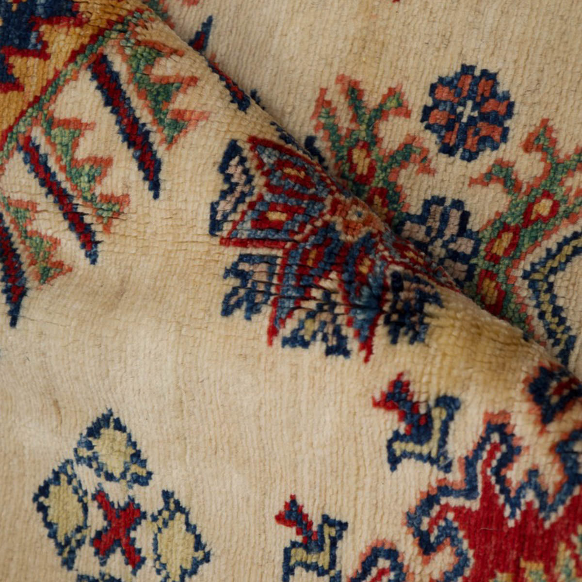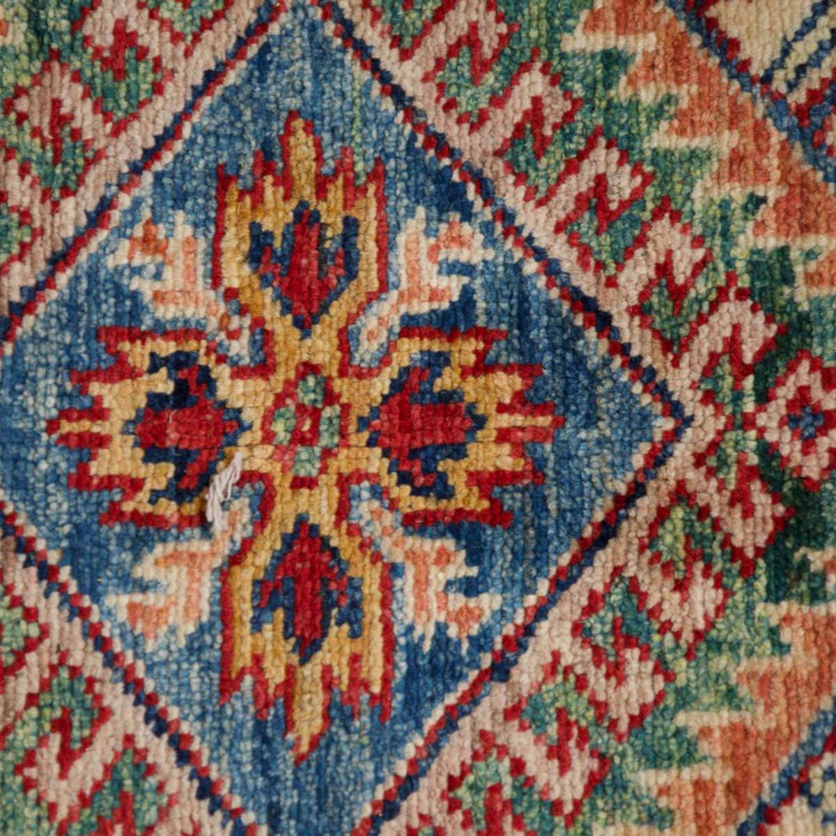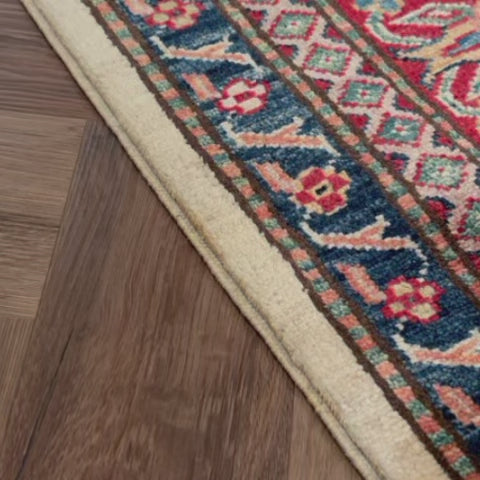 השטיח עשוי מצמר טבעי איכותי, רך וחזק, שנבחר בקפידה. דוגמת הקזאק הקלאסית משלבת אדום עמוק, כחול עז, ירוק ונגיעות זהב על רקע בהיר, בהרמוניה עשירה ומדויקת.