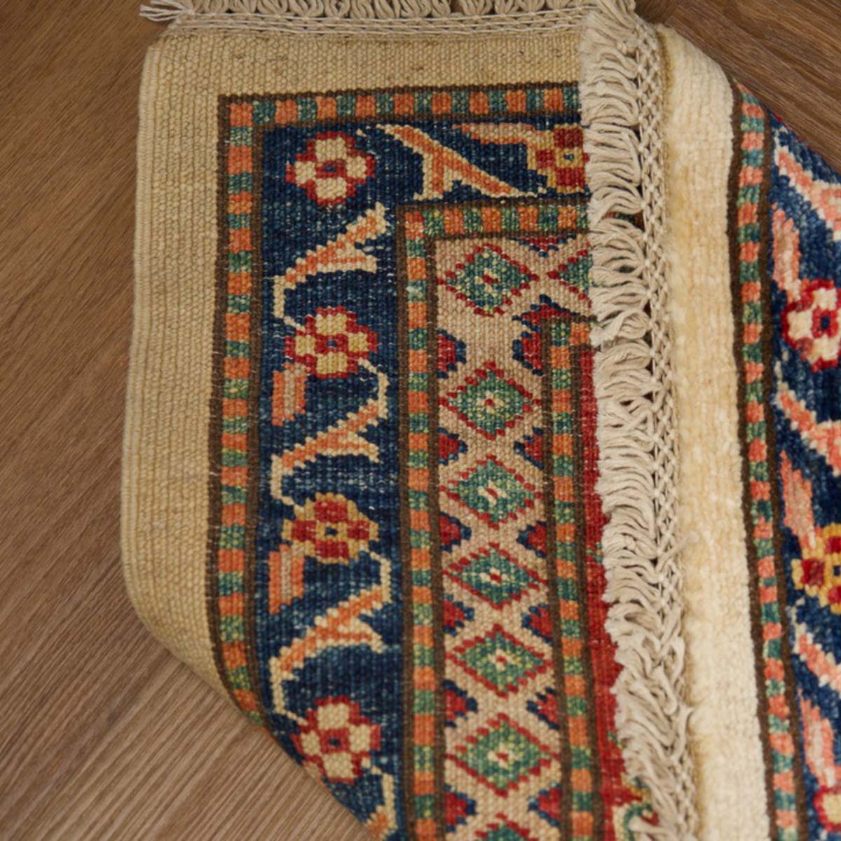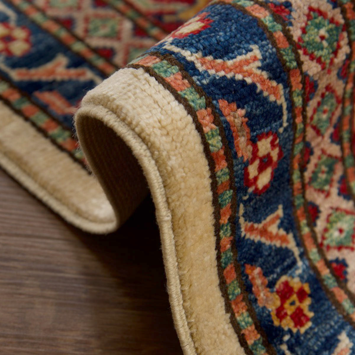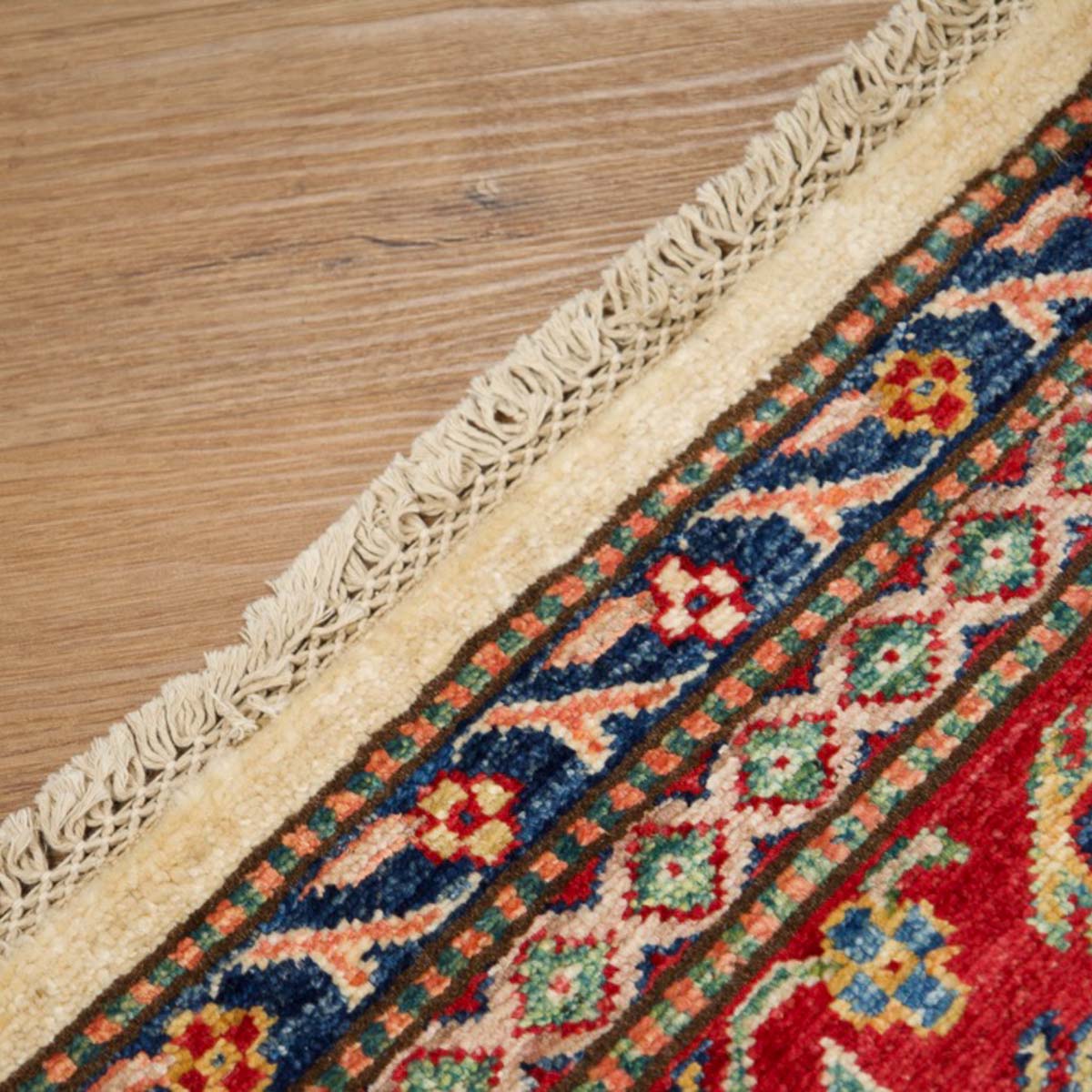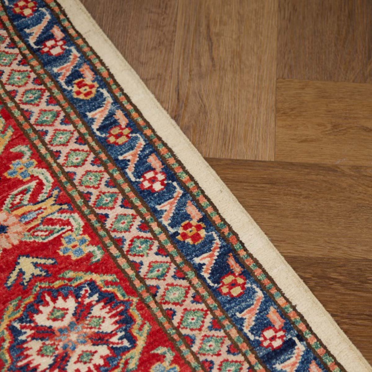השטיח עשוי מצמר טבעי איכותי, רך וחזק, שנבחר בקפידה. דוגמת הקזאק הקלאסית משלבת אדום עמוק, כחול עז, ירוק ונגיעות זהב על רקע בהיר, בהרמוניה עשירה ומדויקת.